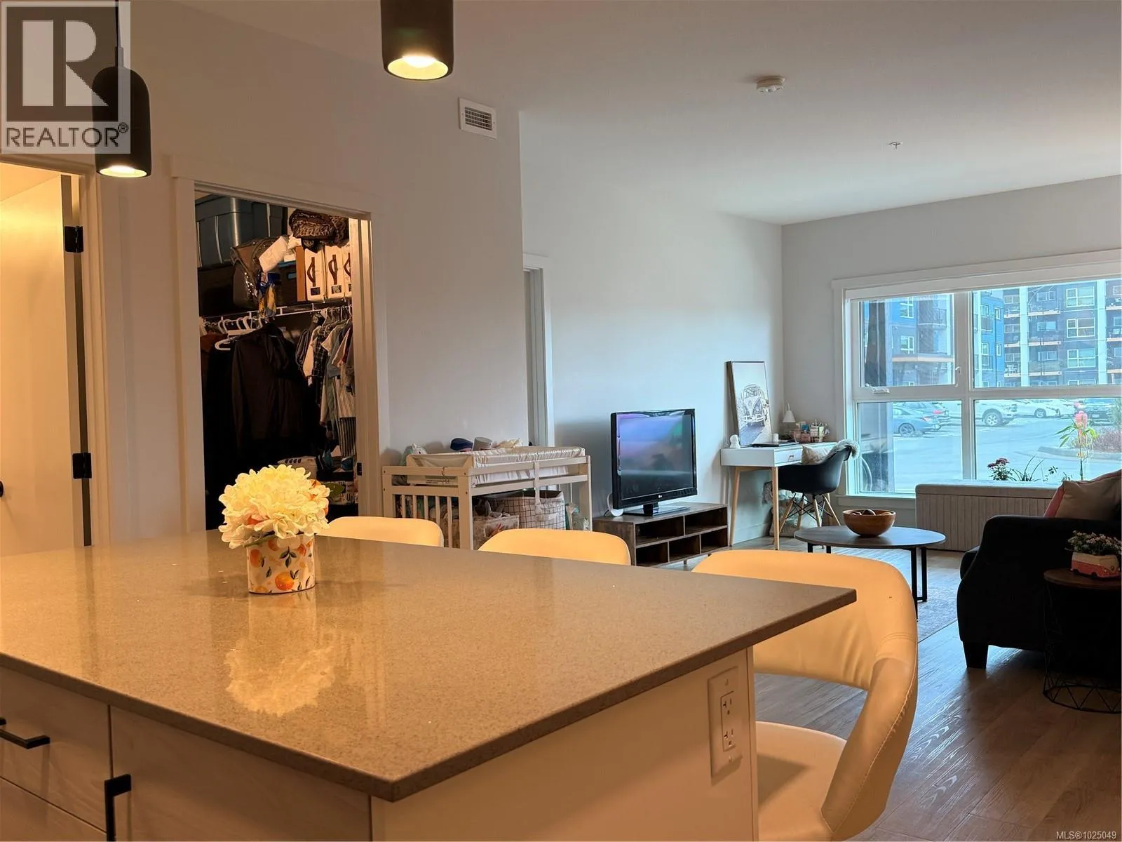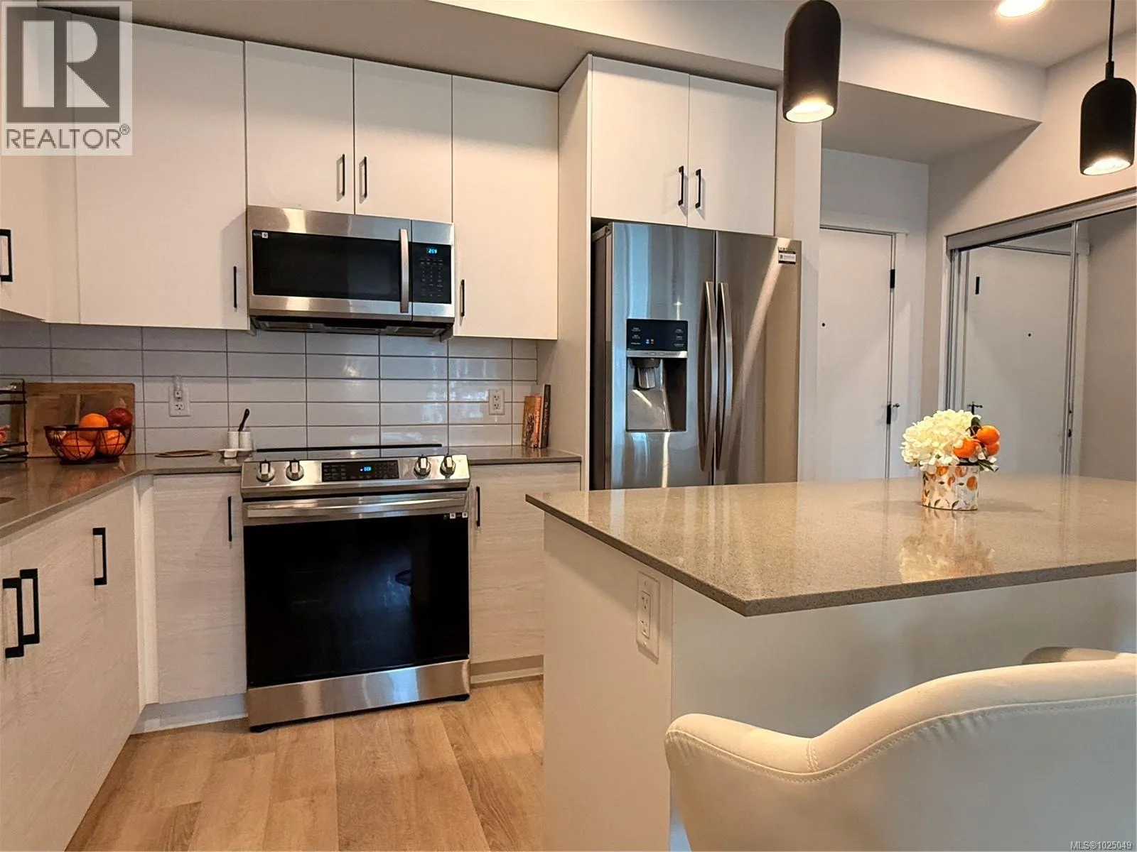 Welcome to SkyGate, a modern ground-floor 2 bed, 2 bath condo offering comfortable, low-maintenance living with easy outdoor access. This well-designed suite features luxury vinyl flooring, 9’ ceilings, LED lighting, and an energy-efficient heat pump for heating and cooling. The contemporary kitchen includes soft-close cabinetry, quartz countertops, a bright island, and stainless steel appliances, flowing into an open living space.