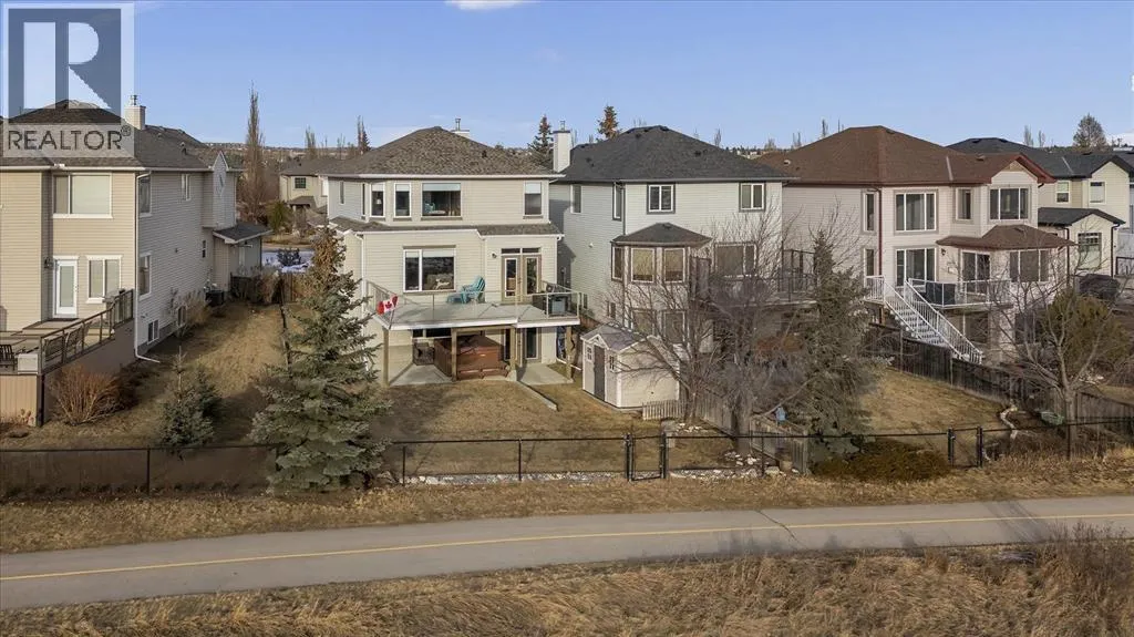 never grows old. Homes along this ridge rarely come to market, and it’s easy to understand why. A vaulted foyer sets a gracious first impression, with extensive hardwood flooring flowing through the main level. A versatile flex room near the entry invites use as a den or intimate formal dining space. As you move toward the rear of the home, the floor plan opens up and that remarkable view commands your attention through expansive rear windows. The family room, warmed by a fireplace, frames the vista beautifully, while the kitchen stands ready for both everyday life and entertaining – rich maple cabinetry with under-cabinet lighting, granite countertops, a tiered island, and stainless steel appliances. A well-appointed main-floor mudroom keeps the household running smoothly with laundry facilities, built-in cabinetry, a folding counter, and laundry sink. Upstairs, a small loft overlooks the entry below – an ideal spot for a reading nook, homework station, or quiet workspace. The staircase splits to reveal thoughtfully separated sleeping quarters: a spacious secondary bedroom to one side, and on the other, a second secondary bedroom, full family bathroom, and the primary suite. Waking up to those mountain and city views from the primary bedroom is something truly special. The ensuite features dual sinks, a soaker tub, and separate shower, complemented by a walk-in closet. The walkout basement extends the living space with a large recreation room anchored by a gas wood stove, plus a bathroom featuring an oversized shower – perfectly suited for guests or post-hot tub evenings. Step outside and the backyard becomes your retreat: a hot tub with convenient hot water tap, patio, perennial gardens, an irrigation system, and storage shed. A gate opens directly onto the pathway system winding throughout Tuscany, inviting you to explore the coulee at your doorstep. Central air conditioning ensures comfort through summer, and a newer roof provides peace of mind. With a park and playground just steps away, this ridge-backing home on a quiet street delivers a lifestyle that families dream about – where stunning views, thoughtful design, and neighbourhood connectivity come together in one exceptional Tuscany address. (id:62650)