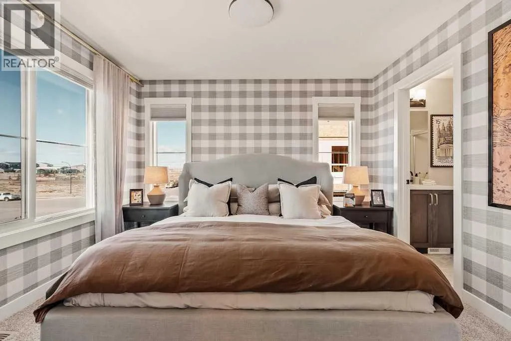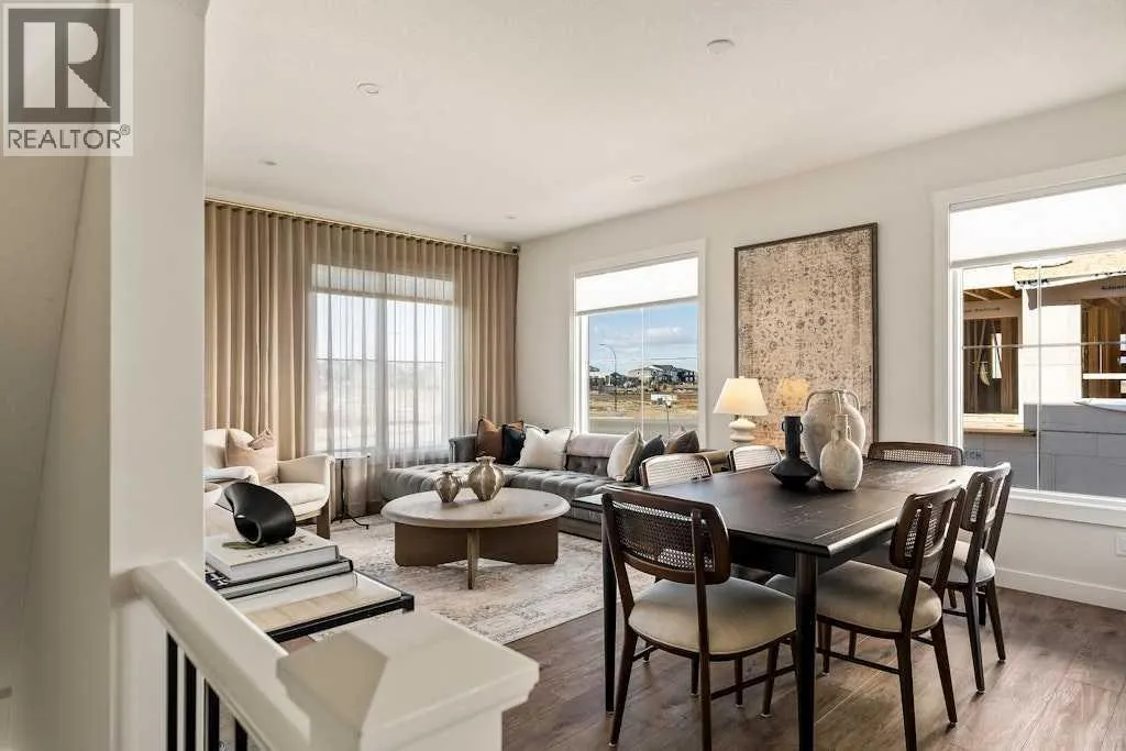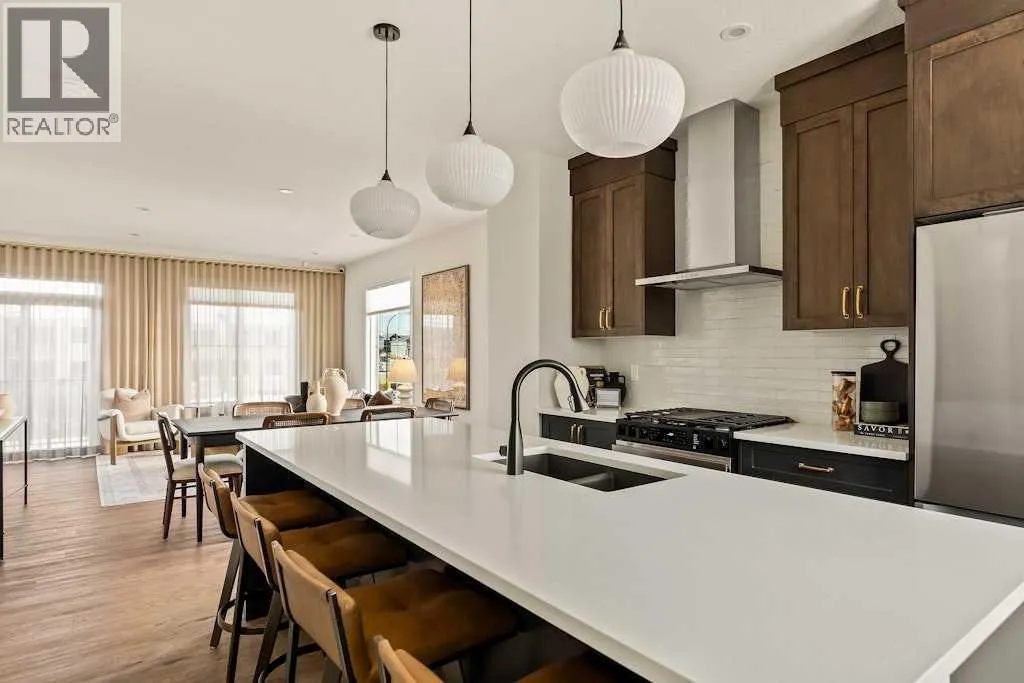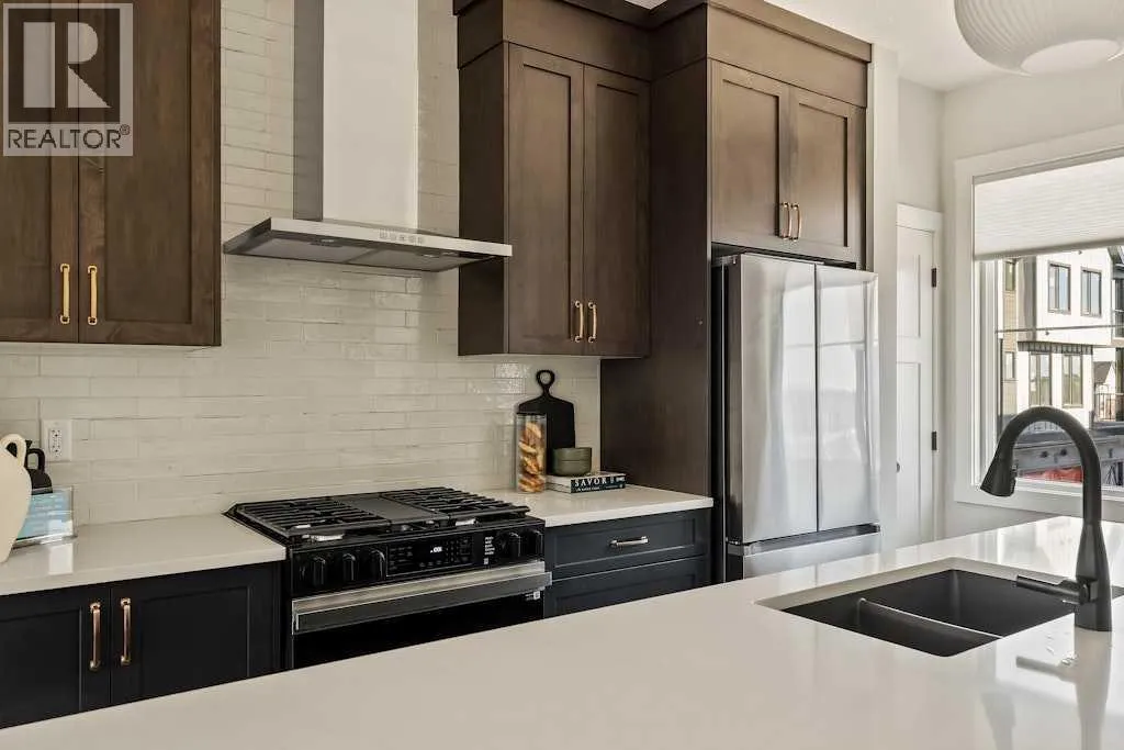 open-concept main floor showcases a timeless kitchen featuring full-height cabinetry, elegant quartz countertops, a built-in hood fan and microwave, and a premium stainless-steel appliance package. The oversized island with pendant lighting provides the perfect place for casual dining or entertaining. The kitchen flows seamlessly into the bright living and dining areas, highlighted by a wall of windows that flood the space with natural light. Enjoy extra windows and additional natural light – a perk of owning the end-unit townhome! Step out onto your private East-facing balcony overlooking the green space – ideal for summer BBQs or a morning coffee while providing optimal sunshine all year long. A large laundry room with additional storage and a convenient 2-piece powder room complete the main level. The upper level features a spacious ~11’ x 12’ primary suite which includes a walk-in closet and a private ensuite with walk-in shower, offering a relaxing retreat at the end of the day. Two additional bedrooms and a full bathroom complete the upper floor, providing plenty of room for family, guests, or a home office. On the lower level, a versatile den off the entryway and private double attached garage offers endless flexibility – the perfect space for a home office, gym, or creative space. The private double attached garage keeps your vehicles warm and secure all year long. This home includes numerous upgrades such as central A/C rough-in, a BBQ gas line + gas line to the kitchen range, 42” upper cabinets, and an enhanced interior selections package. Backed by both Brookfield’s comprehensive builder warranty and Alberta New Home Warranty, this property offers complete peace of mind. Set in Livingston, a dynamic north Calgary community known for its impressive Homeowners Association, state-of-the-art Hub facility, parks, playgrounds, and convenient access to major routes – this is the perfect place to call home. If you’re looking for a low-maintenance townhome that combines style, functionality, and quality craftsmanship – welcome to the Holiday by Brookfield Residential in Livingston. *Please note: Photos are for representation purposes only, and exact finishes may vary. (id:62650)
