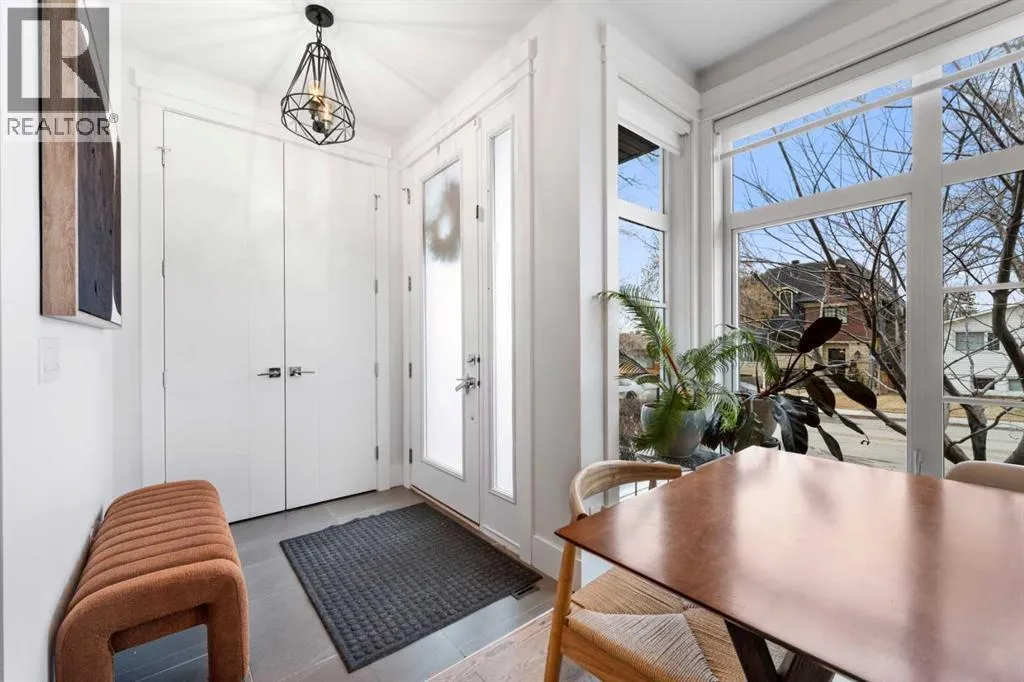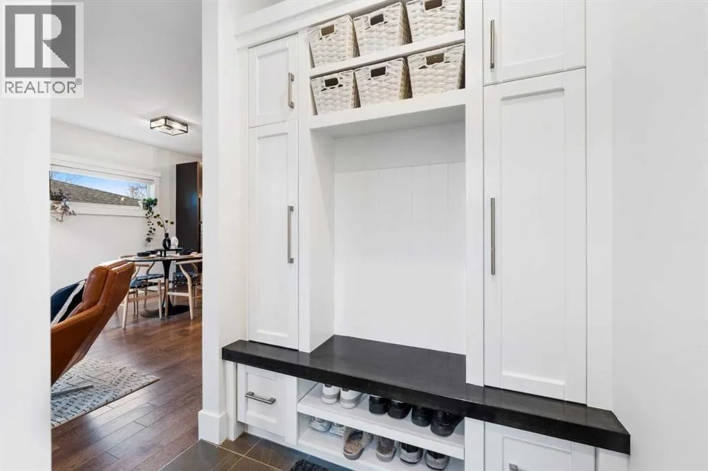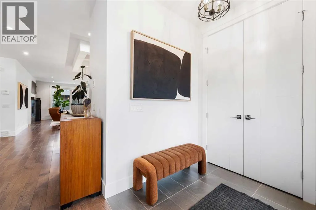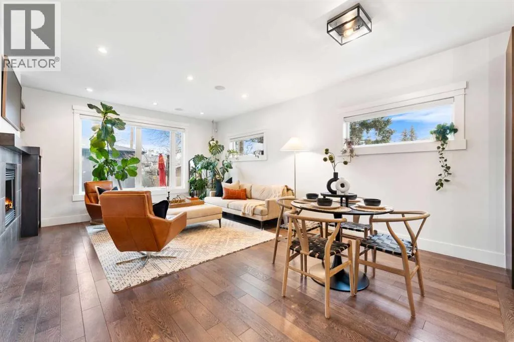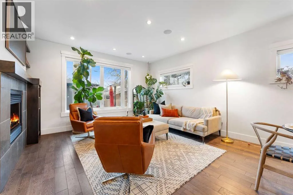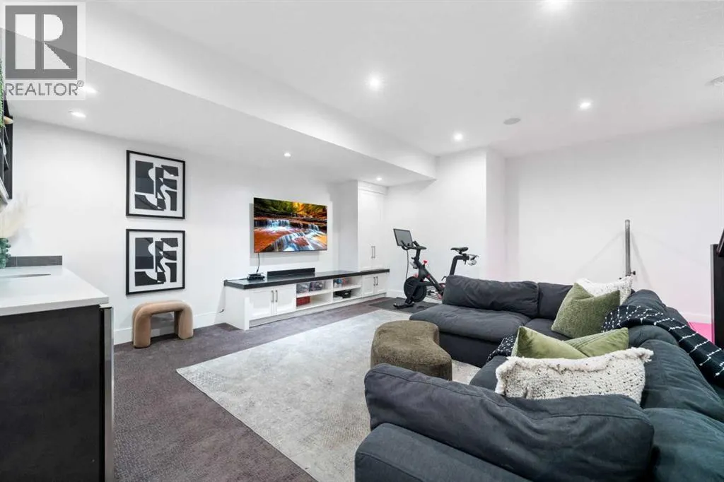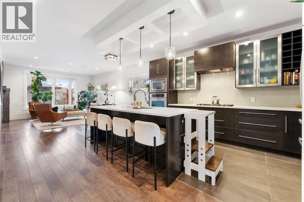 by expansive windows, soaring 9’ flat painted ceilings on every floor, and an abundance of pot lights. The gourmet kitchen is a chef’s dream, showcasing quartz countertops throughout, a massive island, loads of drawer storage, sleek custom cabinetry, stainless steel appliances, and a gas range—perfect for both entertaining and daily living. On one side the spacious dining area and the other a cozy yet sophisticated living room, anchored by a striking gas fireplace with custom built-ins. A separate mudroom and stylish powder room complete the main floor. Upstairs, the primary retreat is a true sanctuary, spacious enough for a king-sized bed and featuring a boutique-hotel-inspired ensuite with double vanities, a soaker tub, an oversized glass steam shower, in-floor heating and a custom walk-in closet with built-in organizers. Two additional generously sized bedrooms—one with a custom built-in desk—are complemented by a beautifully appointed full bathroom and convenient upper-floor laundry. The fully finished lower level expands your living space with an additional bedroom and full bathroom, plus a large family room complete with a wet bar, beverage fridge, custom entertainment unit, and room for a home gym, movie nights, or hosting guests. In-floor heating ensures year-round comfort. Superior finishes throughout include stunning wide-plank hardwood flooring, while thoughtful upgrades such as a home audio system with built-in speakers and irrigation add everyday ease. The double detached garage features 10’ ceilings for extra storage potential and an 8’ high doo r for easy access. Designed for effortless indoor-outdoor living, the home opens to a private, low-maintenance fenced backyard—ideal for BBQs, lounging, or dining al fresco on the concrete patio through expansive glass patio doors. Perfectly situated in desirable Killarney, just steps from Holy Name School, one block from a green space and park, and minutes to trendy cafés, boutique shopping, downtown, and the C-Train. This is the ultimate executive home for those seeking luxury, style, and a truly effortless urban lifestyle. (id:62650)