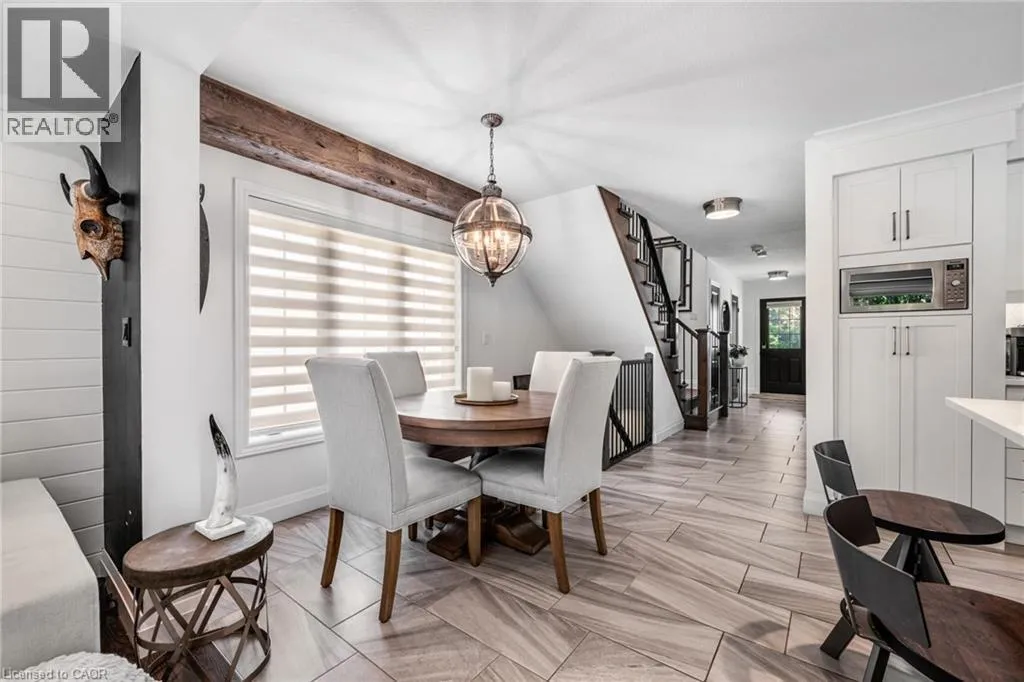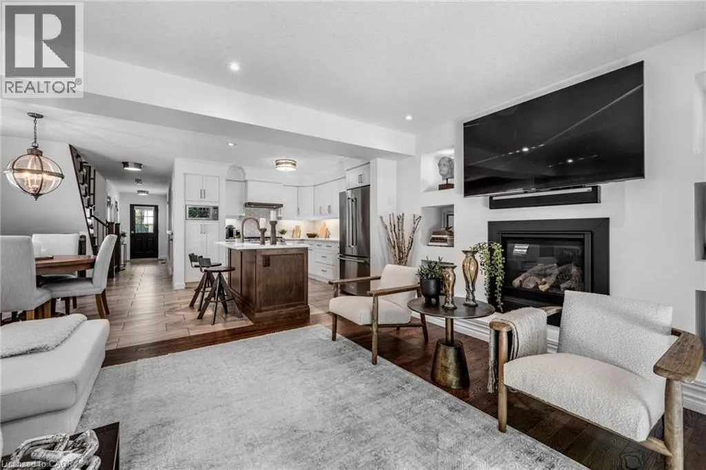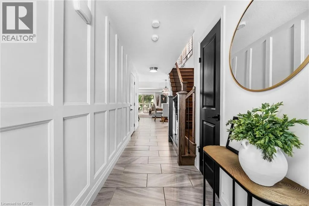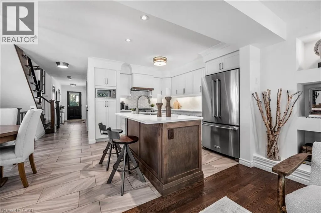 SAGINAW WOODS EXECUTIVE TOWNHOME! Tucked into a family-friendly neighbourhood celebrated for its excellent schools, walking paths, bike lanes, and quick 401 access. Step inside and you’ll immediately feel the attention to detail. The entryway sets the tone with custom wainscoting and upgraded tile, leading you into an open main floor designed for connection. The kitchen is a showpiece, featuring lacquer