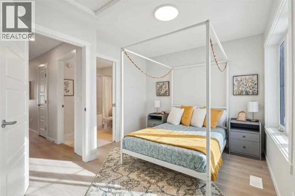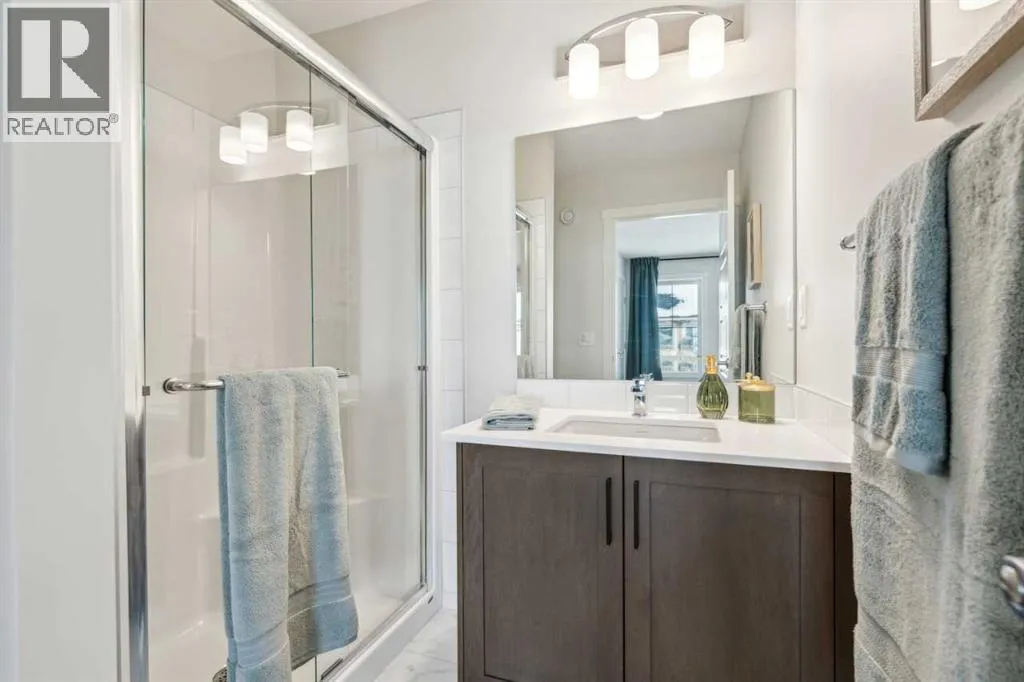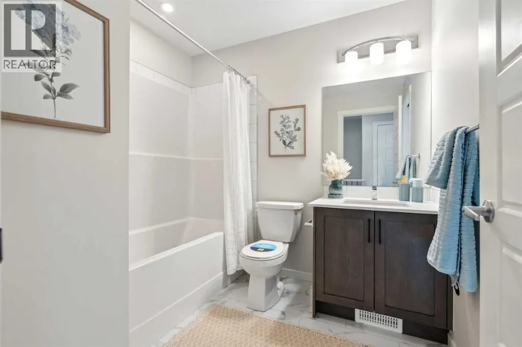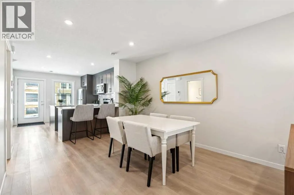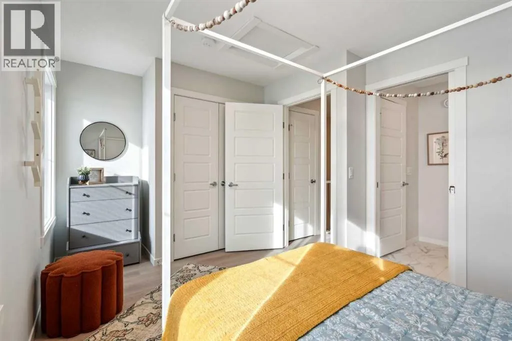 Welcome to Ambrosia, a beautifully designed 2-bedroom, 2.5-bath, two-storey stacked townhome in the scenic community of Crimson Ridge. Take in stunning views of the Bow Valley River, Downtown Calgary, and Canada Olympic Park, with a golf course just steps from your door. The open-concept main floor is perfect for entertaining, featuring a spacious kitchen island and luxury vinyl plank flooring