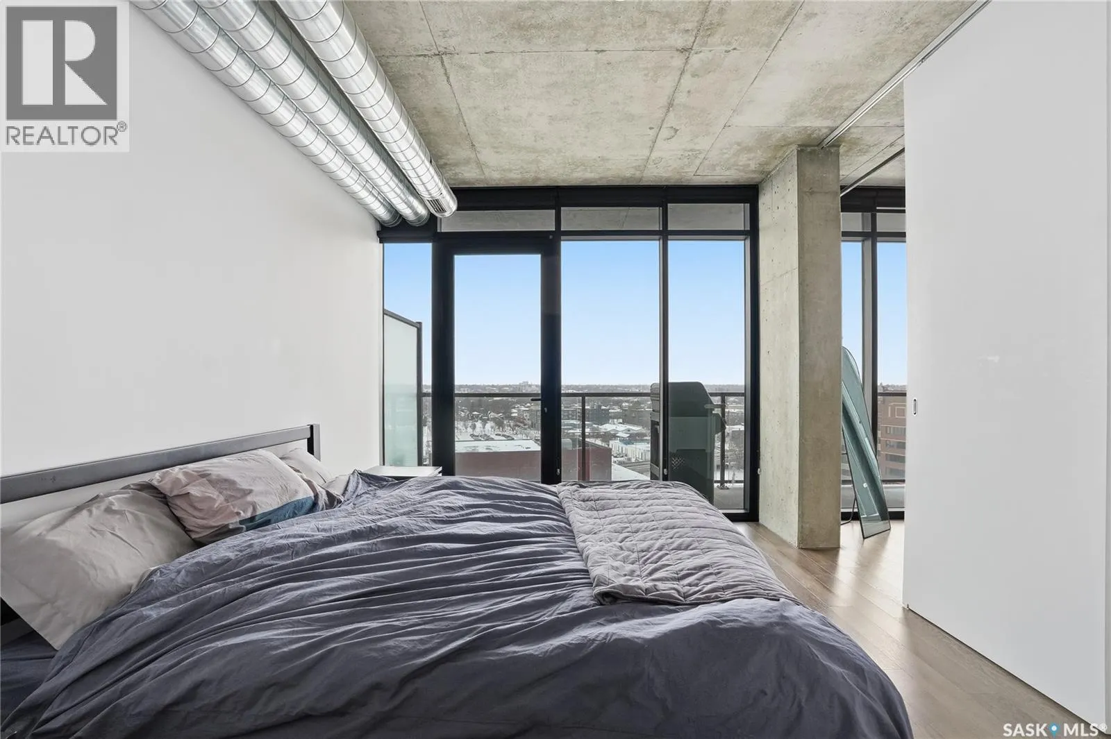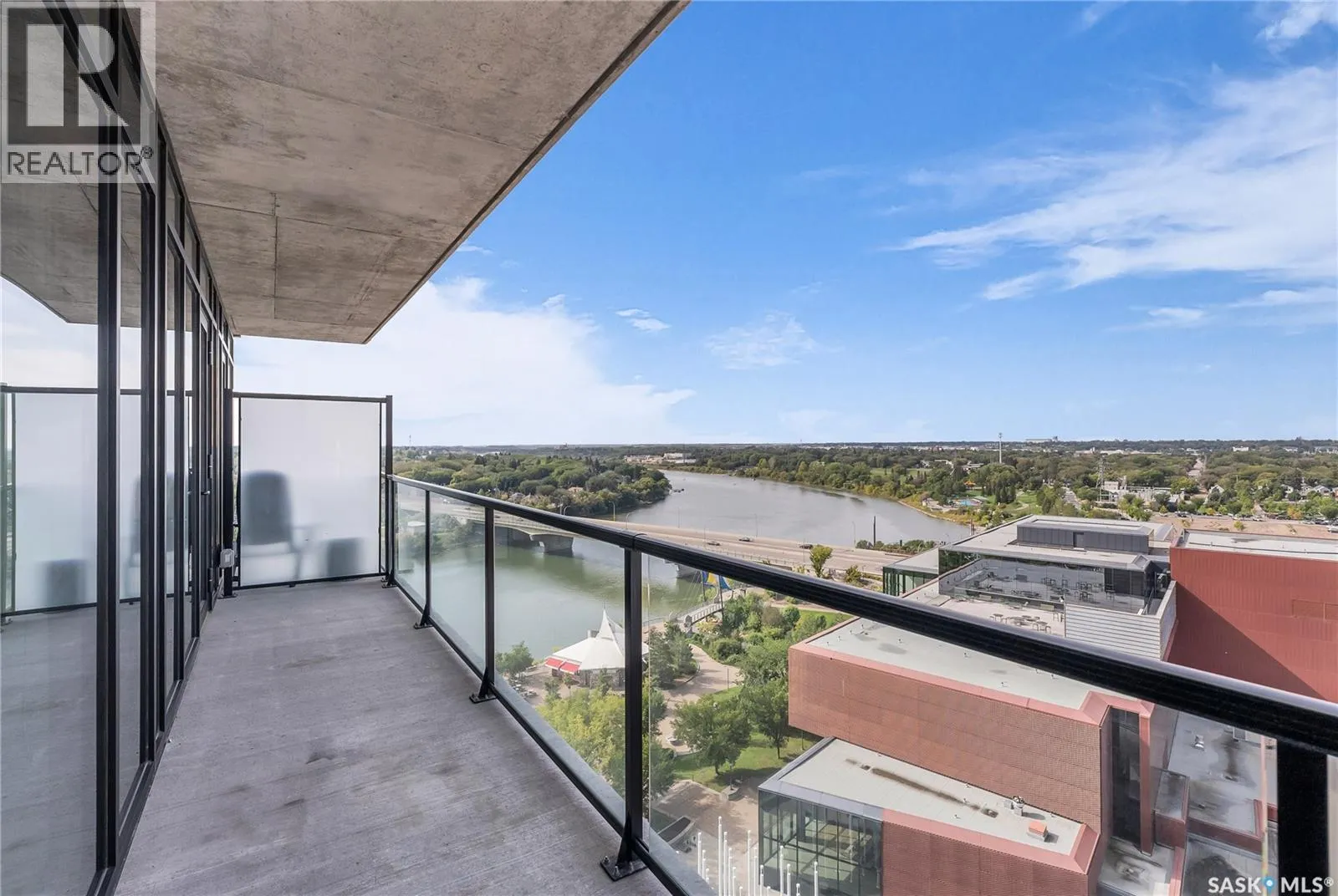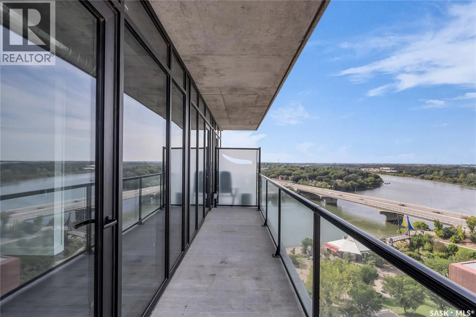 Stunning 13th floor unit at No. 1 River Landing, featuring an expansive view of Saskatoon’s downtown, River Landing Park and the South Saskatchewan River. Great layout with 9 ft concrete ceilings, kitchen with quartz counters and stainless steel appliances, 2 bedrooms + den and two bathrooms. Primary bedroom has direct access to the balcony and features a walk-thru closet open