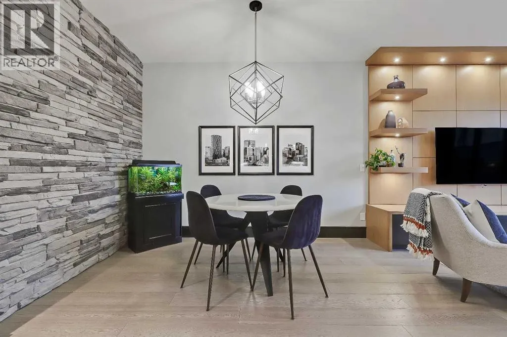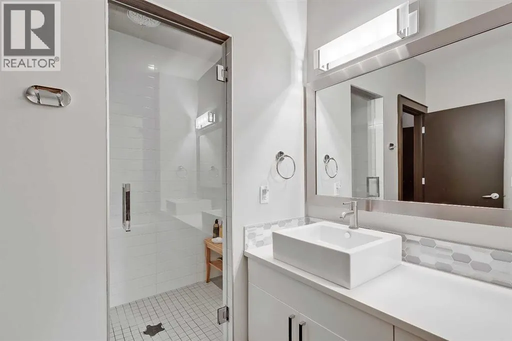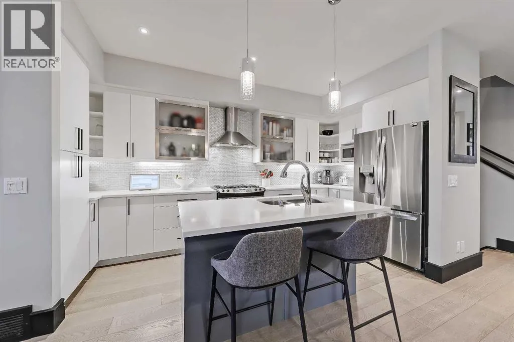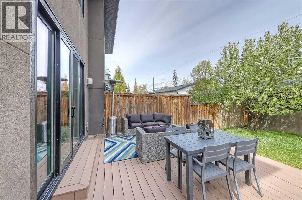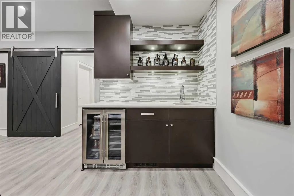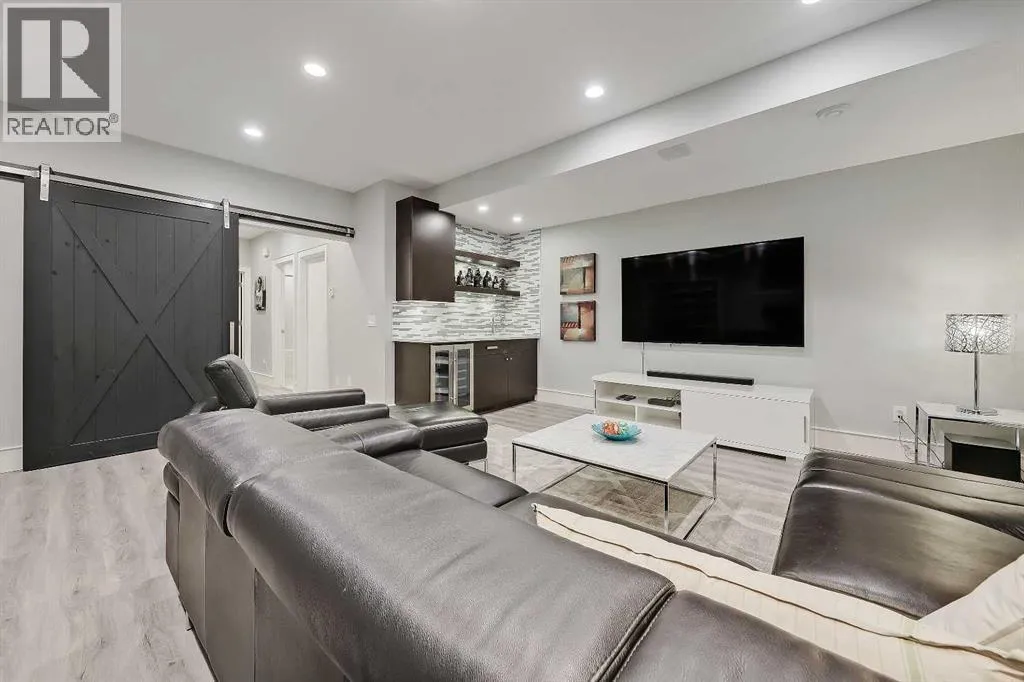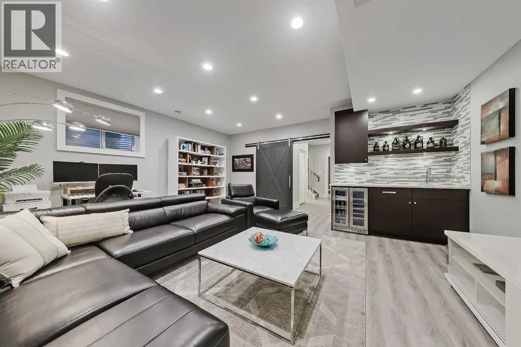 developed living space, 4 beds and 3.5 baths, a spacious basement, a private fenced backyard, and a double detached garage. This is a perfect opportunity for anyone seeking the best of inner-city living. Step inside through the oversized custom fibreglass front door into the welcoming formal front foyer with tiled flooring and a large closet. The main floor features engineered hardwood flooring throughout, leading to the bright formal dining room, which offers plenty of room for a full furniture arrangement. The modern kitchen features ample cabinetry and counter space, quartz counters, and a central island with bar seating, dual basin stainless steel sinks with a garburator, and a full stainless steel appliance package. The adjacent dining nook with an accent stone wall is a great spot for casual meals. The expansive living room boasts a custom built-in entertainment center with display shelves and pull-out drawers, and a tiled gas fireplace. High-end Pella glass sliding doors lead to the rear deck and backyard. Just off the living room is a convenient tiled mudroom with a pocket door, built-in storage, hooks and access to the backyard. Neatly tucked away, a 2pc powder room with tiled flooring completes the main floor. The upper floor showcases an impressive primary bedroom with large windows, a private balcony, a walk-in closet, and a luxurious 5pc ensuite. The ensuite features a quartz vanity with dual sinks and storage, a drop-in soaker tub with a handheld shower wand and tile surround, and a fully tiled stand-up shower. Two additional bedrooms with overs ized windows and large closets, a main 4pc bathroom, and a tiled laundry room provide comfort and convenience. Downstairs, the fully developed basement features luxury vinyl flooring and in-floor heating throughout. A modern barn door opens into the massive rec room, which features a wet bar with a beverage fridge, quartz counters and tiled backsplash, and shelving. Down the hall, you’ll find a wine room with 10 mm glass enclosure, a guest bedroom with a walk-in closet, and a sleek 4pc bathroom. Outside, enjoy a composite deck, stone patio, grassy area, gas line for BBQs, and an insulated, drywalled, double-detached garage. Additional features include a high-efficiency furnace, central A/C, new roof (2024), new front door (2023), new main-floor sliding doors (2023), and a new fridge (2024). Don’t miss out on this exceptional property that offers style, functionality, and an unbeatable location. Schedule your showing today and discover the best of Marda Loop living! (id:62650)