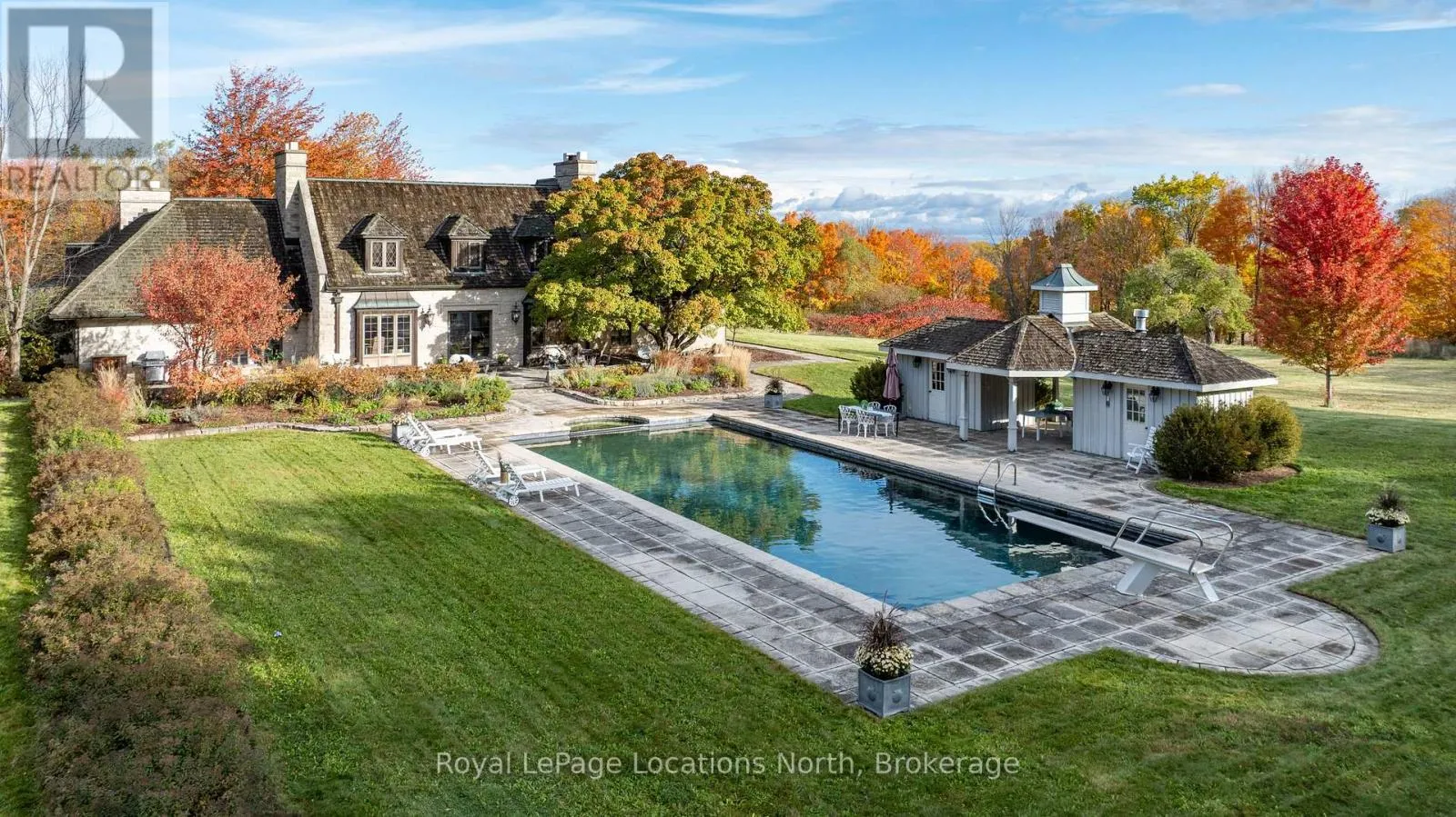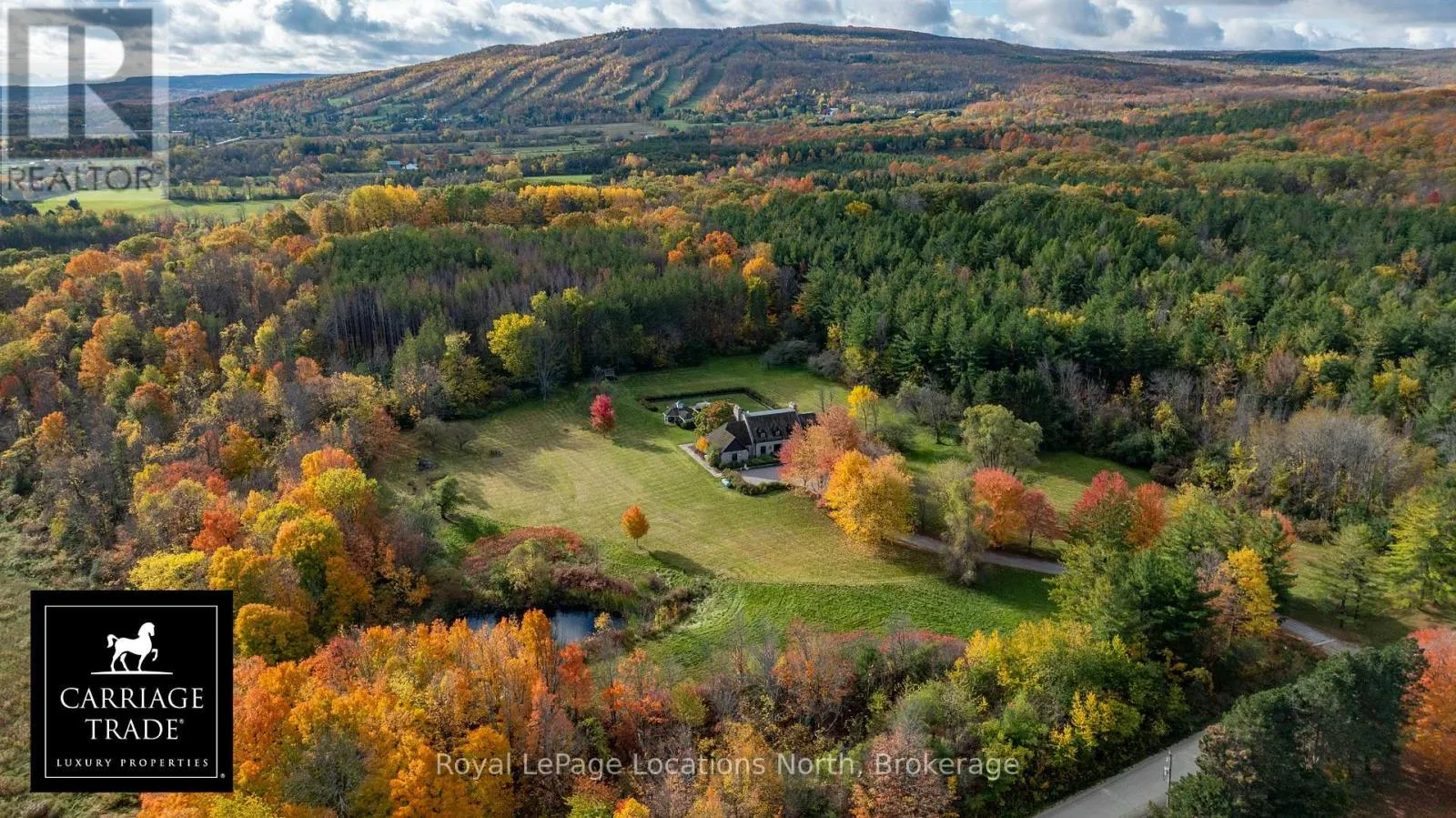 Discover an extraordinary opportunity to own a rare 32.14-acre luxury estate in the Blue Mountains, ideally positioned on the border of Collingwood and just minutes from Osler Bluff Ski Club, OslerBrook Golf & Country Club, Blue Mountain Village, and downtown Collingwood. Set well back from the road with a long, tree-lined driveway, this exceptional property offers remarkable privacy, natural beauty,