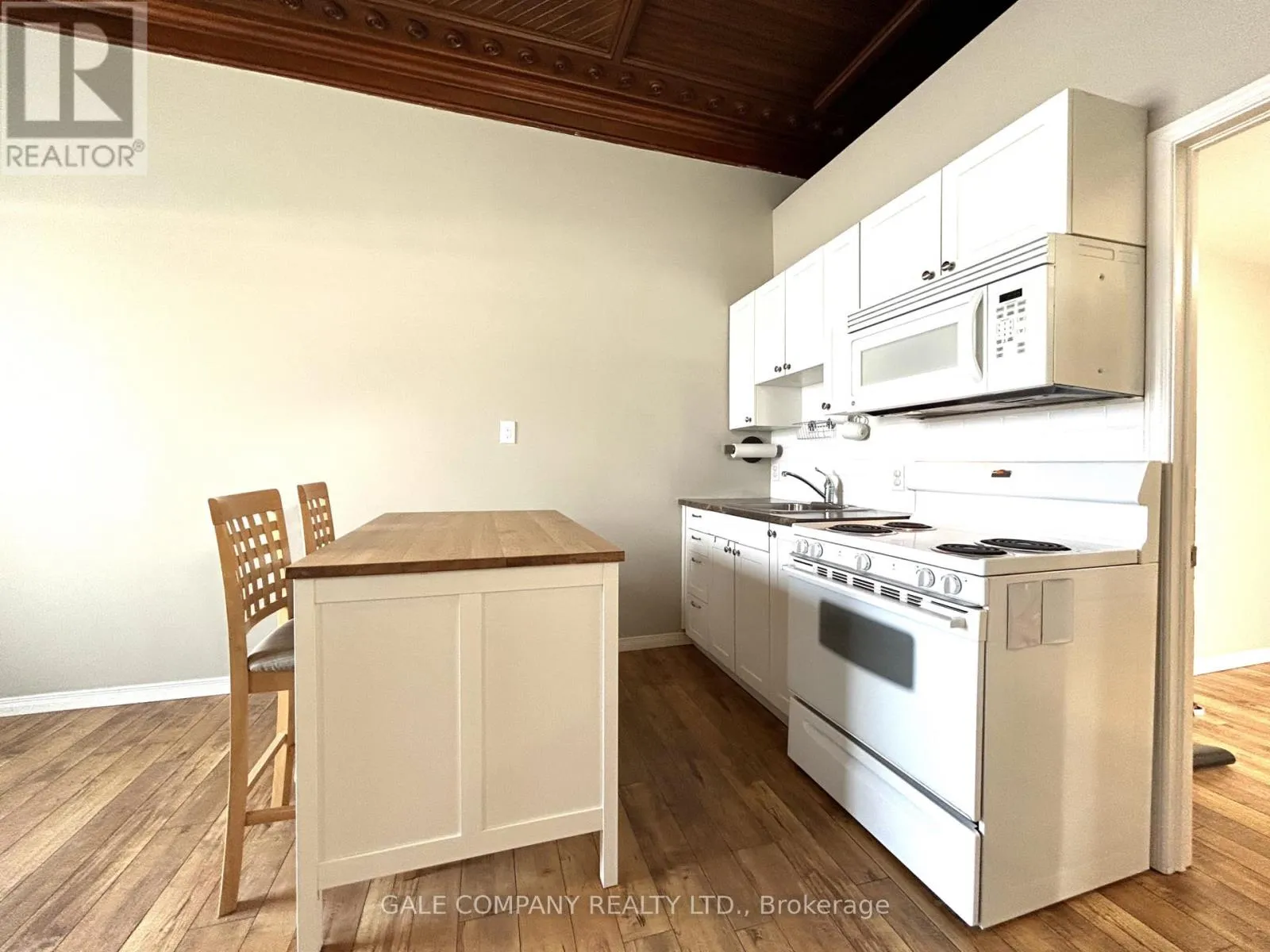 One bedroom, one bathroom ground floor apartment for rent in the heart of downtown Almonte.The living space is defined by soaring ceilings and a stunning, intricately detailed coffered wood ceiling, showcasing warm tones and craftsmanship rarely found in rental properties. A gas fireplace adds both comfort and charm.The compact, and functional kitchen features an island for casual dining or entertaining.