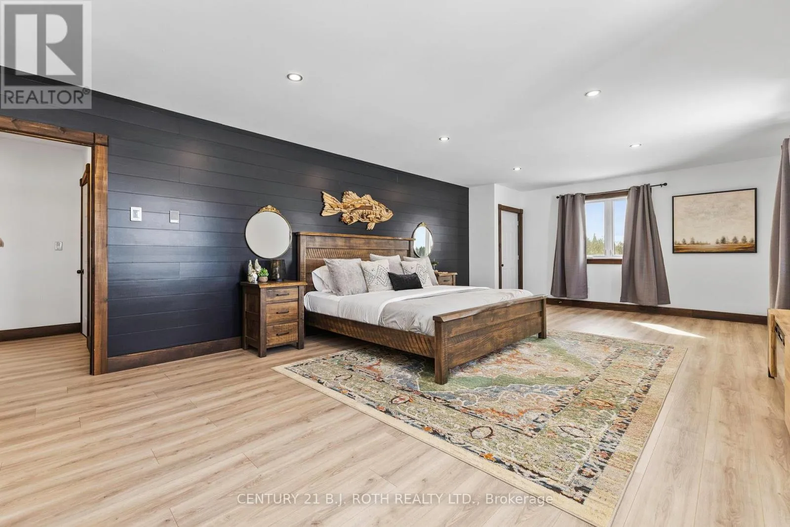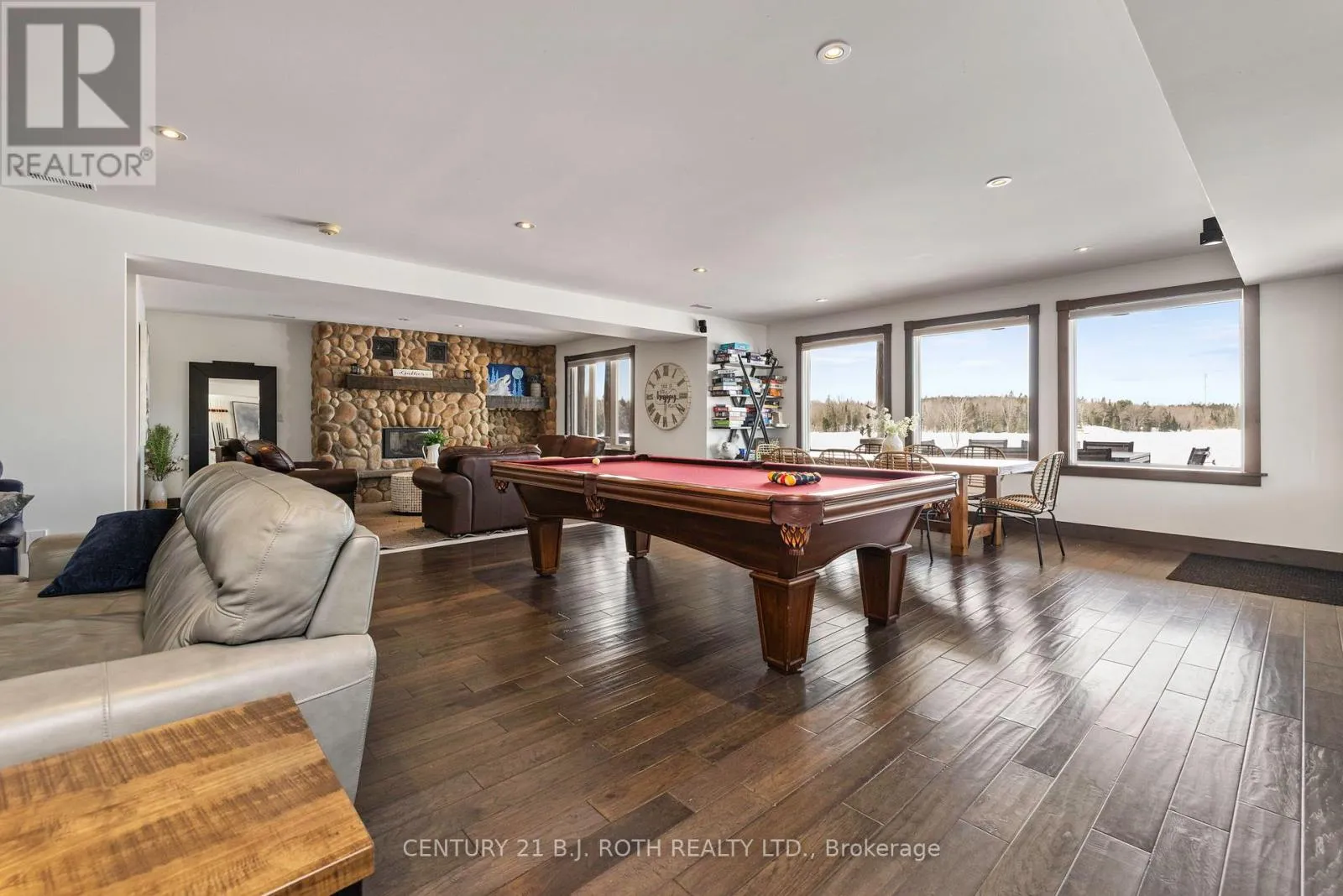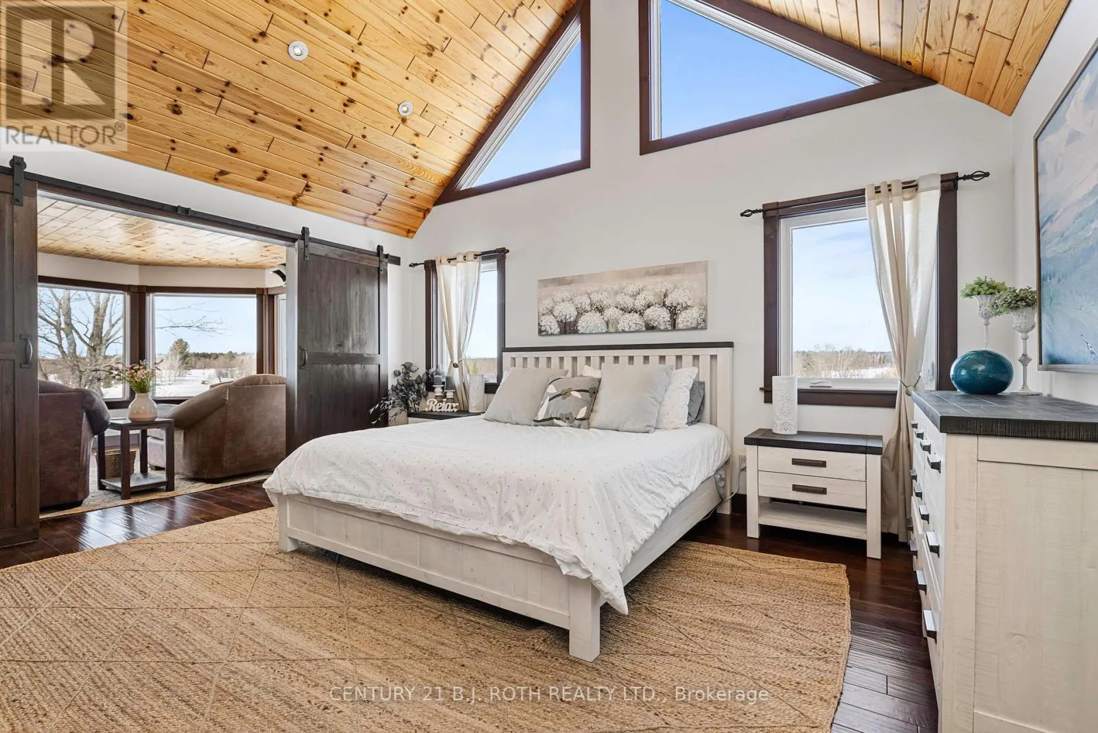 An exceptional west-facing waterfront estate on Lake Manitouwabing, set on nearly 5 acres with 521 feet of pristine shoreline and stunning sunset views across a quiet, sheltered bay. Positioned well away from boat traffic and road noise, the property offers outstanding privacy with direct access to one of the area’s most desirable lakes.The residence features 3+2 bedrooms and three elegant