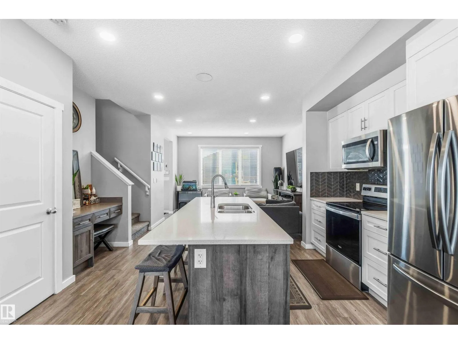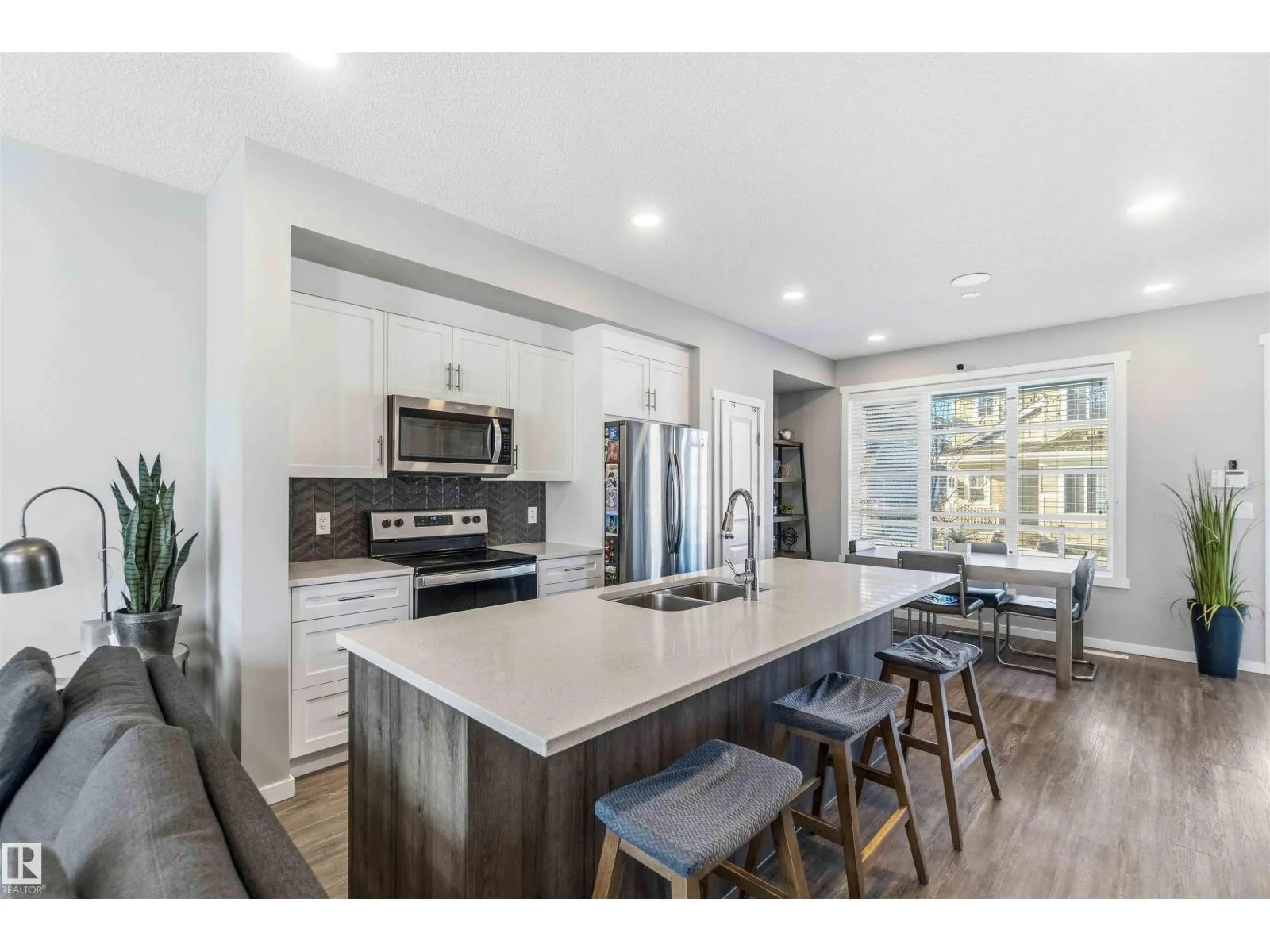 This former Homes by Avi showhome sits on a premium greenspace lot in the sought-after community of Laurel Green, offering style, space, and privacy in one exceptional package. The home features 3 spacious bedrooms, 2.5 bathrooms, and a bright, open main floor with 9’ ceilings and luxurious vinyl plank flooring throughout. The chef-inspired kitchen is finished with quartz countertops
