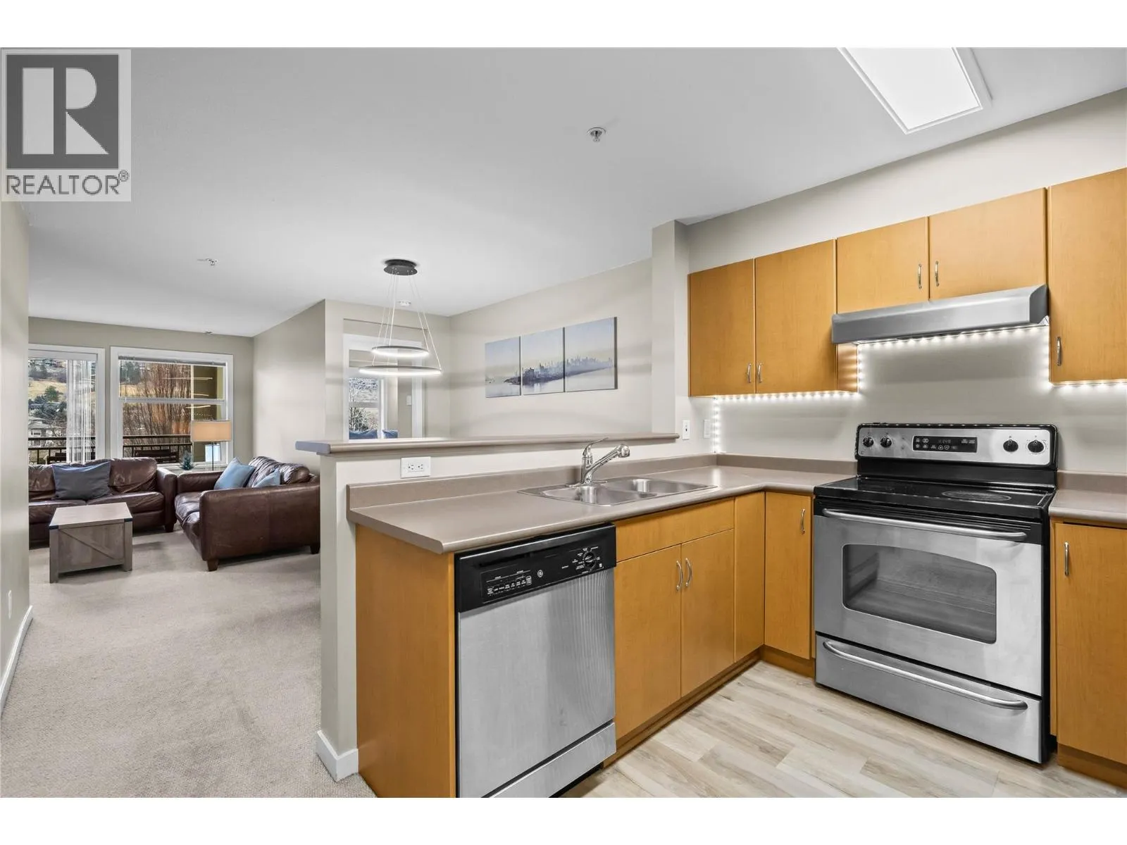 2-bedroom + den condo at The Verve in Glenmore, offering approx. 888 sq ft of functional, easy living space. Thoughtfully designed with two bedrooms positioned on opposite sides of the living area for added privacy, plus two full bathrooms and in-home laundry for everyday convenience. The open kitchen, dining, and living area connects seamlessly, creating a comfortable space to gather