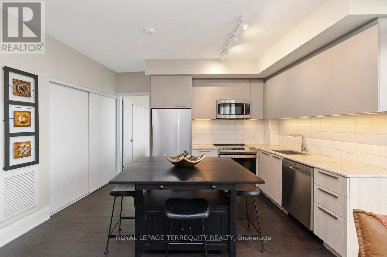 Absolutely gorgeous 1 bedroom + den suite offering sweeping, unobstructed views and a generously sized balcony bathed in warm south-west sunlight, the kind of exposure that turns ordinary evenings into golden-hour perfection. Soaring 9′ smooth ceilings and wide-plank high-performance laminate flooring create a clean, contemporary canvas throughout. The sleek modern kitchen is as stylish as it is functional, complemented by