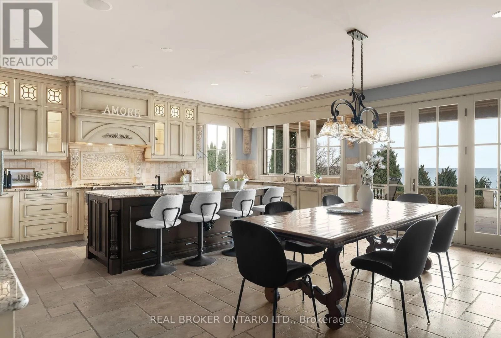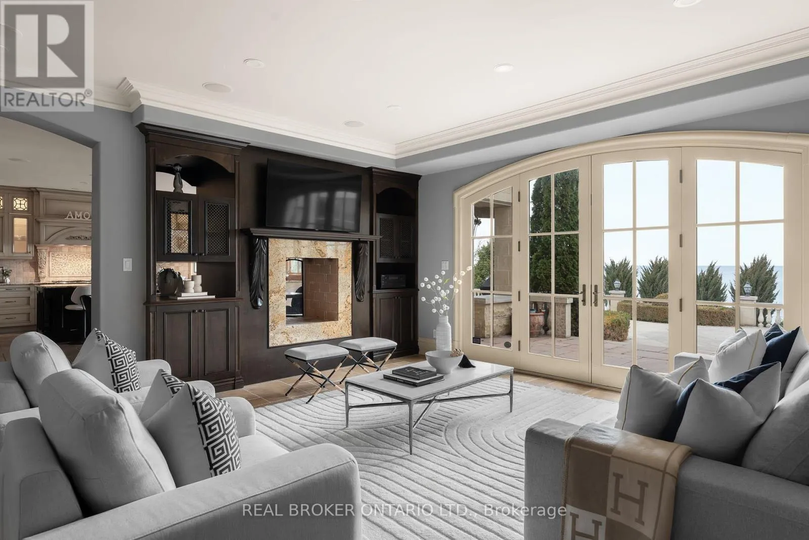 living and dining rooms, acomfortable family room, and a private library. The kitchen is equipped with premium appliances and opens to a bright breakfast area, where adouble-sided fireplace connects the interior to the outdoors. From here, step onto the patio and take in the calm of the water beyond. Upstairs,the home offers five plus one bedrooms, each with its own ensuite and walk-in closet, well suited for families and guests alike. Outdoors, thewaterfront lifestyle takes center stage. A saltwater pool and cabana sit steps from the lake, with glass railings to preserve the view. A recentlyinstalled break wall adds shoreline protection and peace of mind. Completing the property are a circular driveway and an attached two-cargarage. This is a refined lakeside home where privacy, space, and setting come together in a way that is increasingly rare. (id:62650)