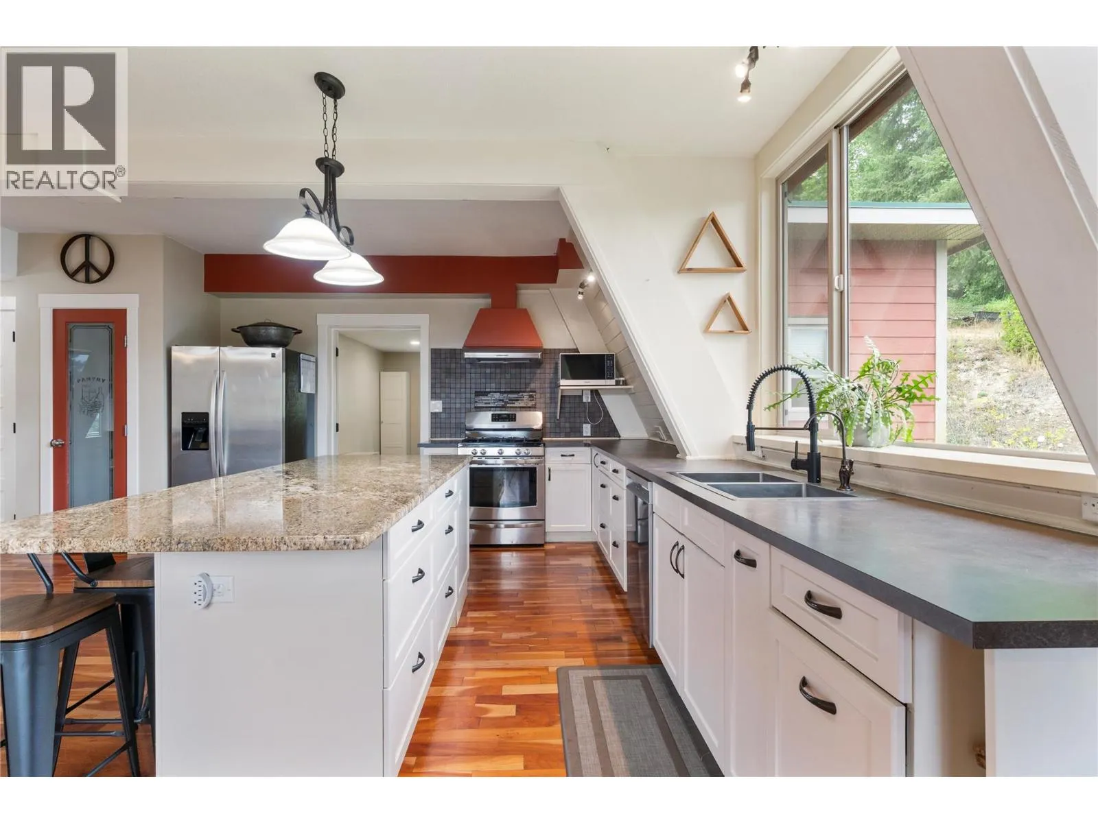MODERN COMFORT MEETS RUSTIC CHARM – This 4-bedroom A-frame style home sits on nearly 8 acres offering the perfect blend of comfort, space, and views. Enter through a spacious foyer into a beautifully designed kitchen with quartz island, gas stove, two pantries, and a generous dining area ideal for gatherings. The open-concept design flows into a living room with