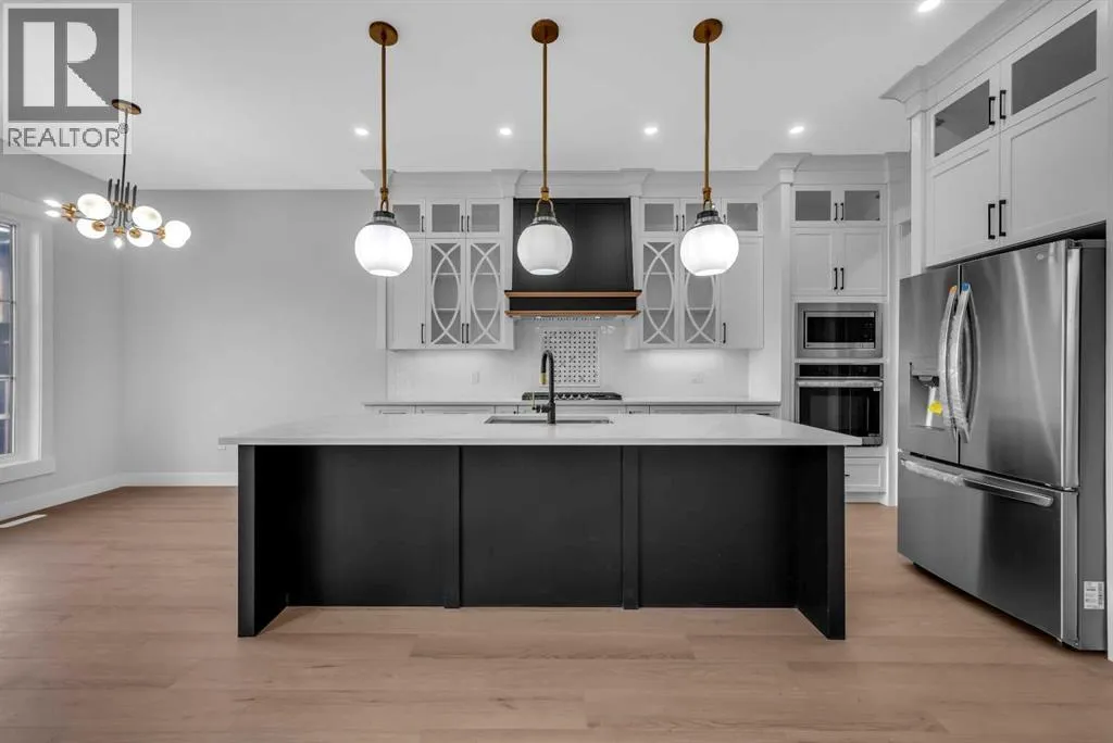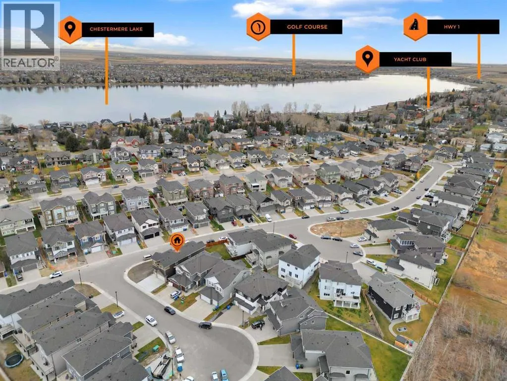 CORNER LOT ! Welcome to 203 Kinniburgh Place, in the highly sought-after Lake community of Chestermere. This Executive quality home boasts 3 fully finished levels complete with upgrades throughout.! Large open concept. OPEN TO BELOW living room on the main floor. 10 ‘ ceiling all over Main floor and 8’ doors. Main floor boasts a FULL BATH and BEDROOM