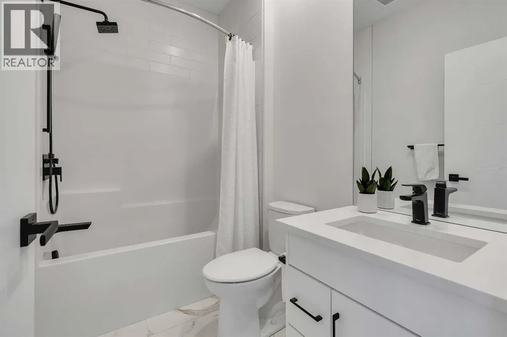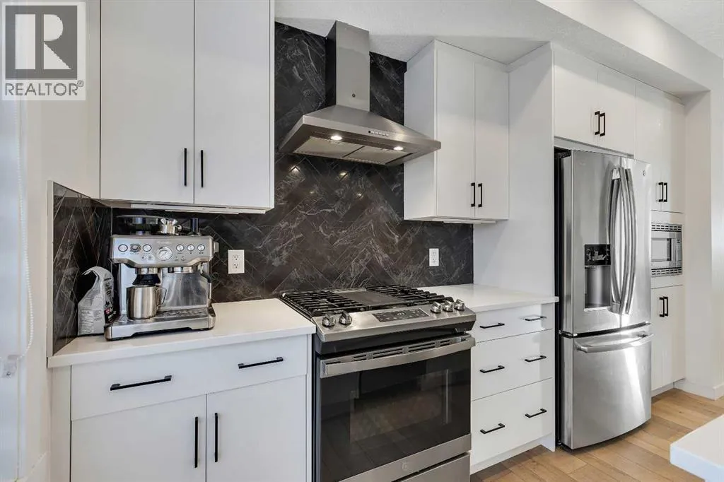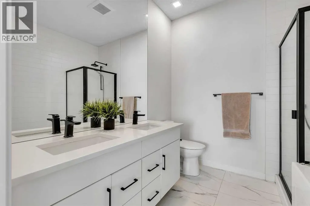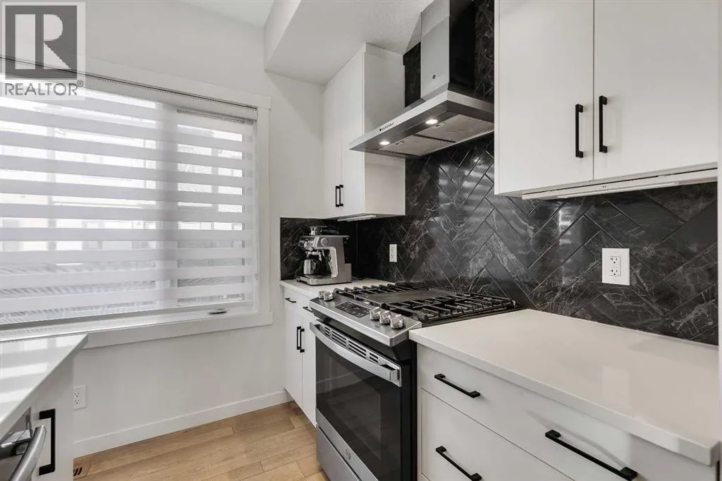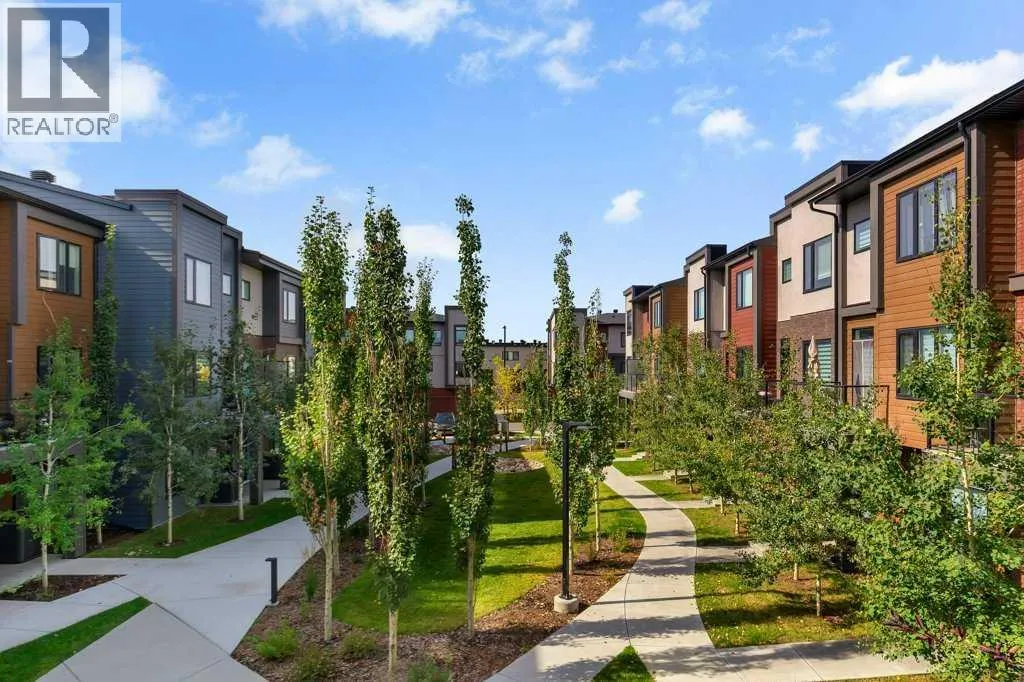 Mountains. This townhome features 1,562 sq ft of thoughtfully designed living space, including a double-primary bedroom layout, a ground-level flex room with a full bathroom, in-floor heating, and a double attached garage. The ground level offers 268 sq ft with a spacious foyer, a versatile flex room currently used as a gym, a 3-piece bathroom, and direct access to the garage. The main level provides 637 sq ft of open-concept living with a bright kitchen, dining area, and living room. The upgraded kitchen package includes sleek white cabinetry with black hardware, stainless steel appliances, gas stove and a designer hood fan. The striking black herringbone-patterned tile backsplash frames the stove area beautifully, creating a focal point balancing the lighter elements of the kitchen. A large island with undermount sink and sleek chrome faucet creates a comfortable seating area to enjoy quick meals or is the perfect gathering spot. From kitchen, step onto the deck equipped with a gas BBQ line. The laundry room is just off the kitchen. The living room is warm and inviting with south-facing windows, an electric fireplace with brick surround, and access to a second balcony which is south facing and overlooks the central courtyard. Upstairs, you’ll find and additional 657 sq ft with two spacious primary bedrooms, each with its own ensuite — one a 5-piece and the other a 4-piece. Additional upgrades include glass panels on stairwells, undermount sinks with full-height tile and mirrors in the bathrooms, upgraded lighting and window coverings, and air conditioning. The double attached garage includes 2 wall heaters and opens up to a off-street double parking pad. The exterior showcases timeless brownstone styling with James Hardie siding, full brick accents, and stucco finishes, offering durability and low-maintenance living. Greenwich’s location is exceptional — just 20 minutes to downtown, quick access north or south, and under an hour to Canmore and Banff. With parks, playgrounds, and the Farmers’ Market within walking distance, this is urban-inspired living at its best. The sellers have been fortunate to have an excellent tenant in place, who is willing to remain should the buyer wish to purchase the property as an investment. (id:62650)