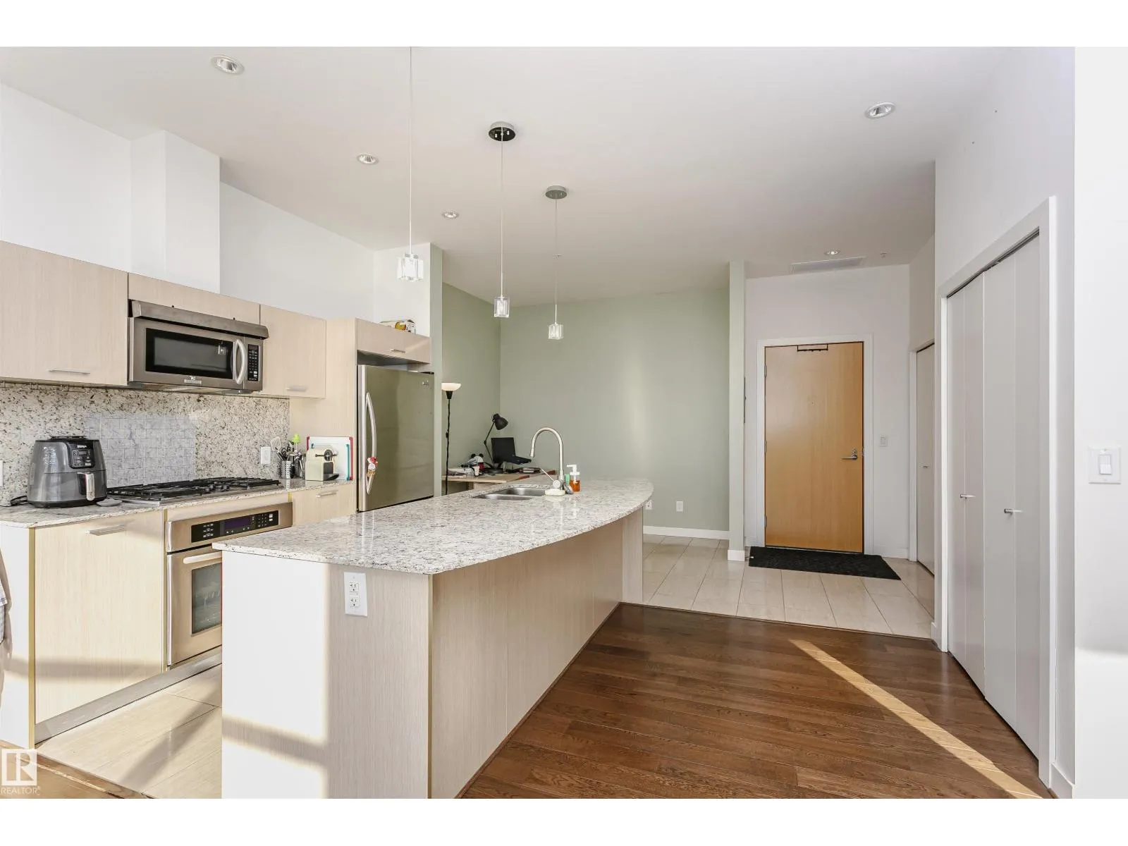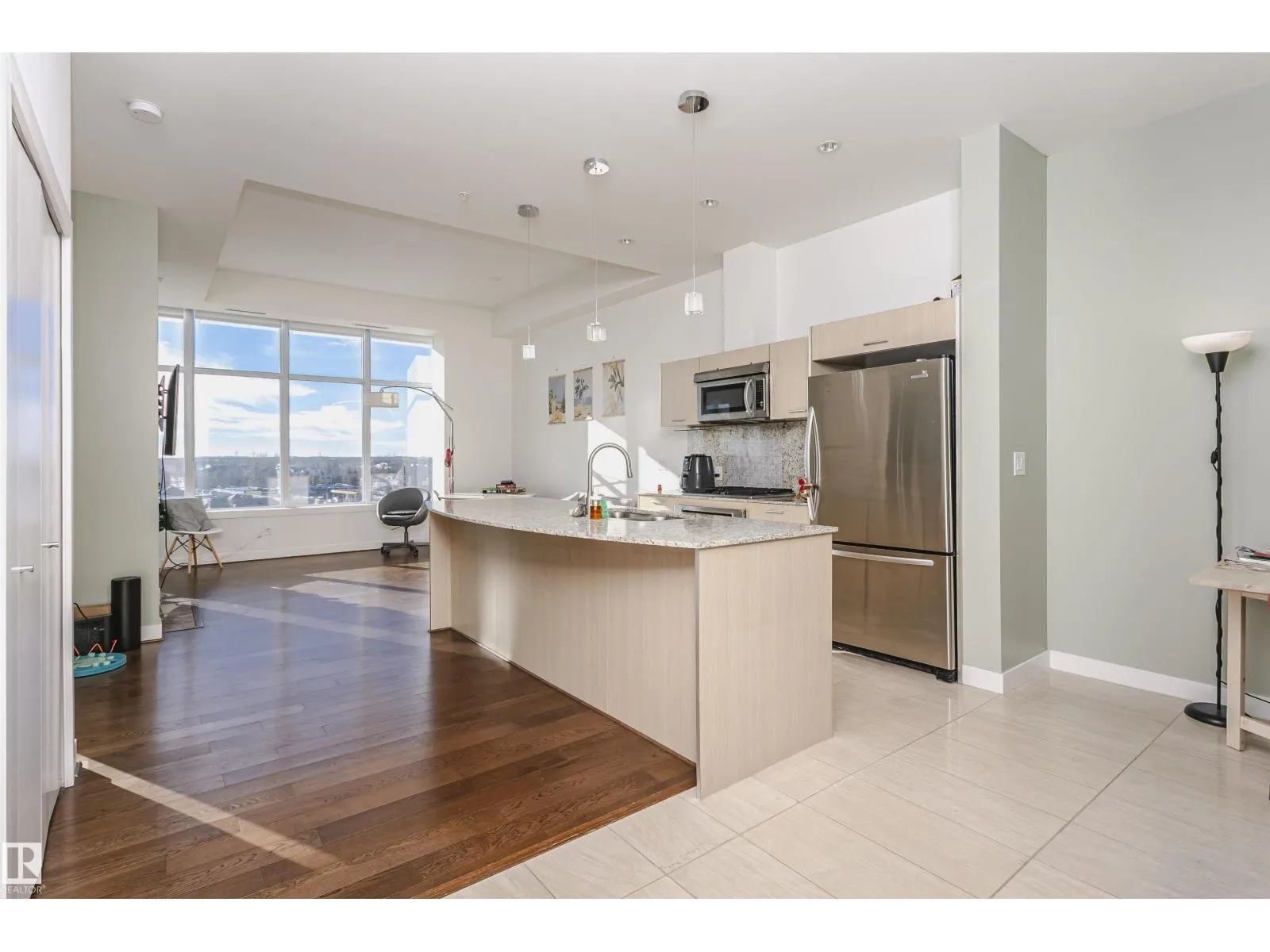 Top-floor, south-facing in sought-after Century Park! Soaring ceilings and expansive windows flood the open-concept layout with natural light, creating a bright and airy atmosphere. Just off the entrance, a versatile flex space offers the perfect spot for a home office, dining area, or reading nook. The modern kitchen showcases granite countertops, a gas stovetop, built-in oven and microwave, plus a