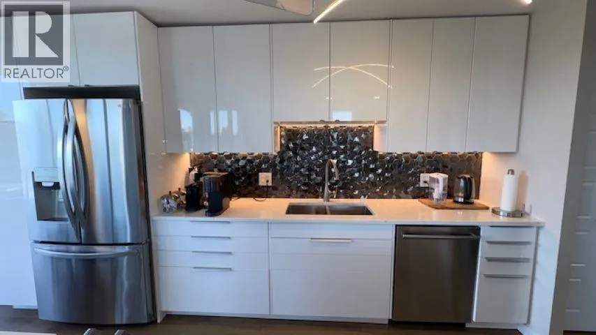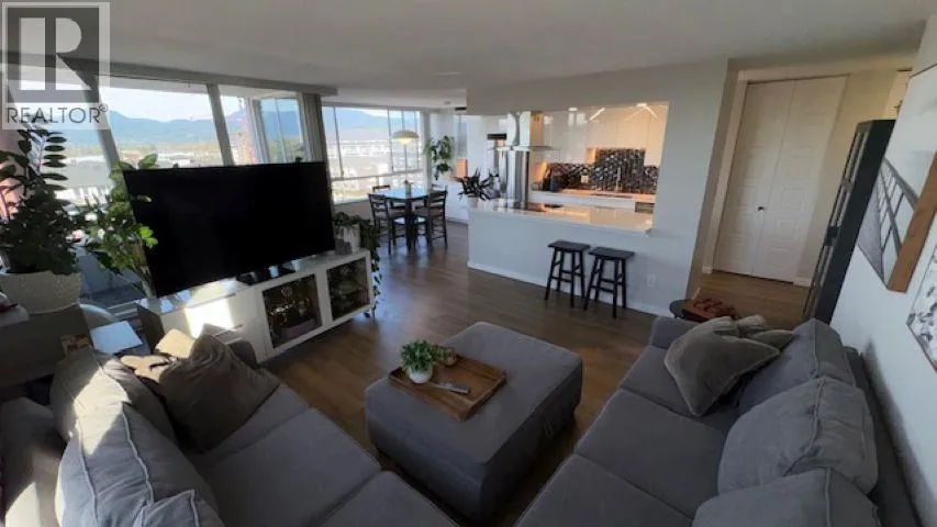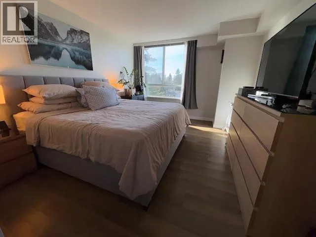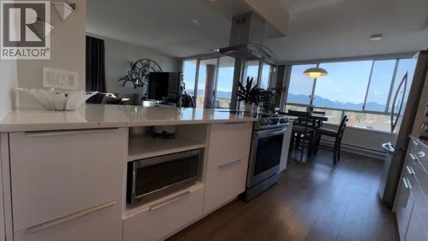 Gordon Towers – Stunning 2-Bedroom Corner Suite with breathtaking views of the Coast Mountains and Golden Ears. Substantially updated throughout, featuring a sleek European white kitchen with quartz countertops, island cooktop, and stainless chimney hood fan. Modern laminate flooring, new lighting, doors, closet doors, and fresh interior paint. Stylish bathroom with new vanity, tub, and ceramic tile. Covered deck to