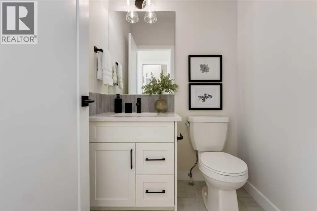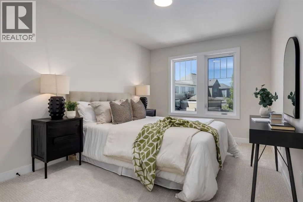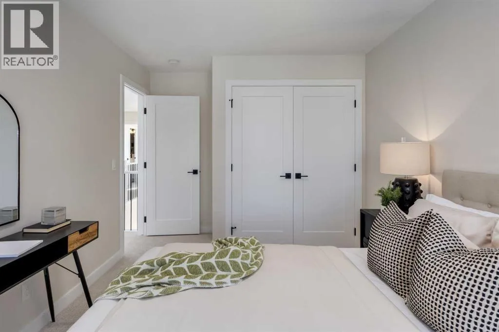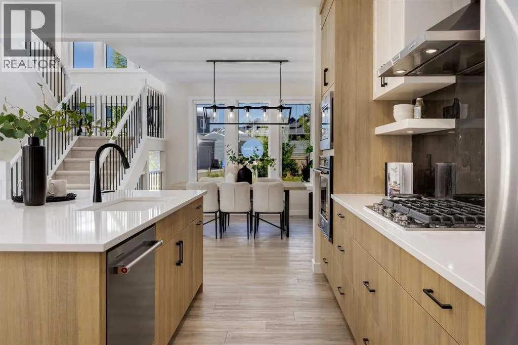 open-concept plan filled with natural light, soaring two-storey windows, and a dramatic floating staircase with open black railing that keeps sightlines wide and the vibe airy. The kitchen is the true centrepiece, equal parts beautiful and practical, finished with two-tone cabinetry (white uppers raised to the ceiling and rich wood-grain lowers), crisp white quartz countertops, a white Silgranite sink, sleek black hardware, and a bold black backsplash that brings the whole look together. Cooking is a treat with a gas range plus built-in oven and microwave, while the open shelving beside the hood fan adds the perfect modern touch for styling and everyday convenience. Entertaining is effortless thanks to the full butler’s bar, complete with a sink and space for an additional fridge or freezer, ideal for hosting, family movie nights, or keeping things organized when life gets busy. The dining area is bright and welcoming with a statement light fixture and sun pouring in throughout the day, flowing seamlessly into the open-to-above living room where a modern black tile fireplace surround mirrors the kitchen finishes for a cohesive, designer feel. At the back of the home, thoughtful locker-style built-ins and generous mudroom storage keep backpacks, boots, and winter gear neatly tucked away, because real life happens here, and this home is built for it. Upstairs, the winged bedroom layout creates privacy and smart separation: the vaulted owner’s suite overlooks the backyard, while the secondary bedrooms are positioned at the front of the home. You’ll appreciate the balance of comfort and function with a spa-inspired ensuite, a spacious five-piece main bath for the kids, and a large upper laundry room that makes the daily routine smoother. The open-to-below upper hallway adds a loft-like feel and reinforces the bright, expansive atmosphere created by the home’s abundant windows. Downstairs, 9’ foundation walls offer excellent future development potential and a more open, comfortable basement feel. Outside, step onto your deck right off the patio doors, perfect for summer BBQs and morning coffee, plus enjoy the convenience of an attached double garage. Set in Alpine Park, this home is surrounded by a community built around connection: parks, pathways, and a future village centre with local shops and cafés on the way. With design inspired by Calgary’s mountain, prairie, and urban influences, Alpine Park is crafted to encourage neighbourliness, and the Engler is a perfect match for that lifestyle. (id:64429)