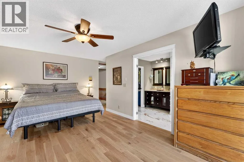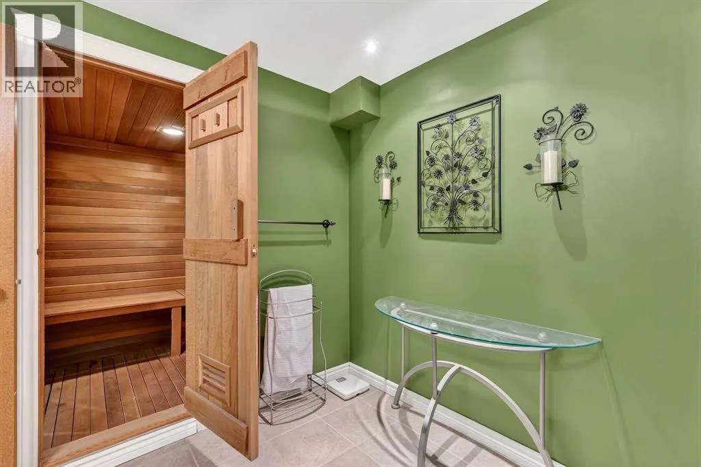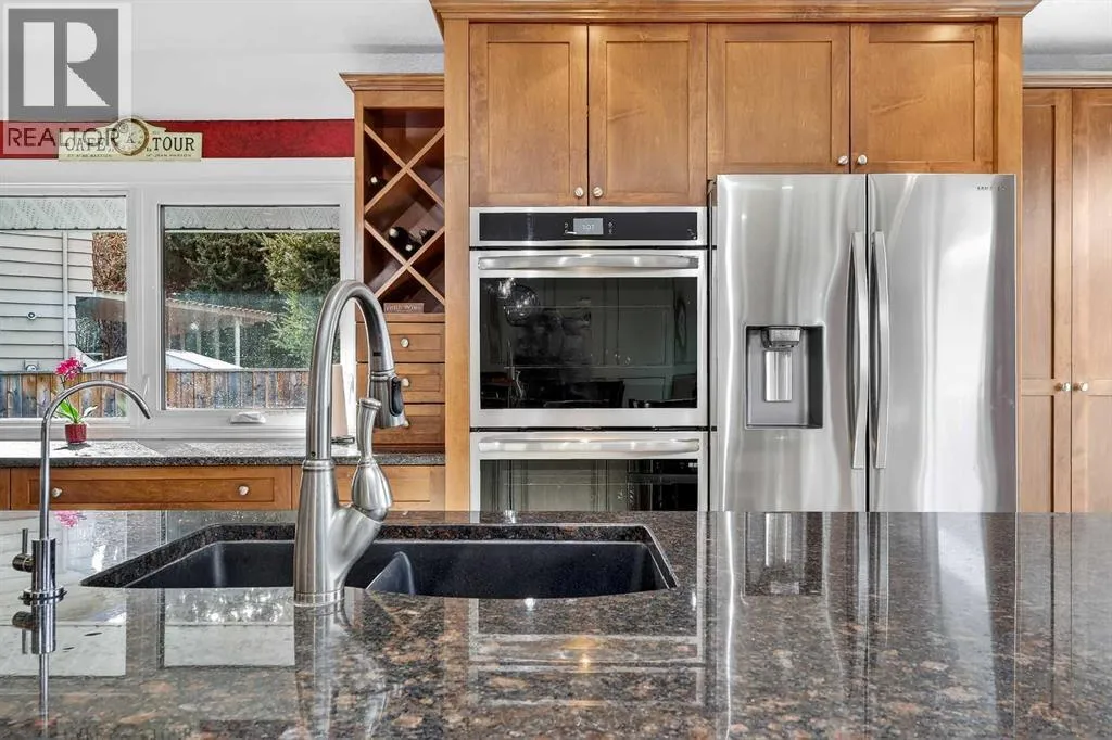 showcases the home’s original front door, setting the tone for the warmth and charm found throughout. Beyond the second entry, the home opens into a bright and airy living space featuring soaring ceilings and abundant natural light. The spacious living room offers a cozy gas fireplace with a beautiful brick surround and a large bay window that fills the room with sunshine, while the tiered upper living area creates excellent flow for both daily living and entertaining.The kitchen is truly the heart of the home and designed for gathering. It features a massive island, granite countertops, generous cabinetry, and an additional wet bar, making it perfect for hosting family dinners, holiday celebrations, or casual evenings with friends. The stainless steel appliance package includes a Wolf range, brand new dual ovens, a one year old refrigerator, dishwasher, and built in microwave. A reverse osmosis tap that feeds the refrigerator provides added convenience and water quality. Sliding patio doors lead to the expansive back deck, creating an ideal space for morning coffee, summer barbecues, and seamless indoor outdoor entertaining.The primary retreat offers a peaceful escape with sliding glass door access to the deck. The spa inspired ensuite features a 40 gallon soaking tub, separate shower, double vanity, and private water closet. Two additional bedrooms, a 3 piece guest bathroom, and a laundry room with Miele washer and dryer complete the main level, along with direct access to the double attached garage.The fully developed basement expands the living space with two additional bedrooms, a comfortable TV and family room, office or flex area, cold storage, and a dedicated work or craft space. A 3 piece bathroom with a functional dry sauna creates a relaxing retreat. Dual furnaces provide independent comfort for each level.Outside, the mature landscaping includes pear, cherry, and apple trees, along with a pergola, greenhouse, and expansive yard offering exceptional gardening and entertaining opportunities.Additional upgrades include a new front bay window installed in 2016, all remaining windows replaced in 2017, and a fully functional vintage radio intercom system.Located minutes from South Glenmore Park, shopping, restaurants, numerous amenities, and offering easy access to the South Ring Road via 90th Avenue, this home delivers comfort, character, and an outstanding Oakridge lifestyle. (id:62650)