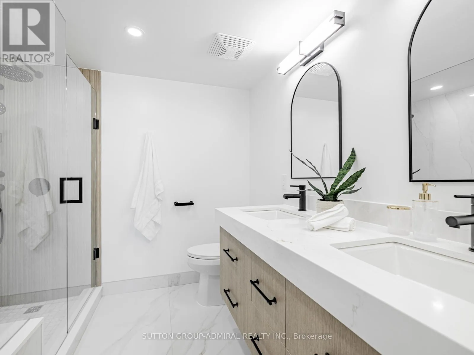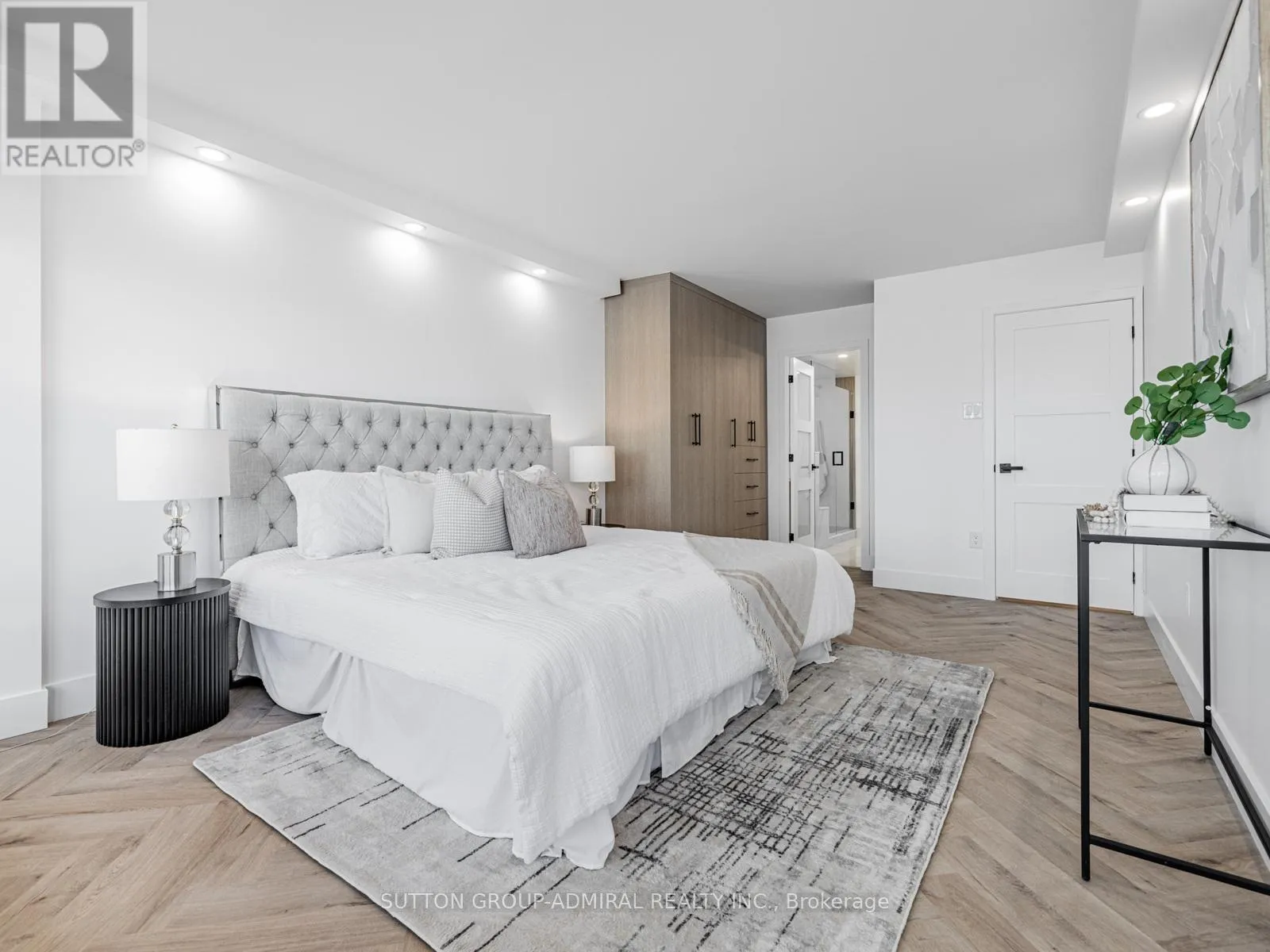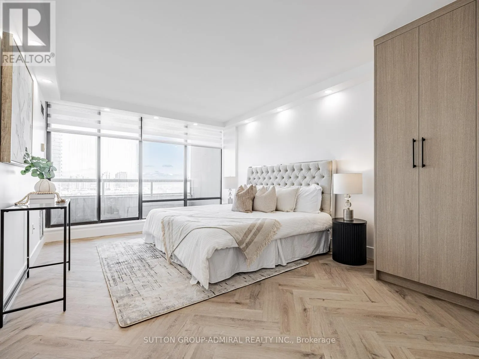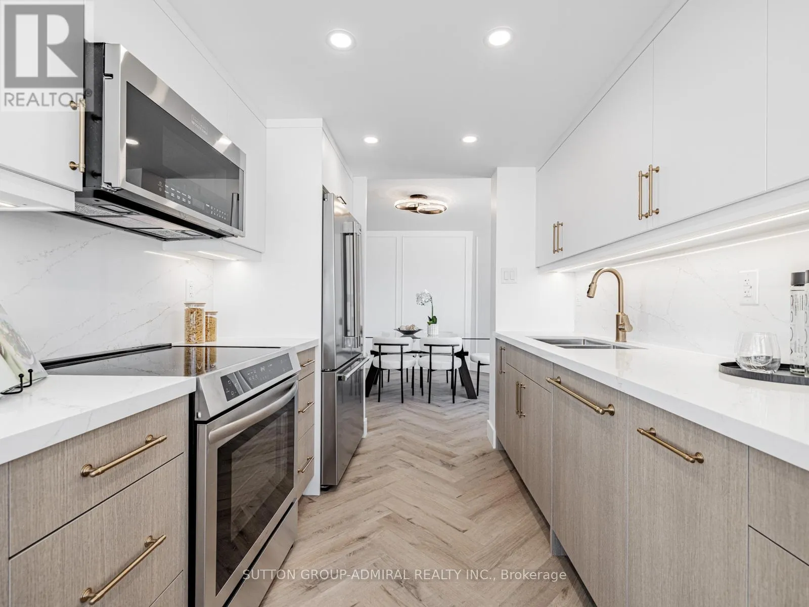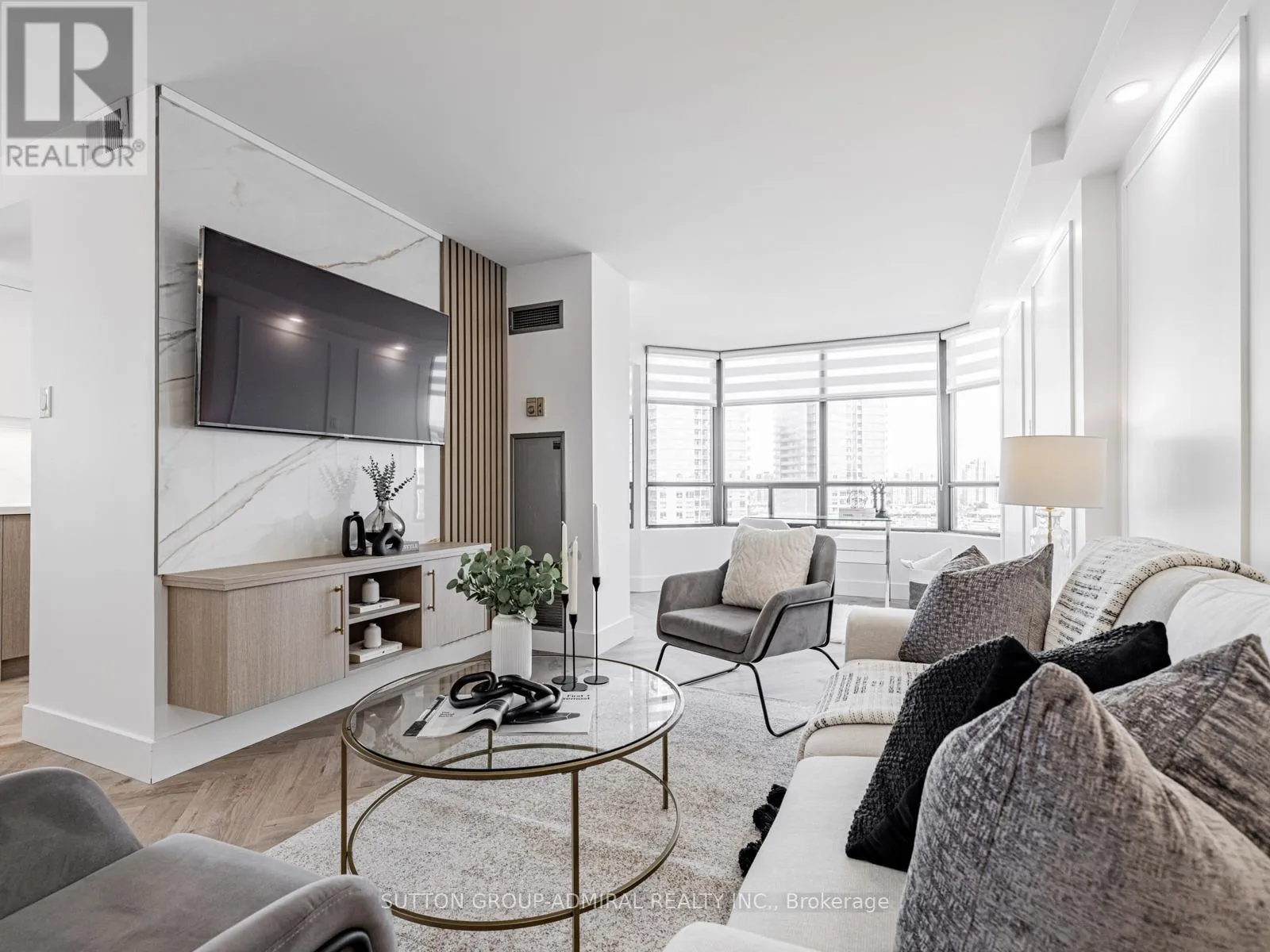 Absolutely stunning and meticulously renovated condo located in the prestigious Promenade Towers, offering approximately 1,250 square feet of luxury living in the heart of Thornhill. This bright and spacious 2-bedroom, 2-bathroom suite showcases top-tier finishes throughout, including elegant herringbone flooring, smooth flat ceilings, pot lighting, and premium window treatments. The designer kitchen is a true showpiece, featuring quartz countertops, modern