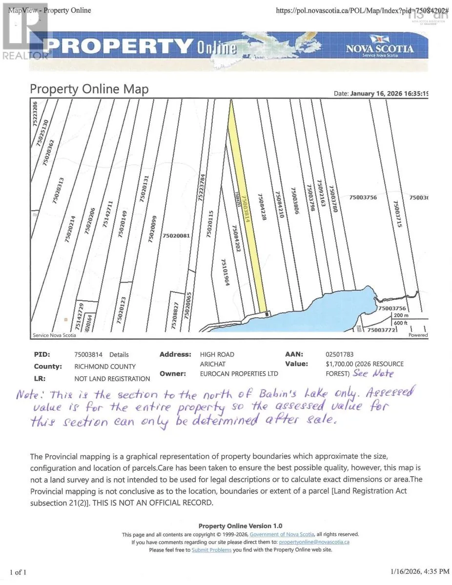 cafés, fish markets and spectacular seaside views from just about everywhere. You will also discover beaches, lighthouses and other amazing sights wherever you go. This hidden gem is where Acadian culture lives on through song, music, dance and crafts. You can own a small piece of this island paradise at a very affordable price. This property takes in approximately 12.5 acres of vacant land beginning on the north shore of Babins Lake and running north to lands owned by the Municipality of the County of Richmond. This property has approximately 100 feet of lakefront where you will experience an abundance of undisturbed natural beauty. You are also a short walk to the ocean where you can enjoy the calm waters in sheltered coves or choppy waters and rugged coastlines in less sheltered areas. This property is ideal for a cottage or camp. Note: There is a parcel of land between this property and the north shore of the lake that the Municipality claims they expropriated for the water intake infrastructure supplying drinking water to the residents of Arichat. The Municipality has never legally expropriated this land. The Land Registration office is not able to explain how the Municipality obtained title without going through a legal expropriation process or obtaining a deed from the legal landowners. It is our position that the Municipality does not have clear title to this property. This land carve-out does not prevent access to the lake but may present some restrictions for landowners. On the positive side, this carve-out does provide better access to the property. (id:62650)