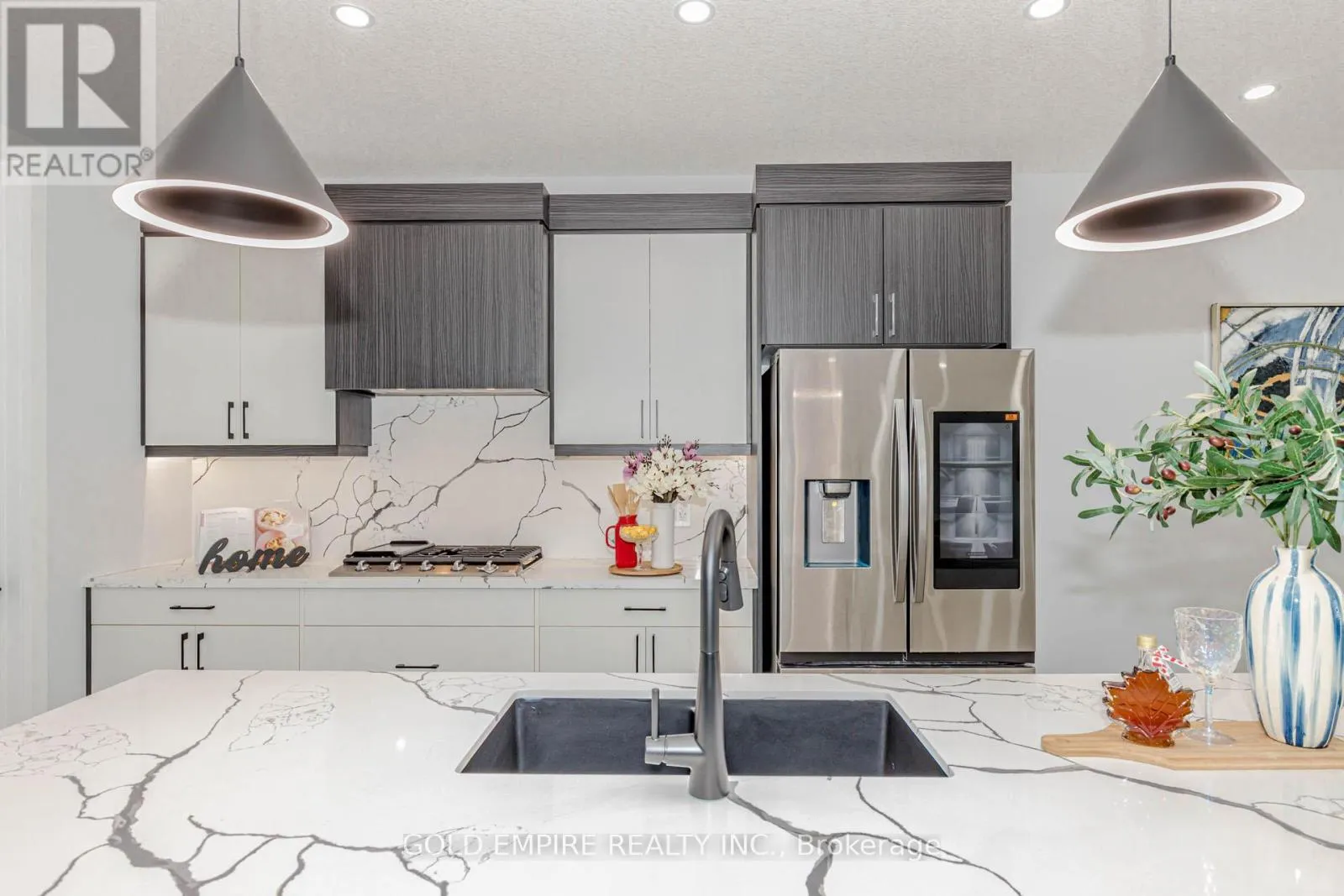 Luxurious 4-Bedroom Home with Finished Basement Nearly 3,500 Sq Ft of Elegant Living Space! Featuring Premium Upgrades Throughout for a Truly Upscale Lifestyle stunning home offers an impressive 2-car garage and concrete driveway with no sidewalk, providing 6 car parking. The upgraded exterior elevation features brick, stucco, and siding finished with stucco, offering a sleek and modern curb appeal. Double