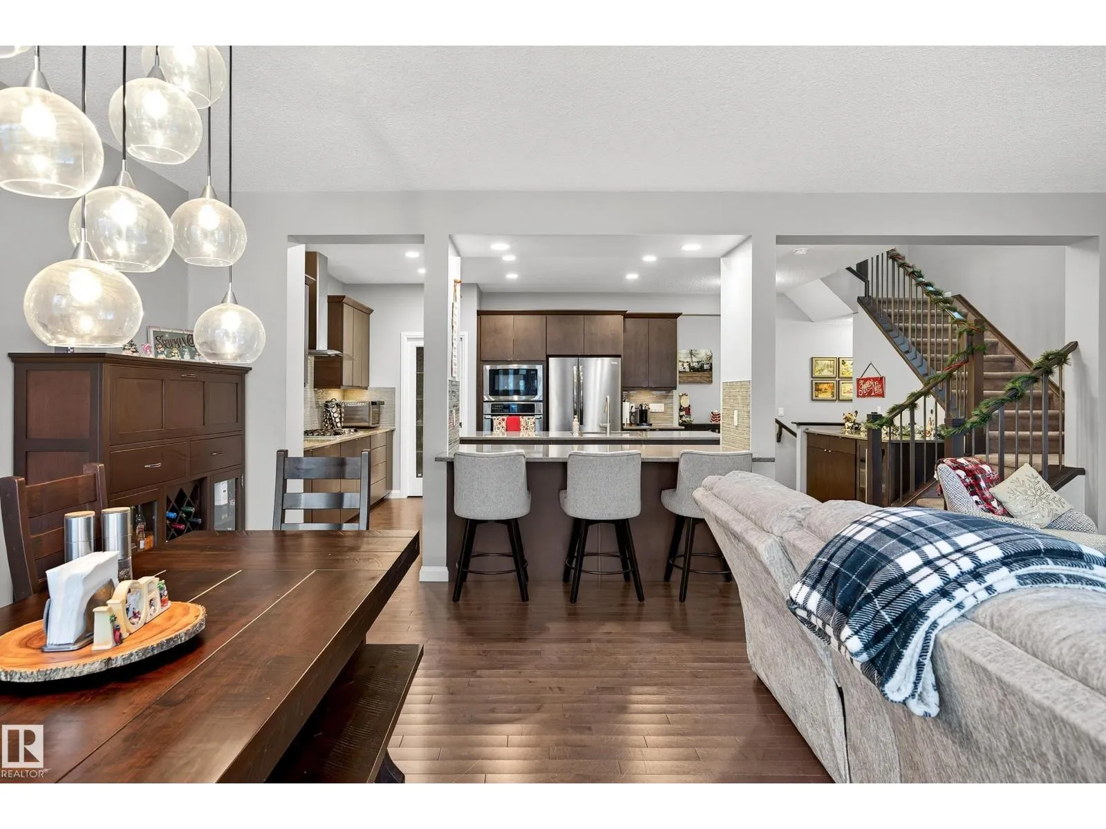 Beautiful family home in McConachie, ideal for a growing family with room for everyone to live and entertain comfortably. The bright, open-concept main floor showcases a spacious chef’s kitchen with quartz counters, gas range, large island, and walk-in pantry, overlooking the dining area and cozy living room with gas fireplace. Patio doors lead to a composite deck with covered dining