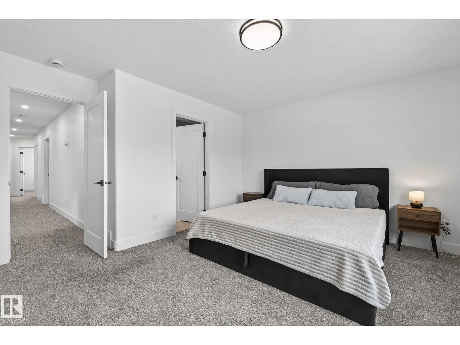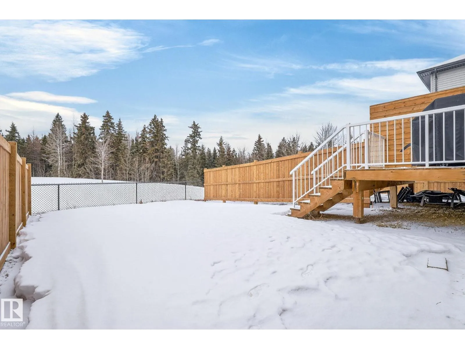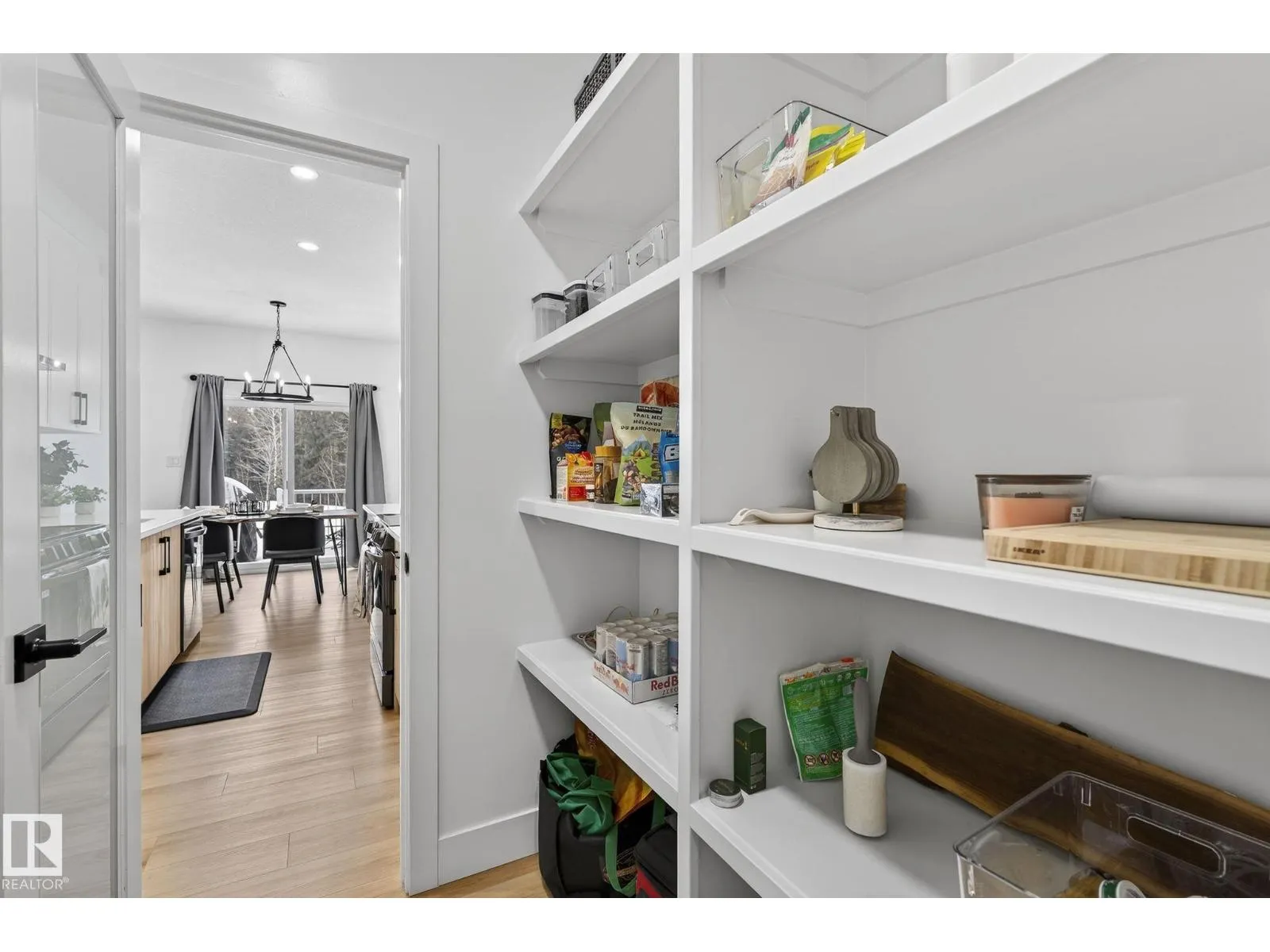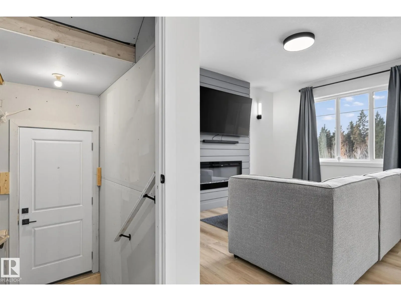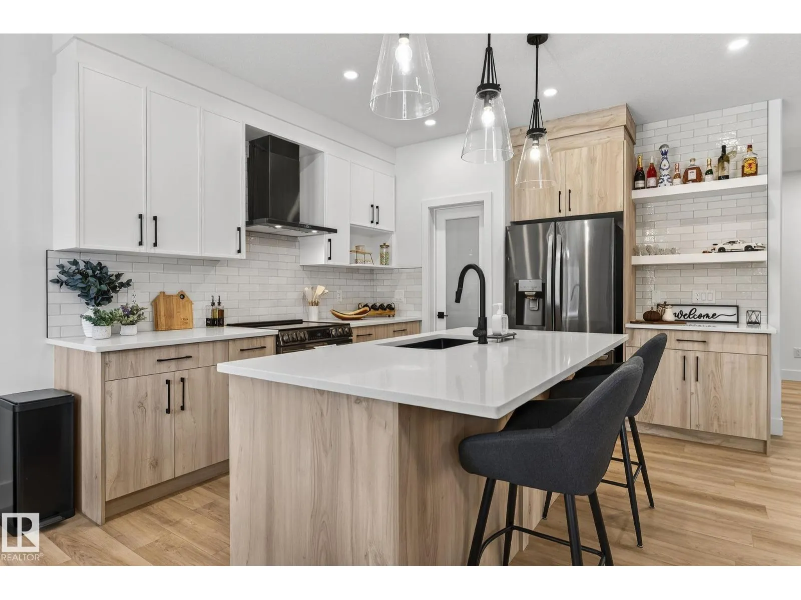 Welcome to this beautiful half duplex in Harvest Ridge, perfectly positioned backing onto mature trees. The main floor is thoughtfully designed with a bright, open-concept filled with natural light, which makes an immediate impression with its modern floor-to-ceiling feature wall and sleek electric fireplace. The kitchen is beautifully appointed with quartz countertops, soft-close cabinetry, and a walk-through pantry. Upstairs, a