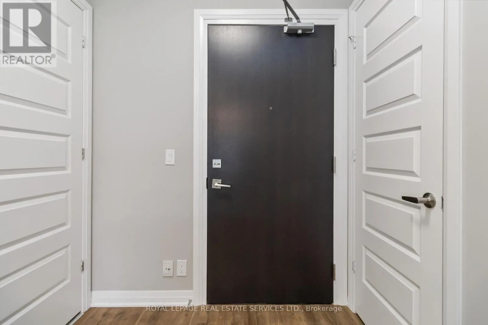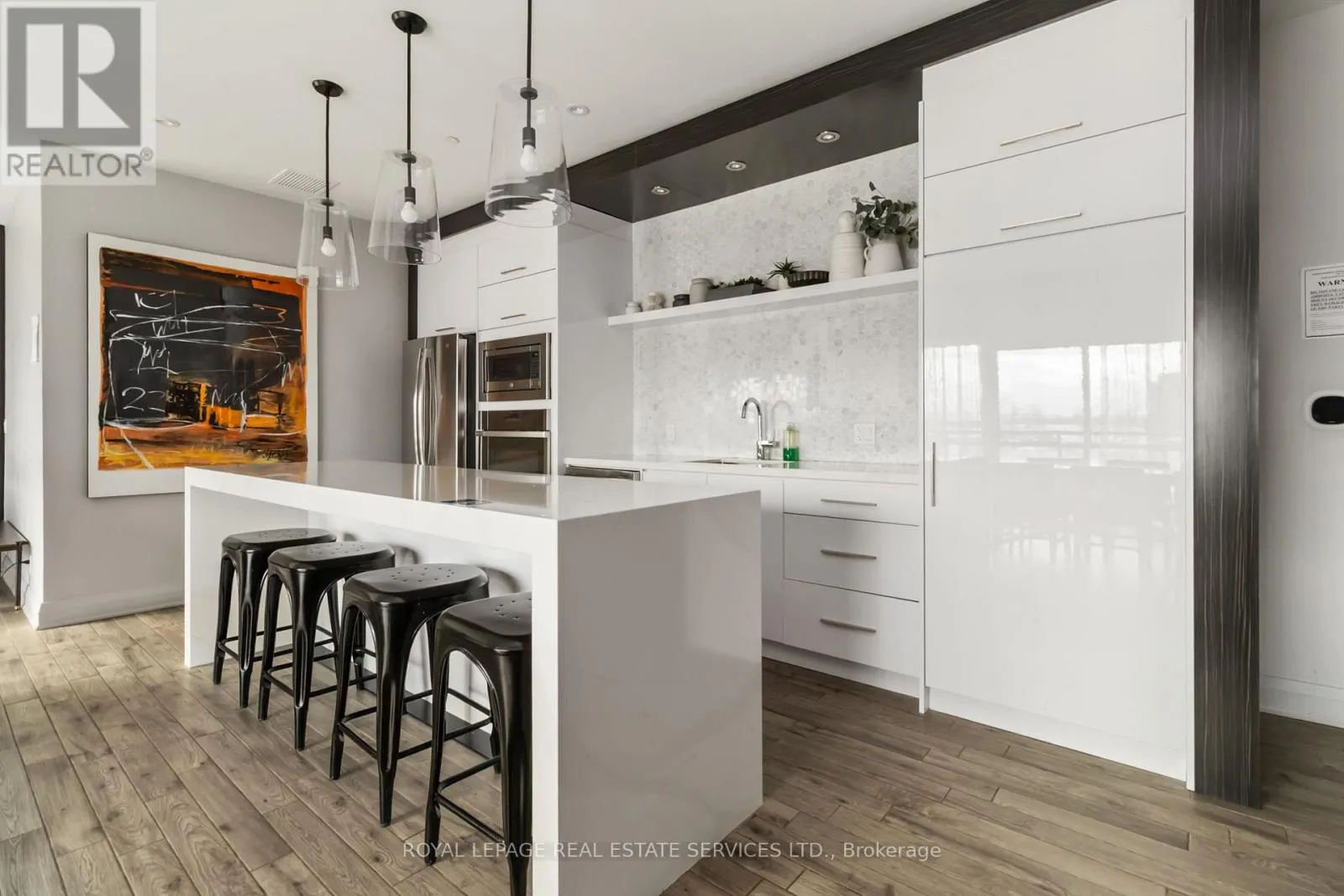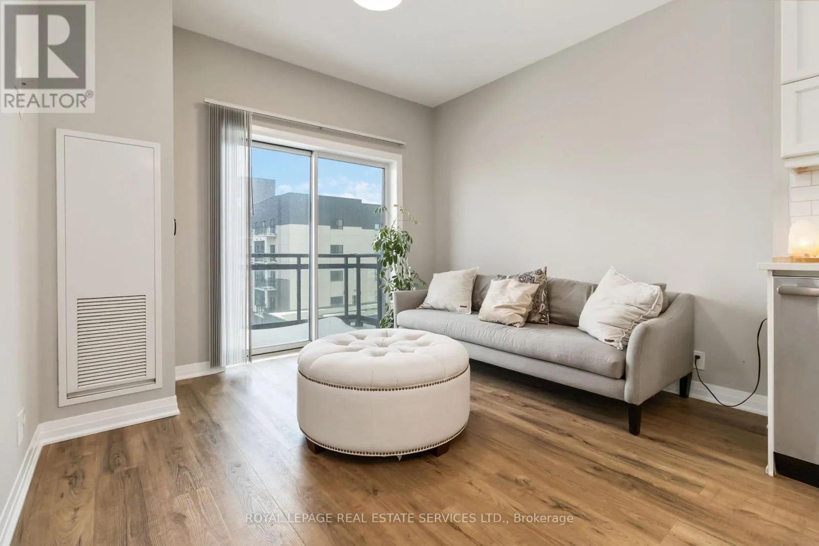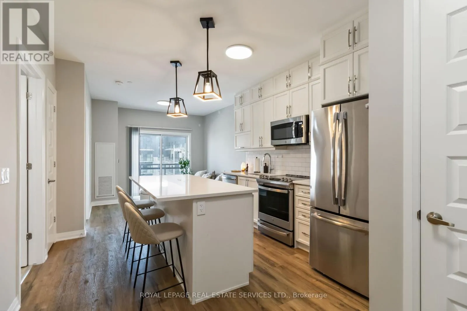 Welcome to this beautifully maintained 600 sq. ft. condominium offering an upgraded open-concept layout ideal for modern living. The unit showcases smooth 9-foot ceilings, modern light fixtures, and expansive windows that bathe the space in natural light. Durable luxury laminate flooring runs throughout, while the living room offers direct walkout access to a private balcony. The stylish white kitchen is