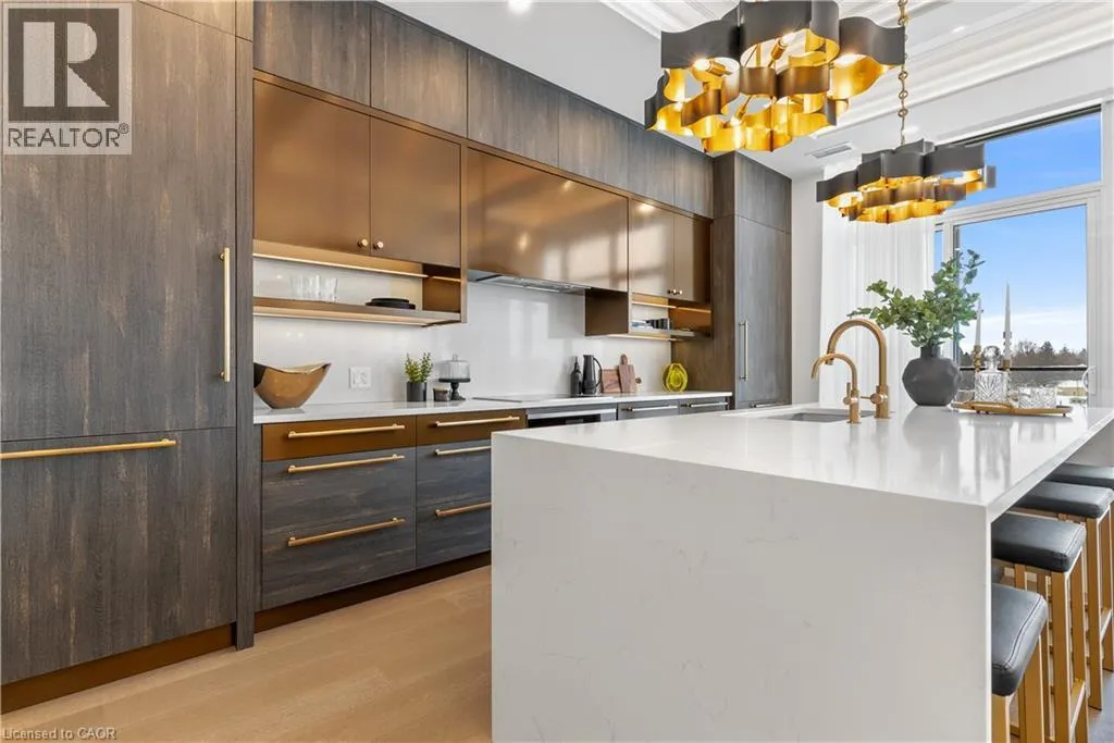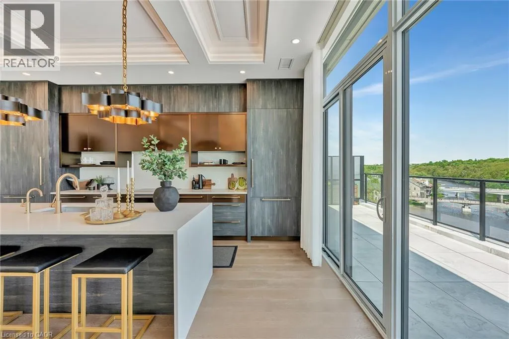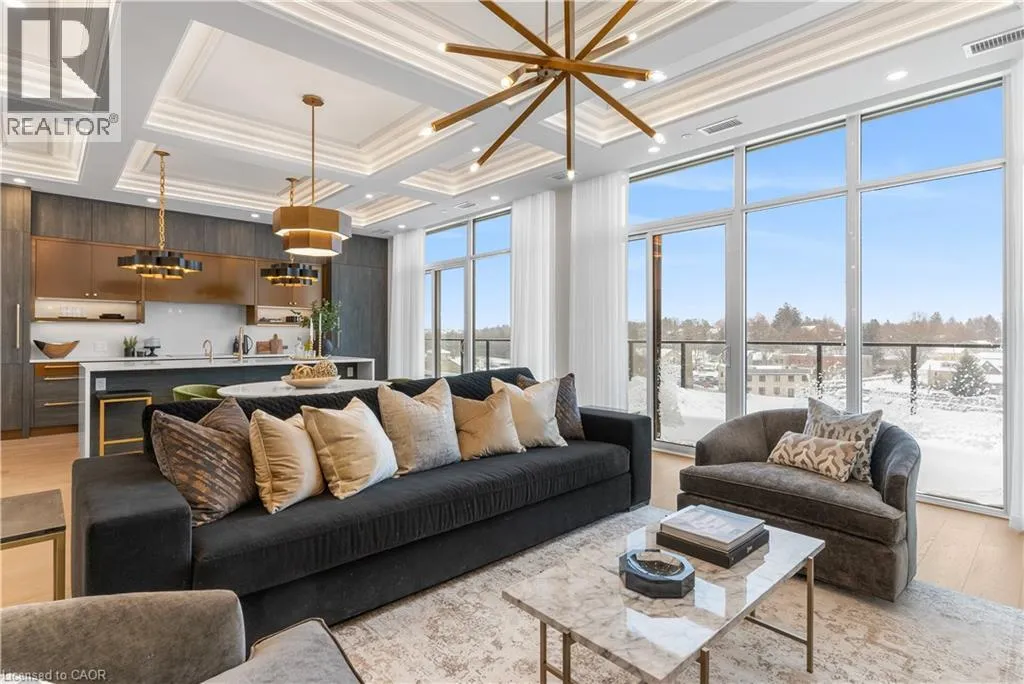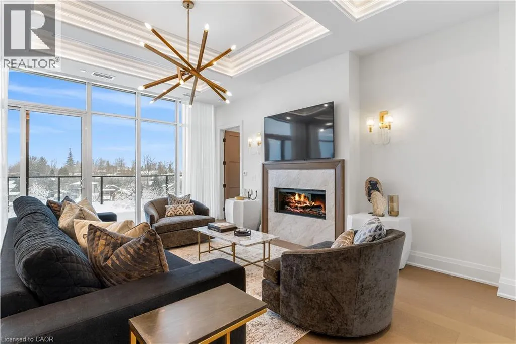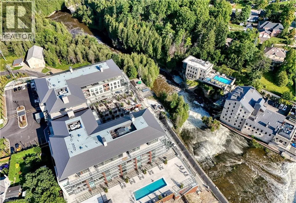 Experience elevated living at its finest in The Mill Penthouse! Set within the coveted Elora Mill Residences, this penthouse redefines luxury with soaring 10-foot ceilings, designer lighting, and curated finishes throughout. A gas fireplace adds warmth and sophistication to the open-concept living space, while the expansive private terrace, boasting over 650 sq. ft., offers a built-in gas line perfect for
