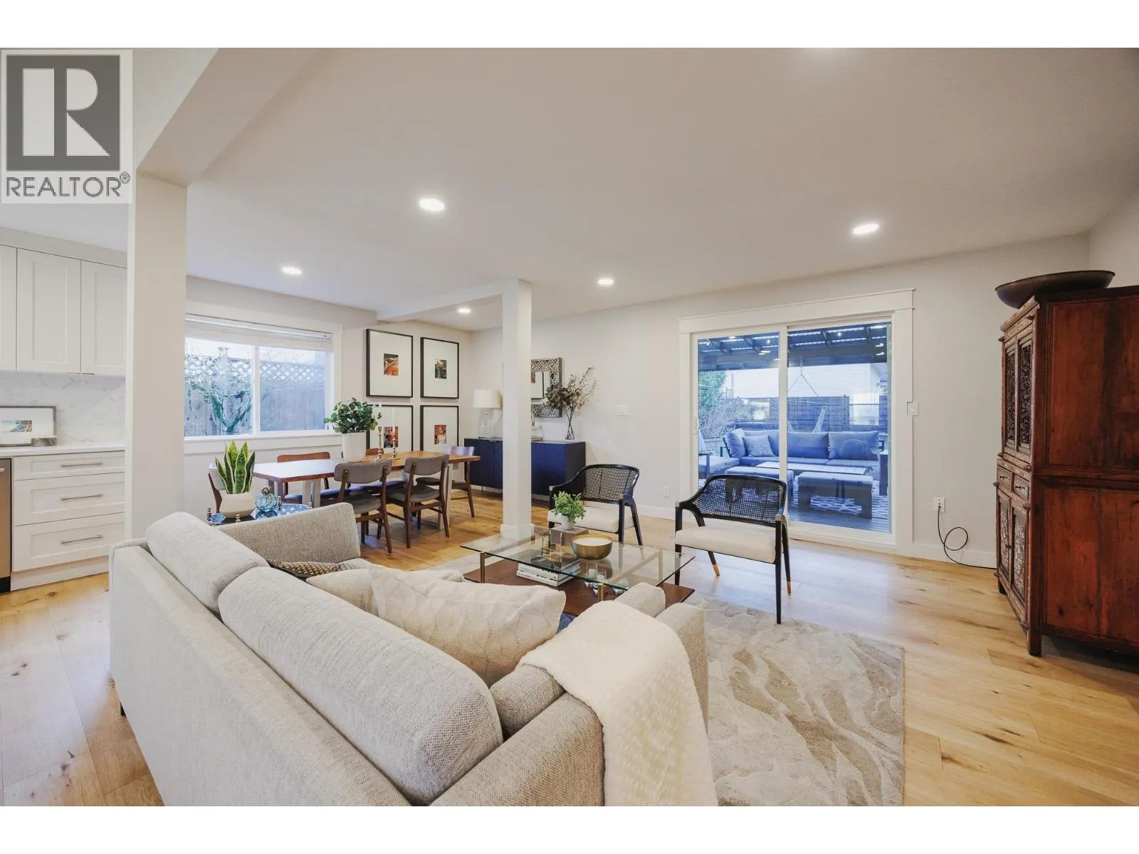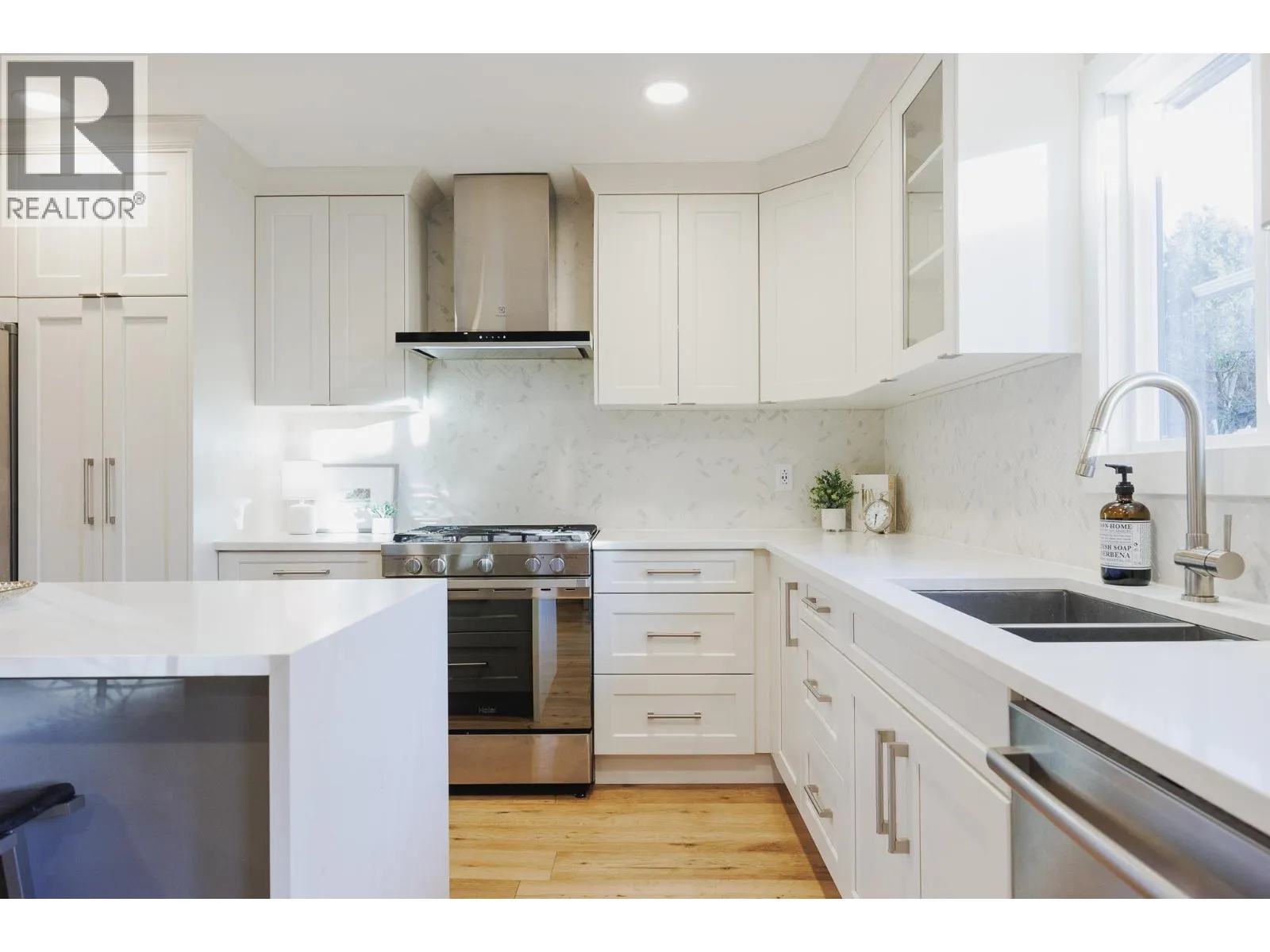 FAMILY FRIENDLY! This tastefully renovated home offers all the modern conveniences while enjoying the larger lot and mature landscaping of days gone by. Stunning kitchen featuring gleaming stone countertops, chevron tile backsplash, engineered wood floors, a massive island, an abundance of shaker cabinets and stainless appliance package including gas range. The large living room offers cozy comfort with a real