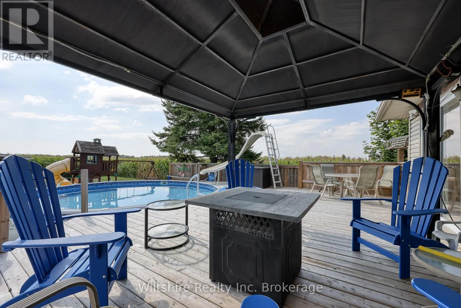 Set on almost half an acre and surrounded by a corn field, this 3-bedroom, 2-bathroom home offers privacy, space, and modern updates. This home is move-in ready and designed for comfortable country living. The main floor features an open-concept living and dining area with a built-in electric fireplace. A den with sliding doors opens to the south-facing deck and above-ground