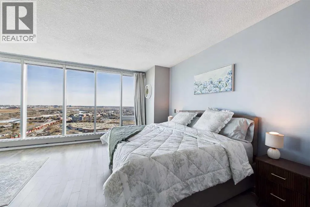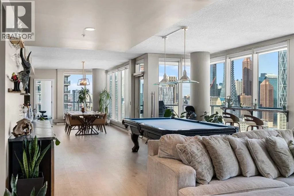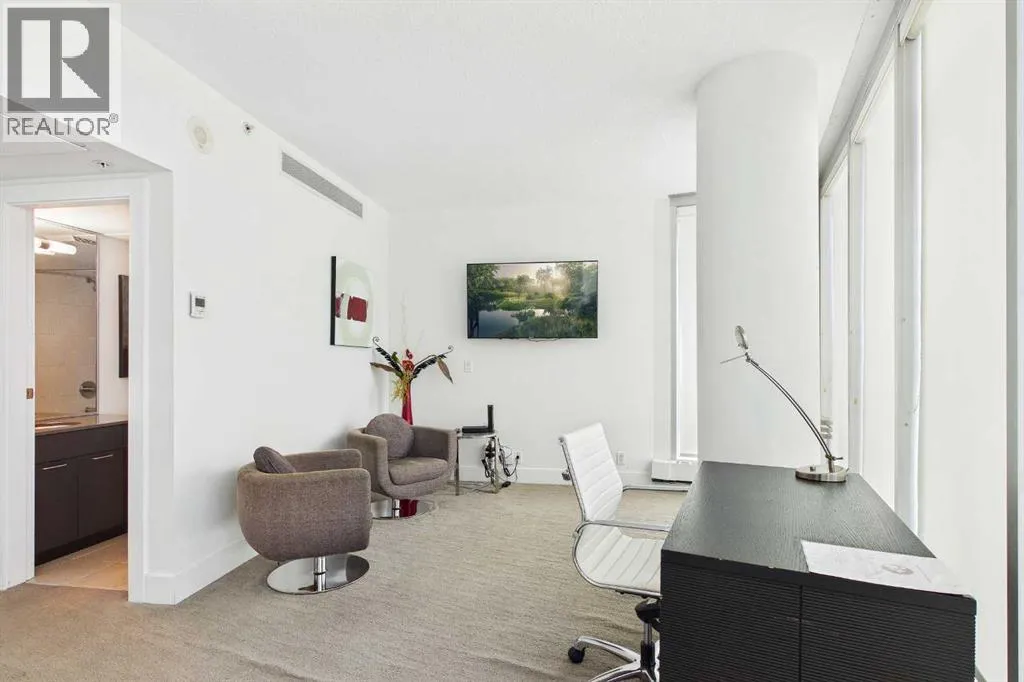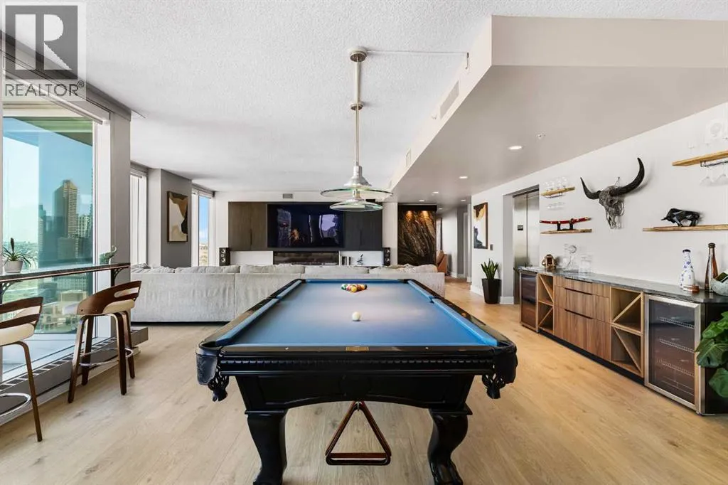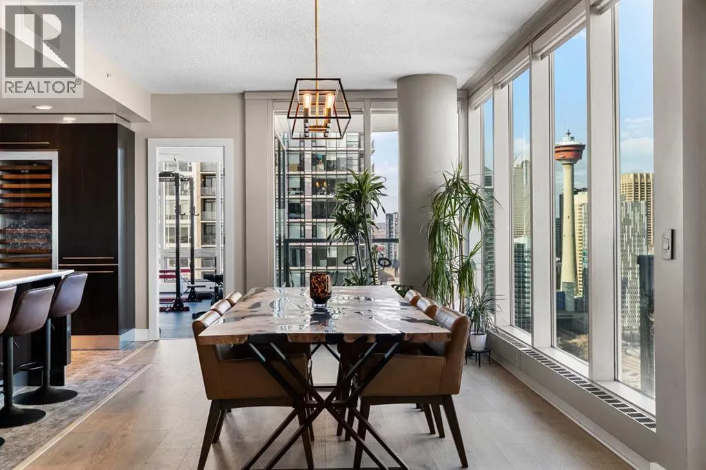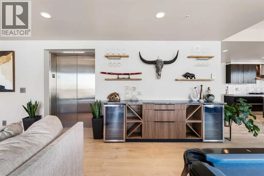 Your day begins with the soft glow of the morning sun spilling through floor-to-ceiling windows, offering panoramic views of downtown Calgary from the comfort of your bedside. After a workout in your private home gym and a coffee on one of your three expansive balconies, the gentle trickle of the custom stone waterfall in the living room creates a serene
