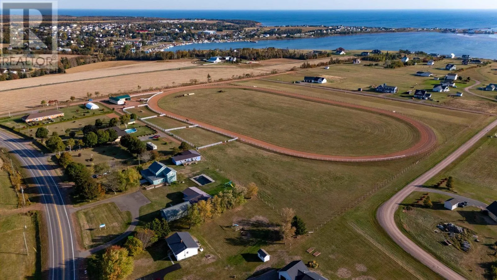 26 Gallant Lane (Harbourview Downs) is an 18-acre equestrian estate overlooking North Rustico Harbour, positioned at a higher elevation than the properties between it and the shoreline, offering expansive water views and a rare combination of infrastructure and approved development potential. The property features a well-maintained 750-metre fenced track, five fenced paddocks, and large enclosed pasture areas currently configured for