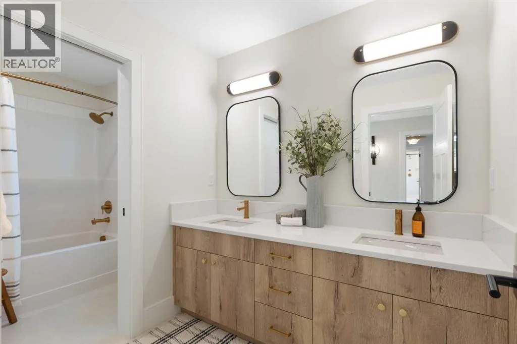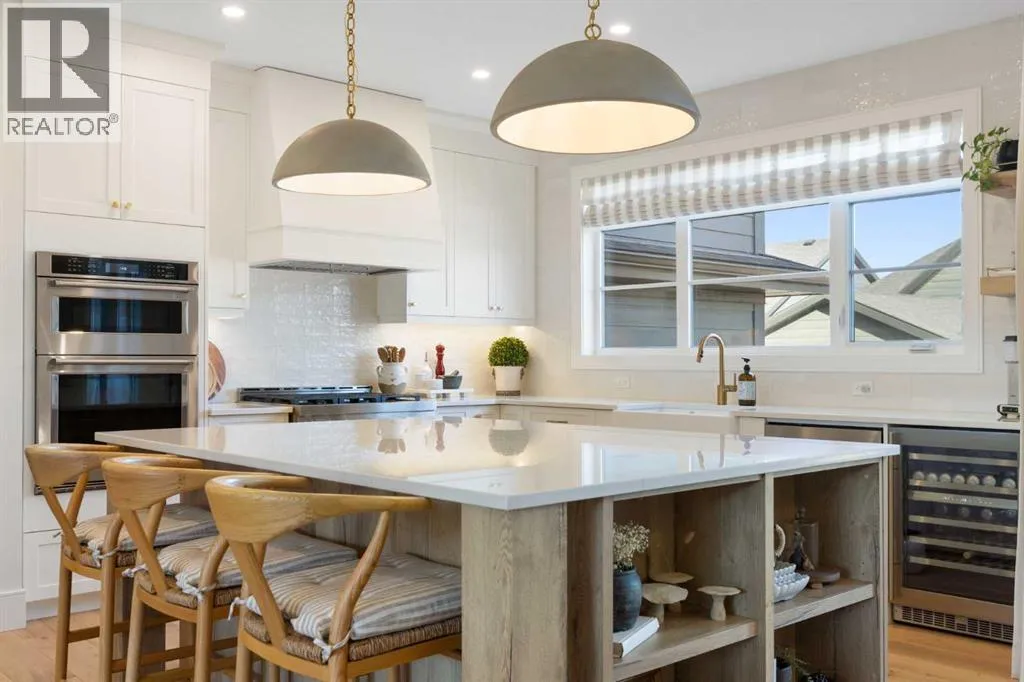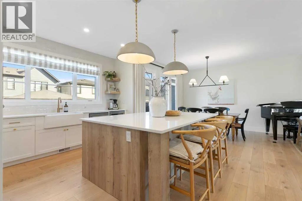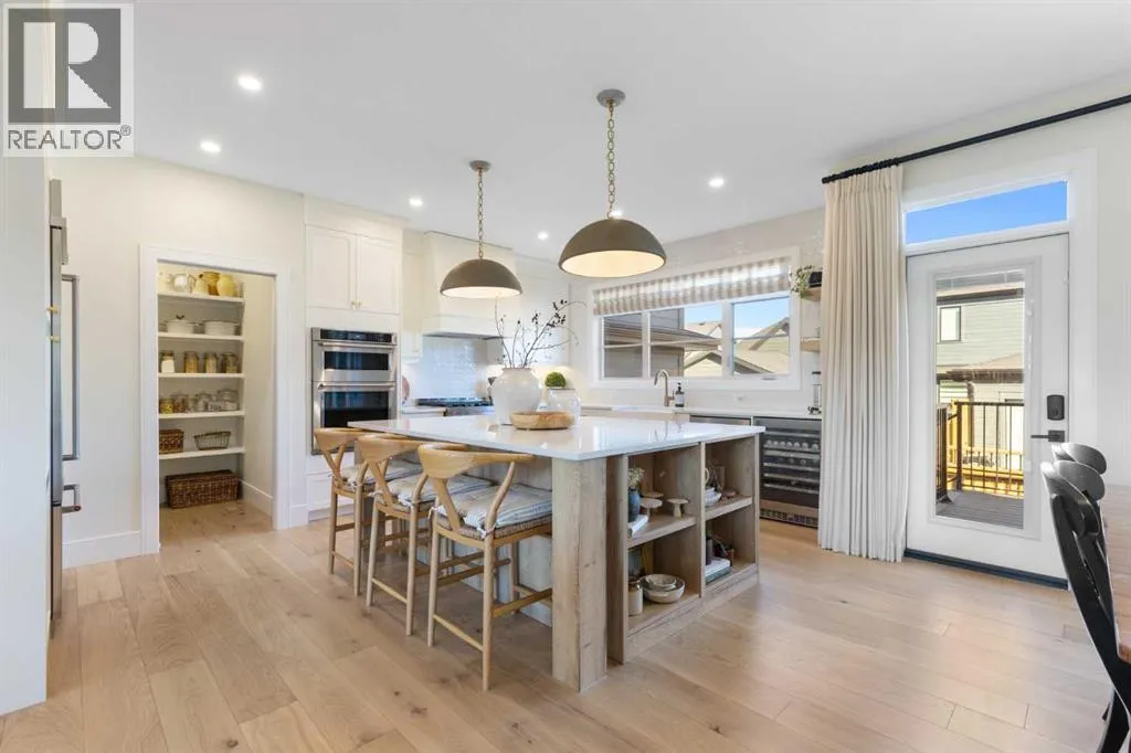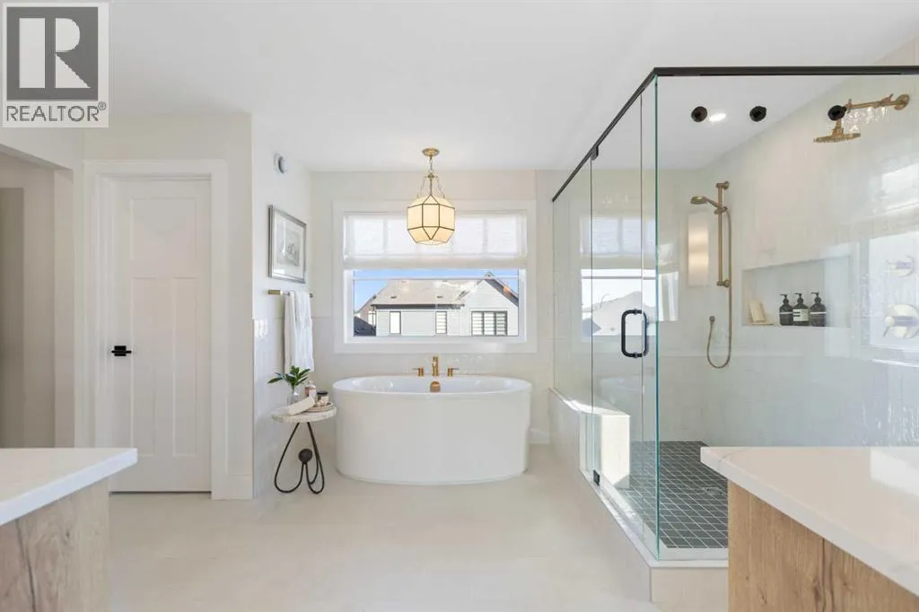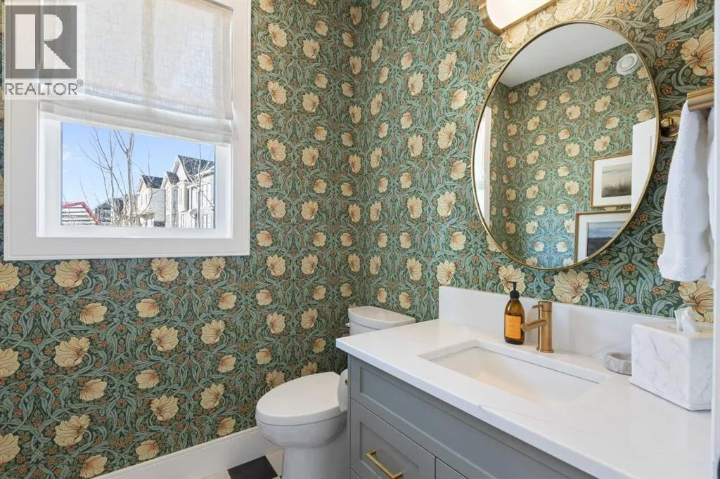 Set on an impressive 60 ft wide lot, the property enjoys peaceful park views from the front deck, living room, family room, and primary bedroom, with mature trees providing natural privacy, and offers over 3,600 sq ft of developed living space across three levels, showcasing outstanding craftsmanship and upgrades throughout while presenting like a builder’s showhome with the warmth and functionality of a true family home. Upon entry, you are immediately struck by the attention to detail and thoughtful design, with a bright main floor living room featuring large south-facing windows and a stunning floor-to-ceiling stone gas fireplace, flowing seamlessly into the heart of the home, a beautifully appointed kitchen with crisp white cabinetry, large island, stainless steel appliances, built-in oven, expansive north-facing window, and walk-in pantry. The spacious dining area is ideal for hosting large gatherings and features sliding patio doors leading to the upper deck and landscaped, fenced yard, along with a shaded lower patio perfect for summer relaxation. A stylish two-piece powder room and generous home office with park views and private deck access provide both convenience and versatility, while a custom-designed mudroom with closet and bench with lift-up storage completes the main level. The second level is a private retreat featuring a spacious family room with large park-facing windows, a unique bridge leading to the primary suite with expansive south-facing windows and a sliding barn door into the luxurious ensuite with dual vanities, large walk-in shower with dual shower heads, and elegant soaker tub. The custom walk-in closet connects to a well-appointed laundry room with folding counter and built-in sink, while two additional generously sized bedrooms and a five-piece main bathroom complete this level. The fully developed basement offers excellent additional living space with a large rec room ideal for teens, guests, or movie nights, a fourth bedroom, and a four-piece bathroom, plus rough-in plumbing for a future wet bar and an oversized utility and storage area for exceptional organization. The double attached garage is oversized in height, allowing for the potential addition of a vehicle lift or extra storage. Facing directly onto parkland, this home offers a quiet, traffic-free setting where you can relax on the front deck, enjoy your favorite beverage, and watch children play, delivering the perfect balance of luxury, comfort, and community-focused living in one of Calgary’s most exciting new neighbourhoods. (id:64429)
