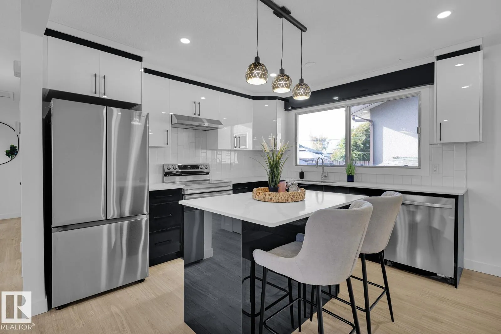 Fully renovated corner-lot bungalow located in a desirable neighborhood. The main floor features a bright living room with an electric fireplace, a modern kitchen with granite countertops and stainless steel appliances, three spacious bedrooms, and a fully upgraded bathroom. The fully finished basement offers a separate entrance, a kitchen, two bedrooms, and a bathroom. Additional highlights include a double car