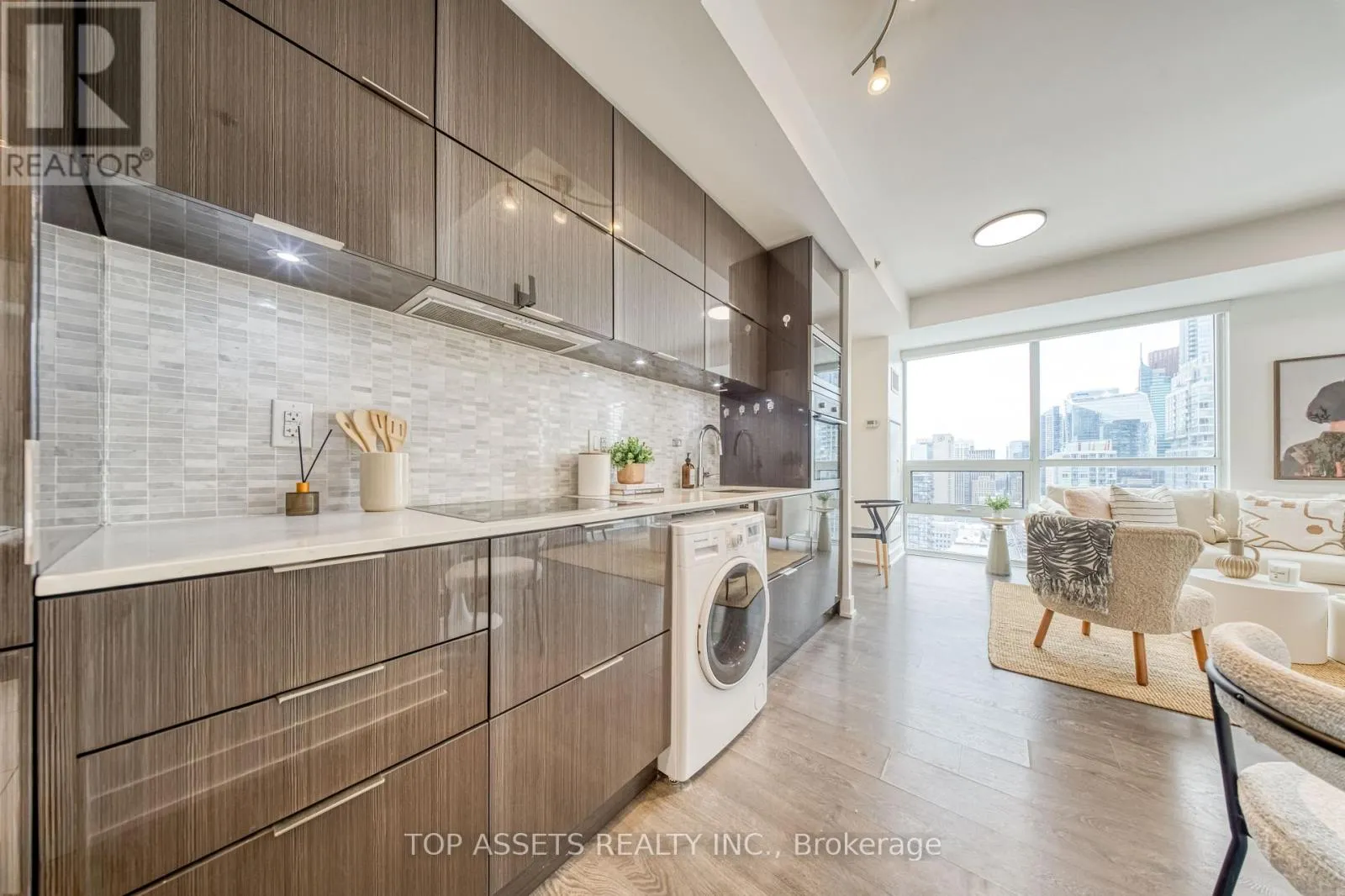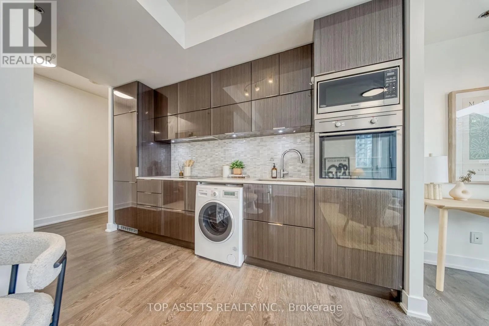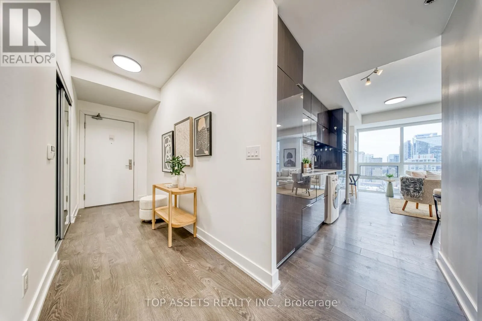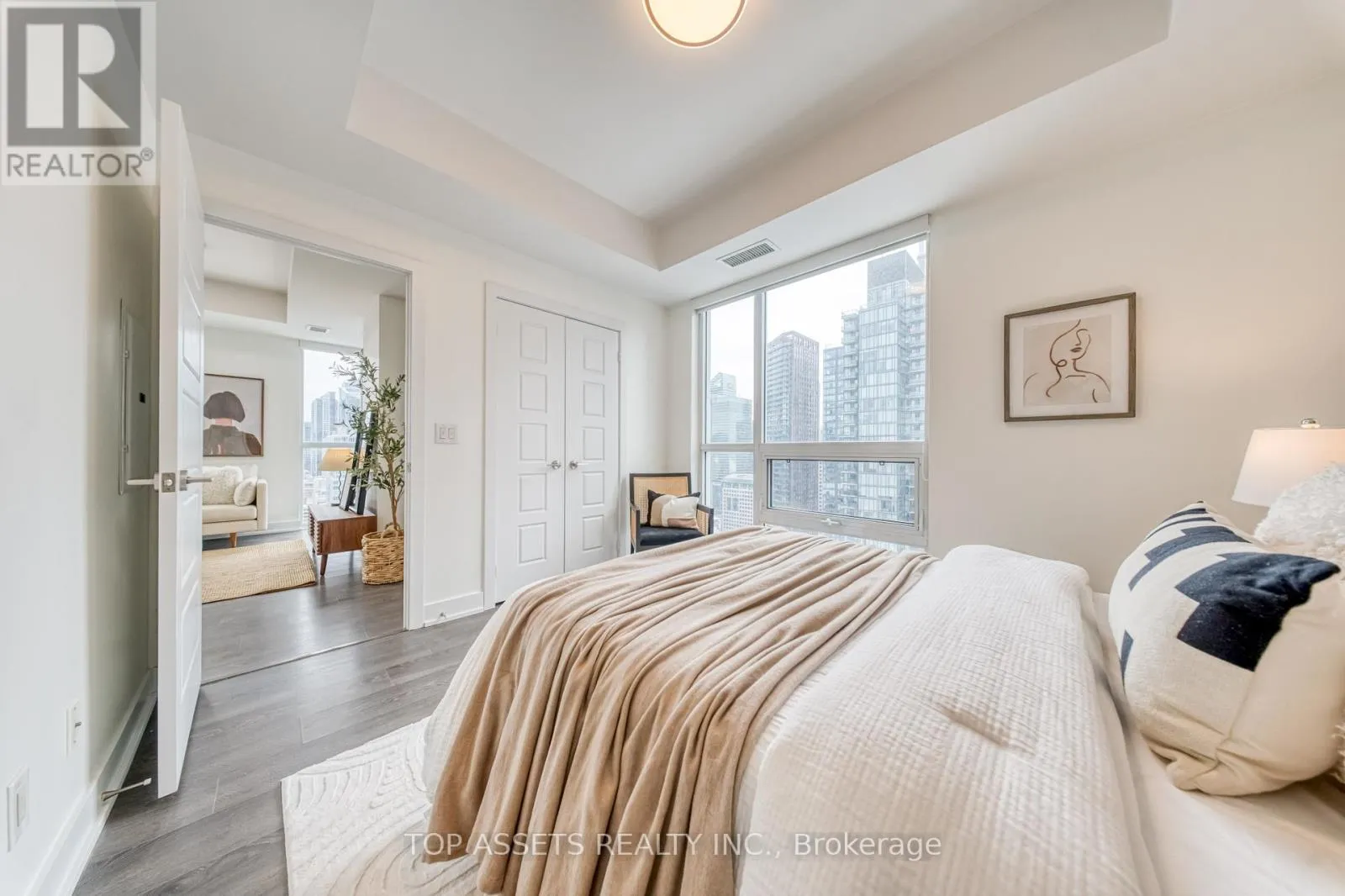 Enjoy a stunning southeast-facing panoramic view from this exclusive high-floor unit. This luxurious and bright south-facing 1+1 residence sits high above the city in the heart of Toronto’s Financial and Entertainment Districts, offering a highly functional layout with a spacious den. The thoughtfully designed den features smart use of space and a modern pendant light, creating a perfect area for