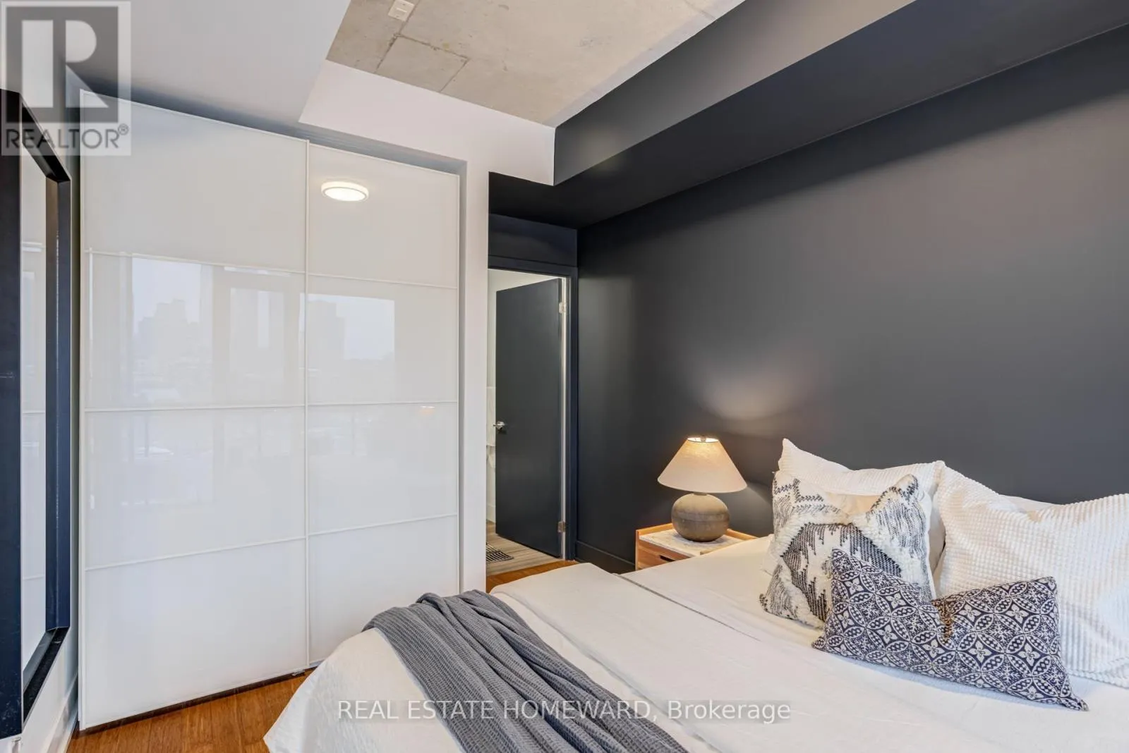 TRINITY LOFTS IN CORKTOWN / Rarely available, sun-filled suite with a highly functional open-concept layout in one of Corktown’s most sought-after boutique loft buildings. Features include outfitted wardrobe closets (included), engineered hardwood floors, and 9-ft exposed concrete ceilings for a true loft feel. Spacious bedrooms with sliding glass doors and wall-to-wall west facing windows with roller blinds throughout. The stylish