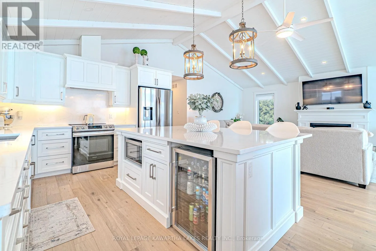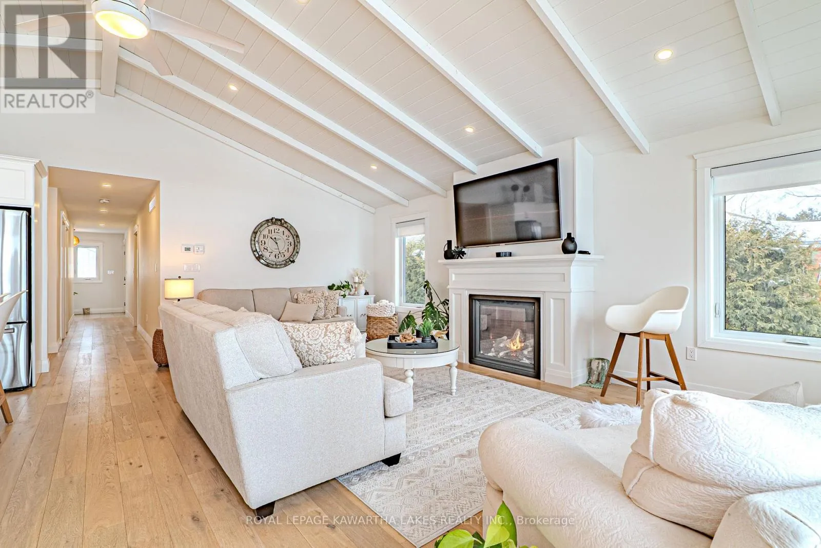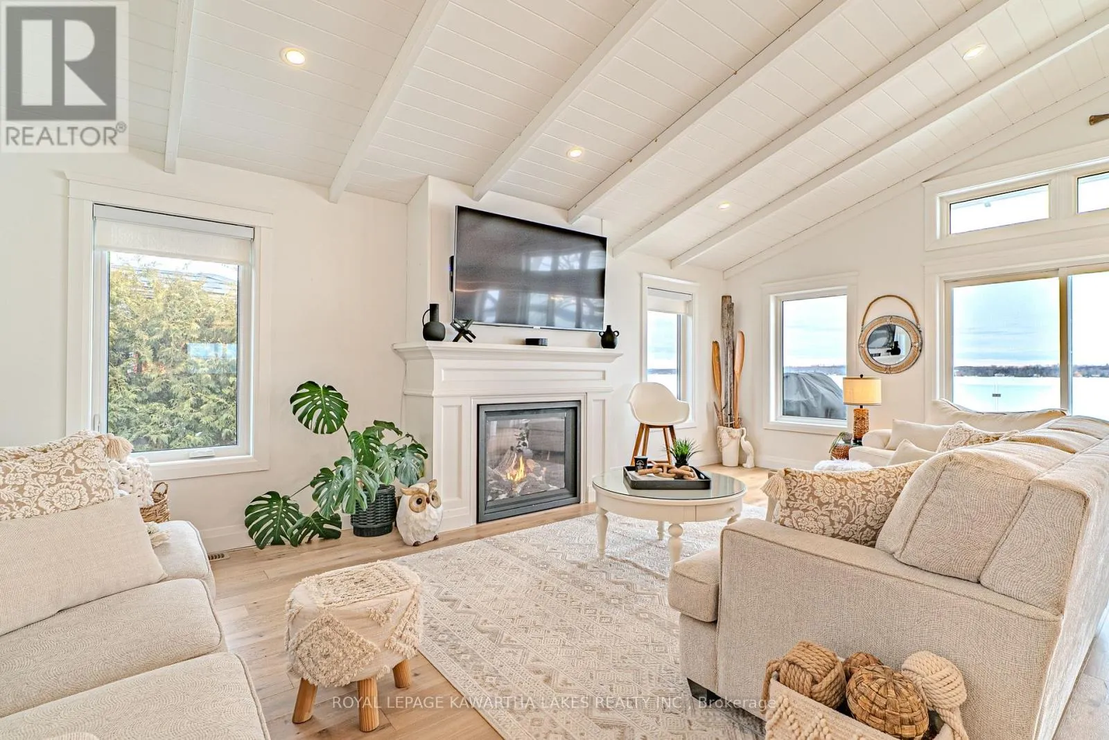 Welcome to effortless waterfront living on sought-after Sturgeon Lake. With 50 ft of clean, sandy shoreline and a private dock, this property offers the perfect blend of relaxation and year-round comfort. Step inside to a bright, airy foyer that opens to a stunning open-concept living space designed around the view. The custom white kitchen features a substantial 5.5 x 7.5