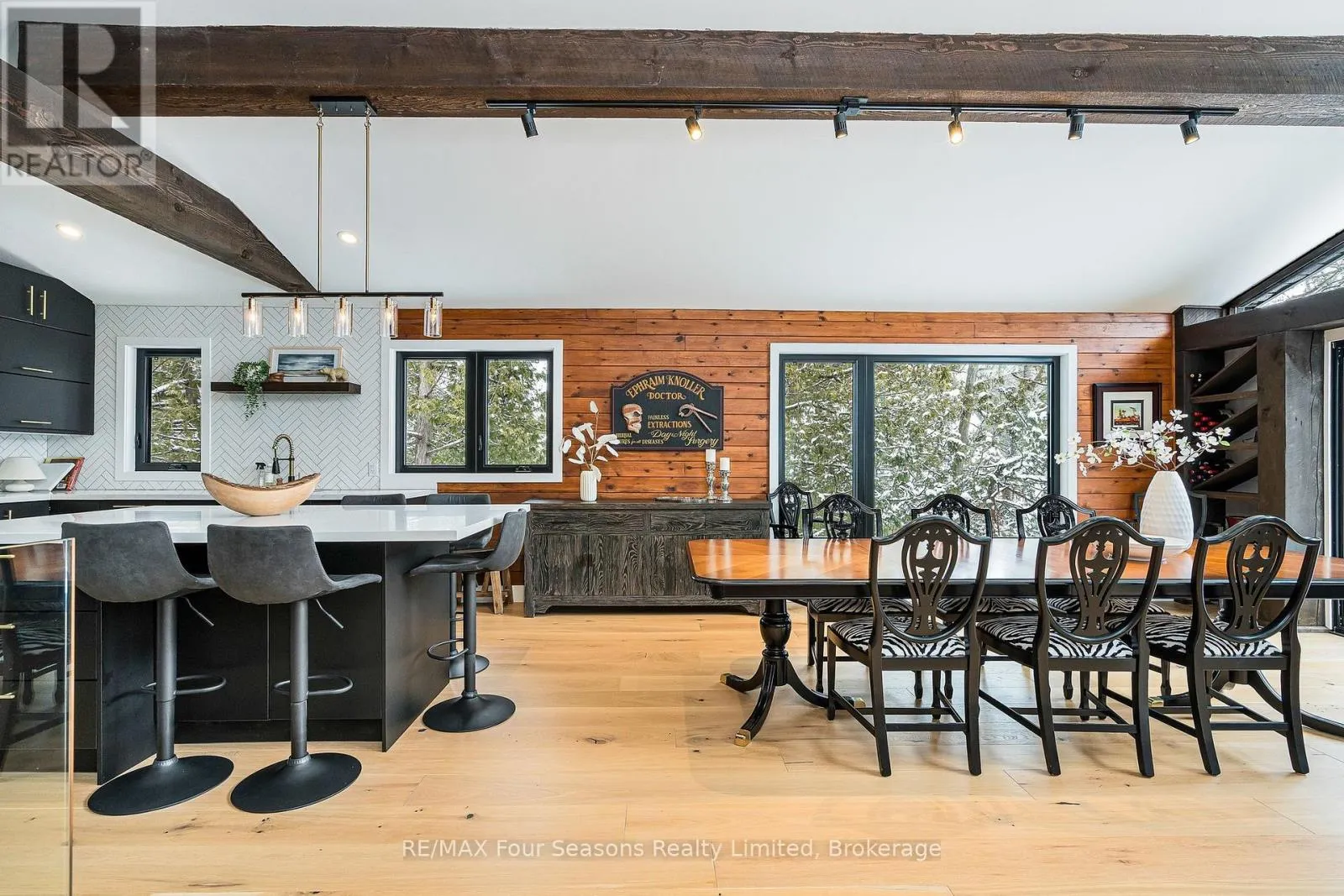 Completely renovated in 2022, this exceptional six-bedroom chalet offers the perfect retreat for families, extended families and friends. Set on a private lot in the highly sought-after Georgian Woodlands and designed with family and entertaining in mind, the bright open-concept great room features soaring vaulted ceilings and windows that frame tranquil views, where deer can often be seen meandering through