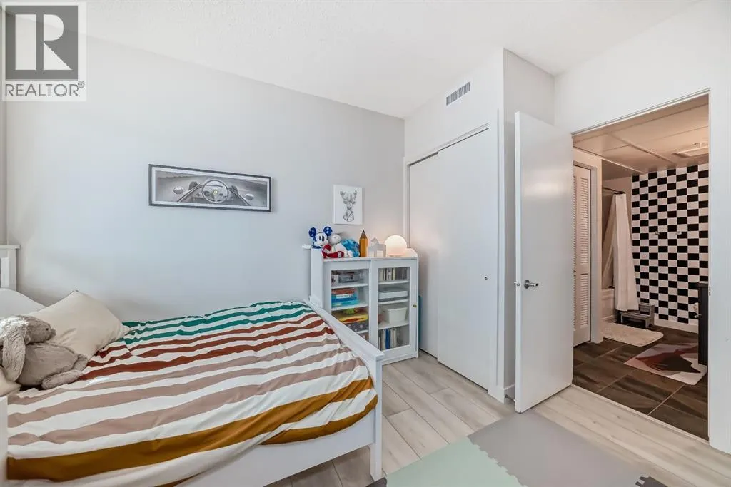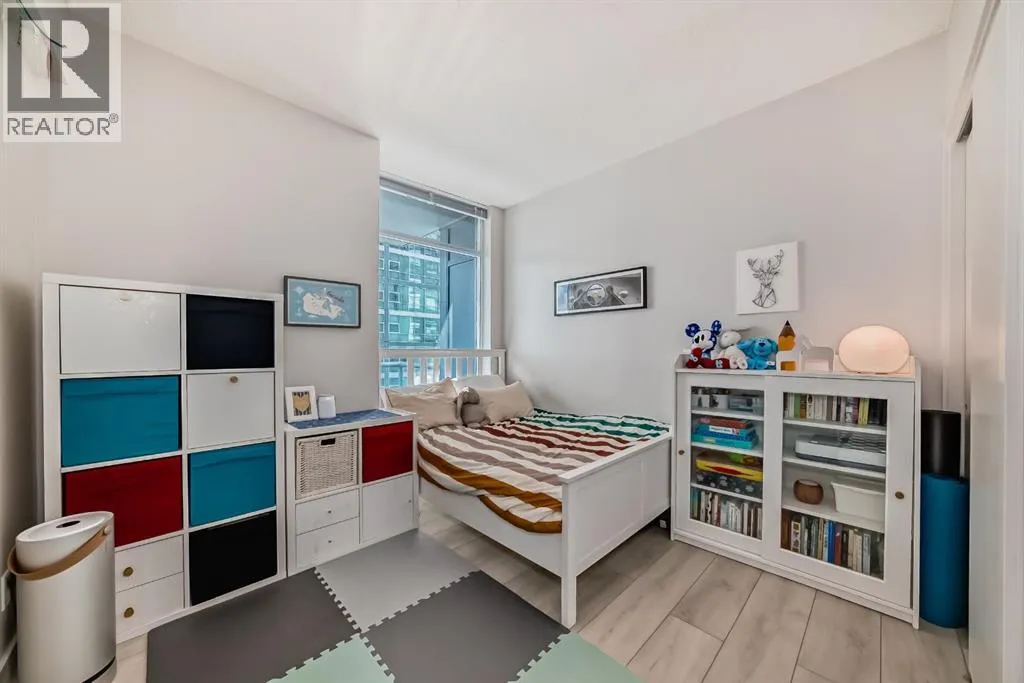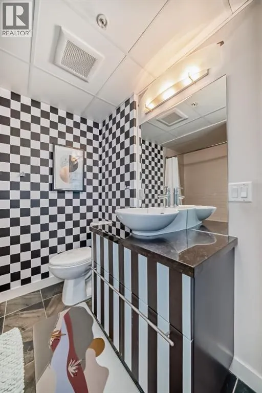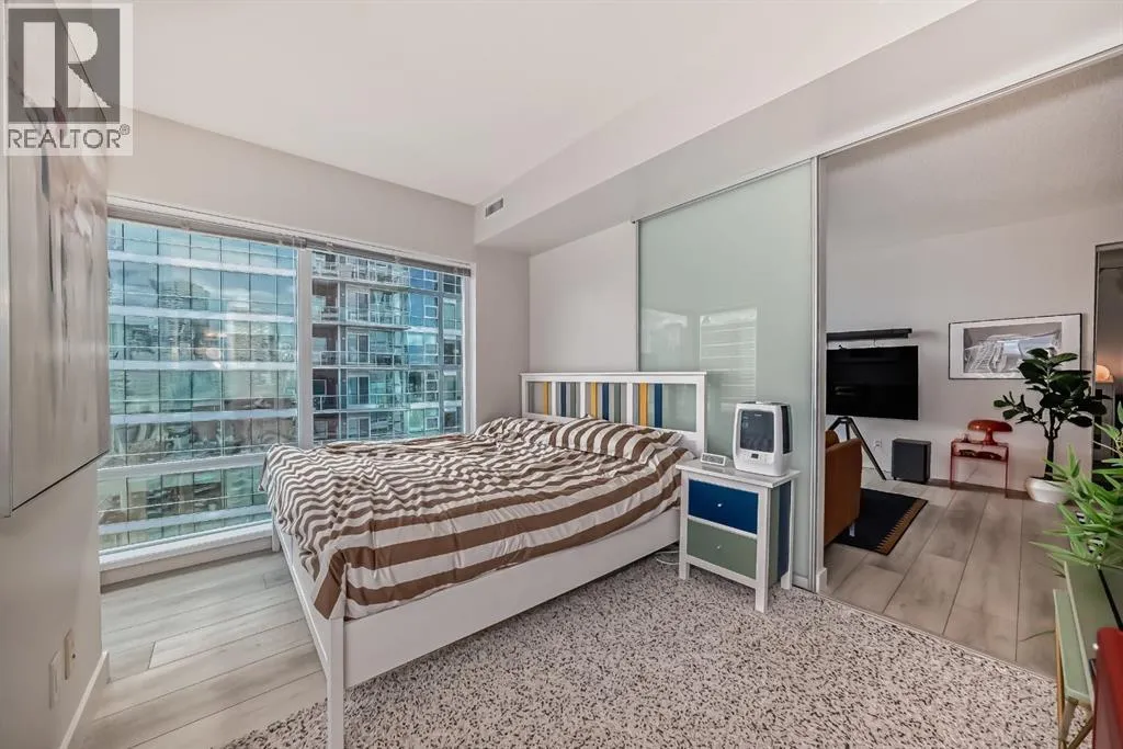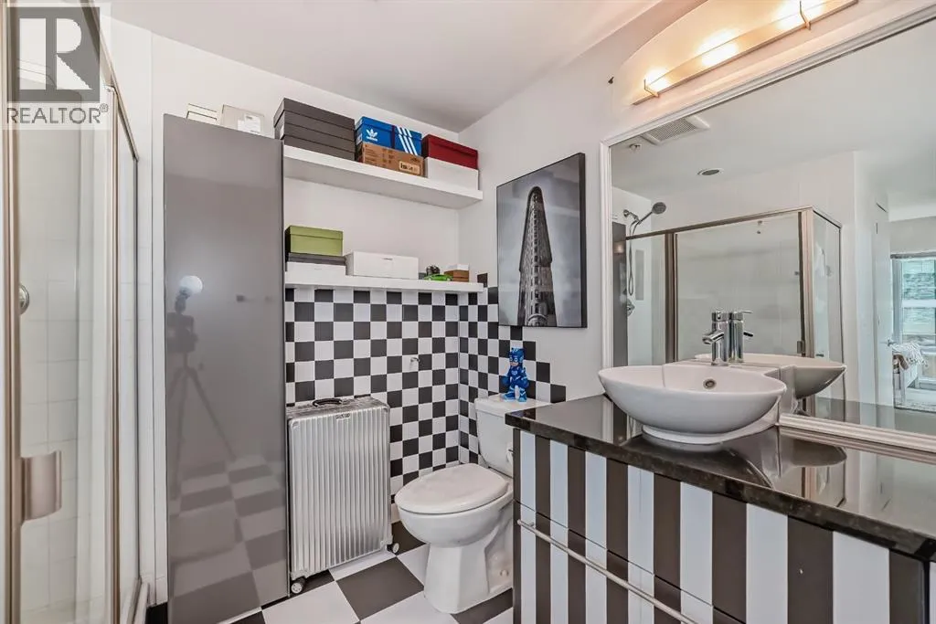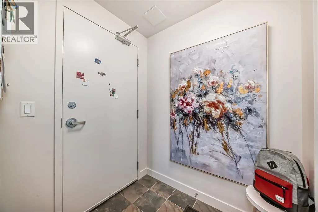 This revamped Union Square condo captures the essence of modern urban sophistication. Lofty ceilings and expansive windows flood the space with natural light while framing breathtaking views of Downtown Calgary. The kitchen is a contemporary masterpiece, featuring an industrial-chic design with a black, white, and stainless-steel color palette. The upgraded light grey vinyl plank floors and statement lighting, including funky