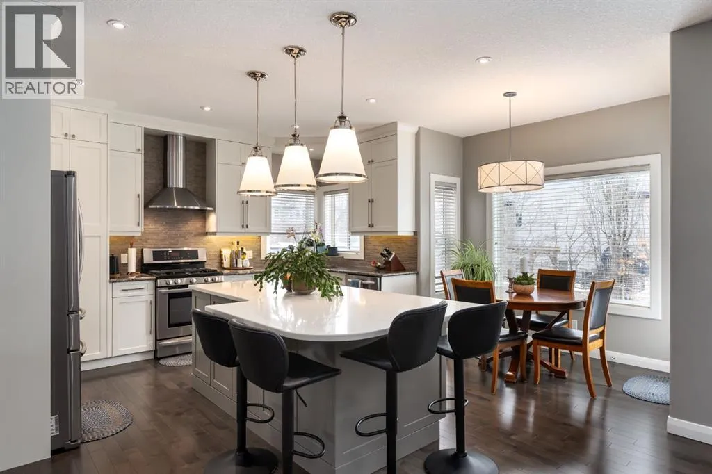 natural light, and thoughtful design. A bright south-facing backyard captures sun throughout the day, creating an inviting outdoor retreat framed by mature landscaping, a professionally finished patio, and a low-maintenance composite deck with modern railings completed in 2021. The exterior has been meticulously cared for over the years, including routine fence upkeep and a treated shake roof professionally serviced on a consistent three-year schedule.Upon entry, you are welcomed by a striking custom staircase set beneath dramatic open foyer, softened by plush carpeting and an immediate sense of warmth and scale. The main floor unfolds gracefully with gorgeous hardwood floors from the elegant front sitting room into a formal dining area, continuing into the beautifully renovated kitchen and breakfast nook before opening to a second inviting living space. A thoughtfully positioned main floor office and functional mudroom complete the level, all framed by refined nine-foot ceilings and cohesive design elements introduced during the comprehensive 2016 renovation. The custom kitchen serves as the heart of the home, showcasing granite countertops, a quartz island, and floor-to-ceiling cabinetry, seamlessly connected to the living room where a gas fireplace creates architectural presence and comfort. Updated flooring, railings, ceilings, and designer lighting further enhance the timeless aesthetic throughout.Upstairs, the home transitions into a true retreat. The expansive primary suite offers a luxurious escape with its own lounging area and custom walk-in closet, leading to a stunning five-piece ensuite featuring dual sinks, a deep soaker tub, and a custom glass-enclosed shower. Two additional generously sized bedrooms and custom 3pc bathroom complete the upper level, all bathed in abundant natural light and designed with the same attention to detail and quality craftsmanship found throughout the home.Mechanical upgrades offer both comfort and peace of mind, including a high-efficiency furnace, central air conditioning, and a newer hot water tank. Additional features such as a Culligan water softener and an app-controlled smart garage door opener (2021) add everyday convenience. The expansive sunshine basement remains untouched, already equipped with a bathroom rough-in and ready for future customization.Quietly located yet exceptionally connected to Calgary’s premier pathway network, this home delivers a rare combination of mindful upkeep, modern upgrades, and long-term potential — an ideal setting for comfortable living today and effortless growth into tomorrow. L (id:62650)