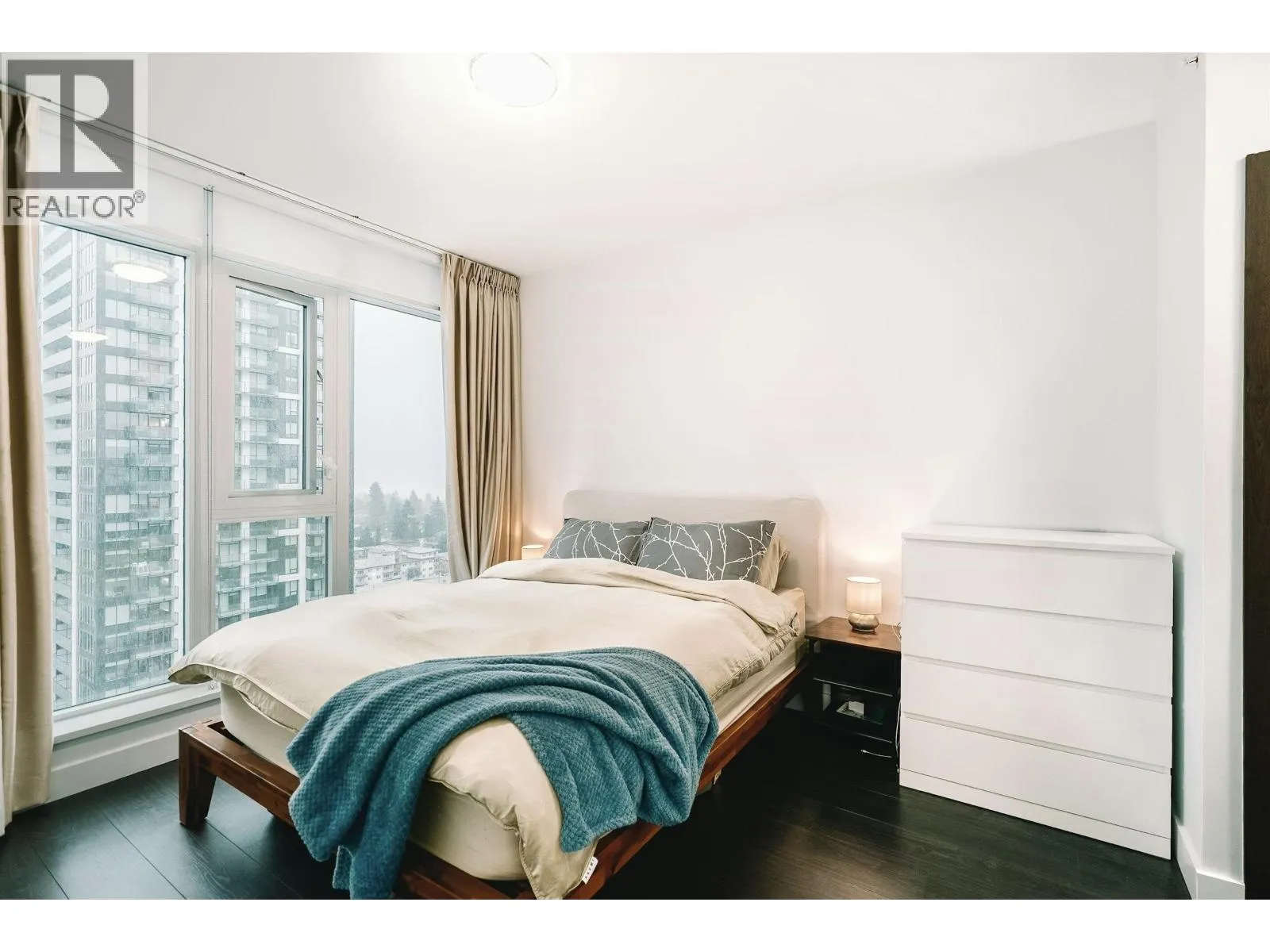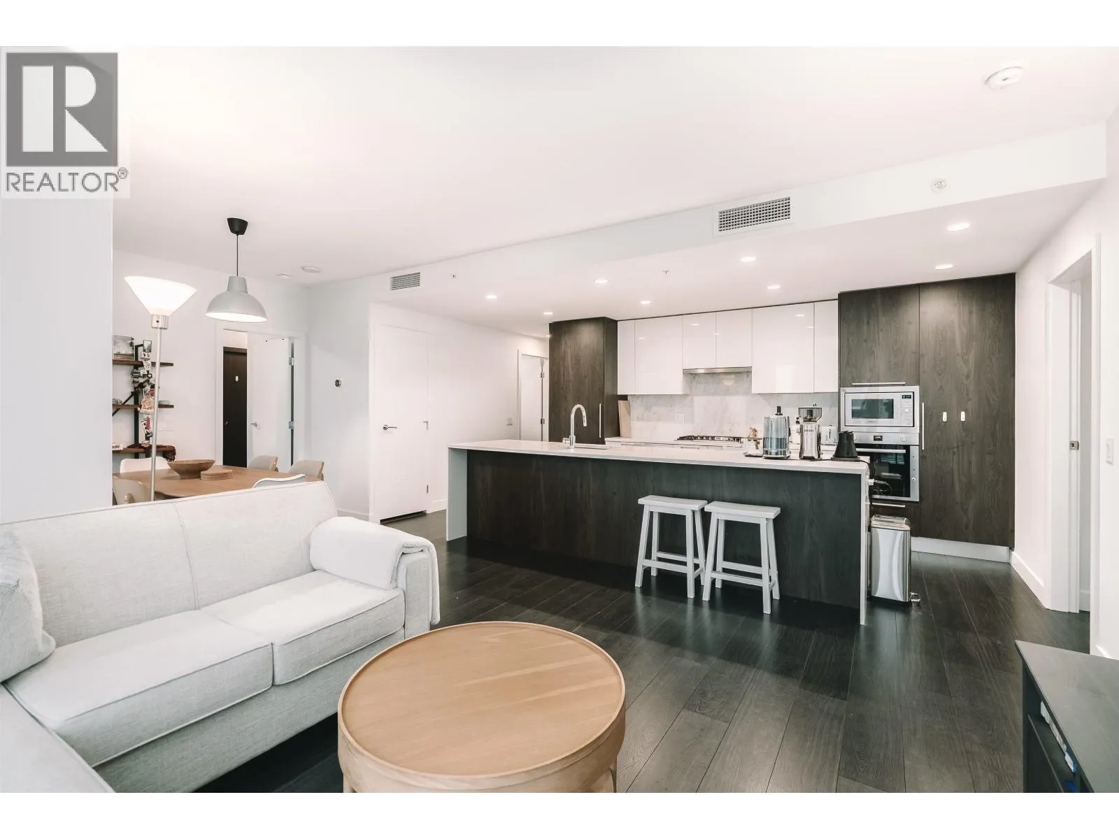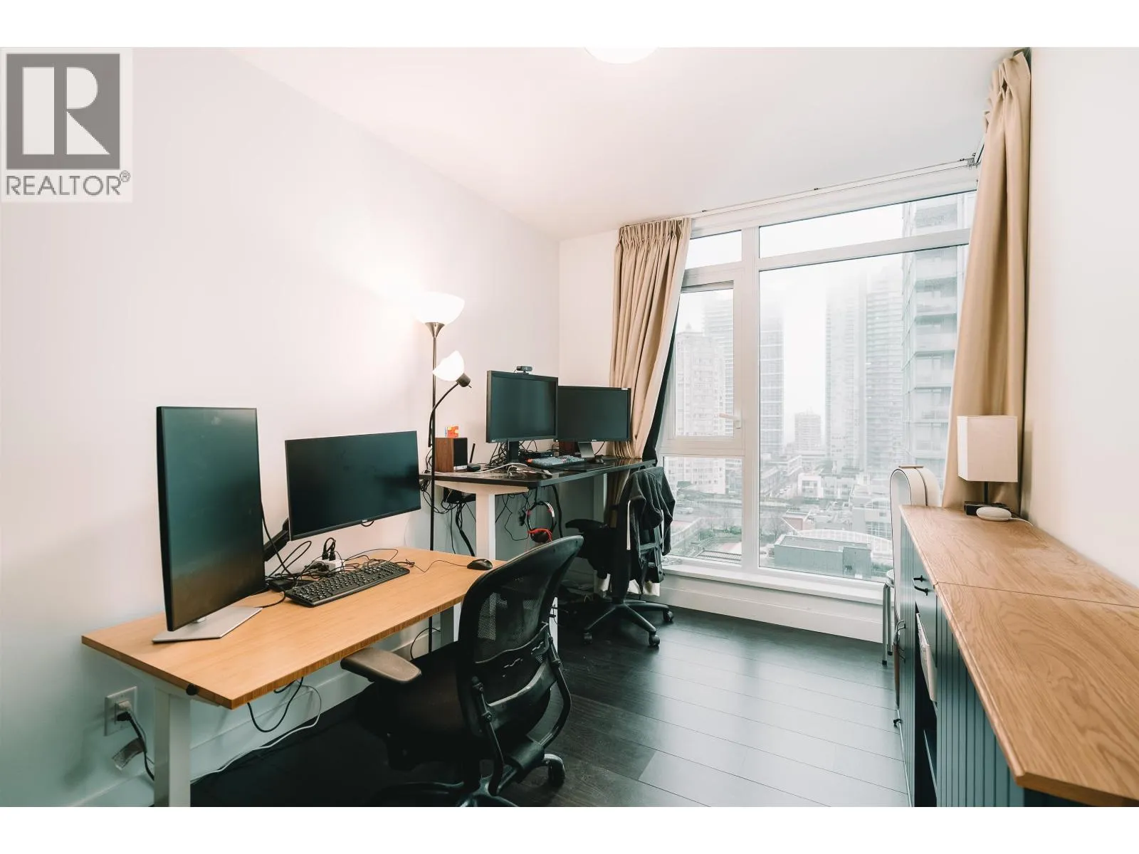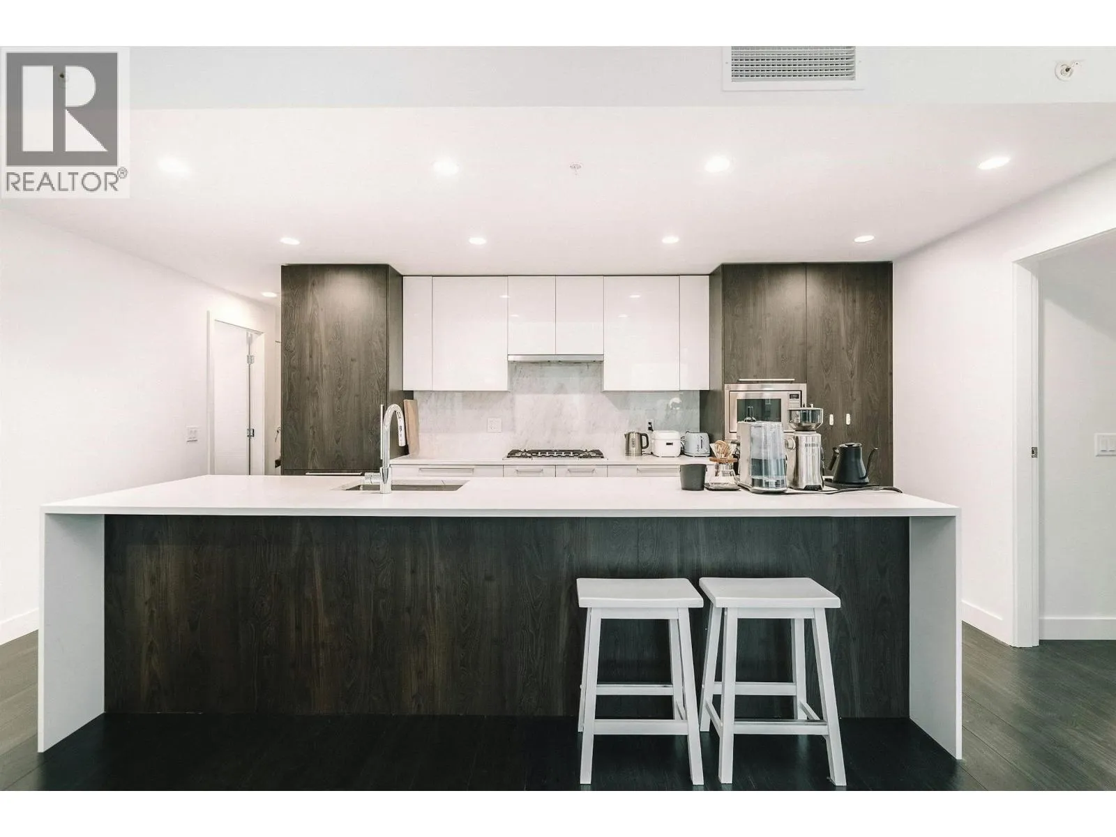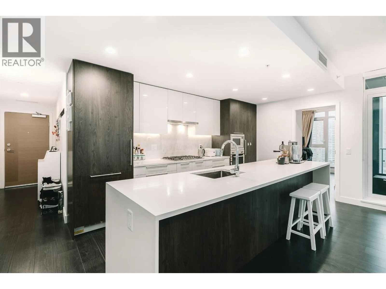Set high above the energy of Metrotown, this air-conditioned 2 bedroom corner unit home at Sun Towers 2 delivers elevated urban living with a thoughtfully designed layout. Expansive windows frame sweeping views, while two generous balconies invite seamless indoor-outdoor enjoyment. The kitchen makes a statement with sleek cabinetry, quartz surfaces & Bosch appliances around a substantial island. The primary suite