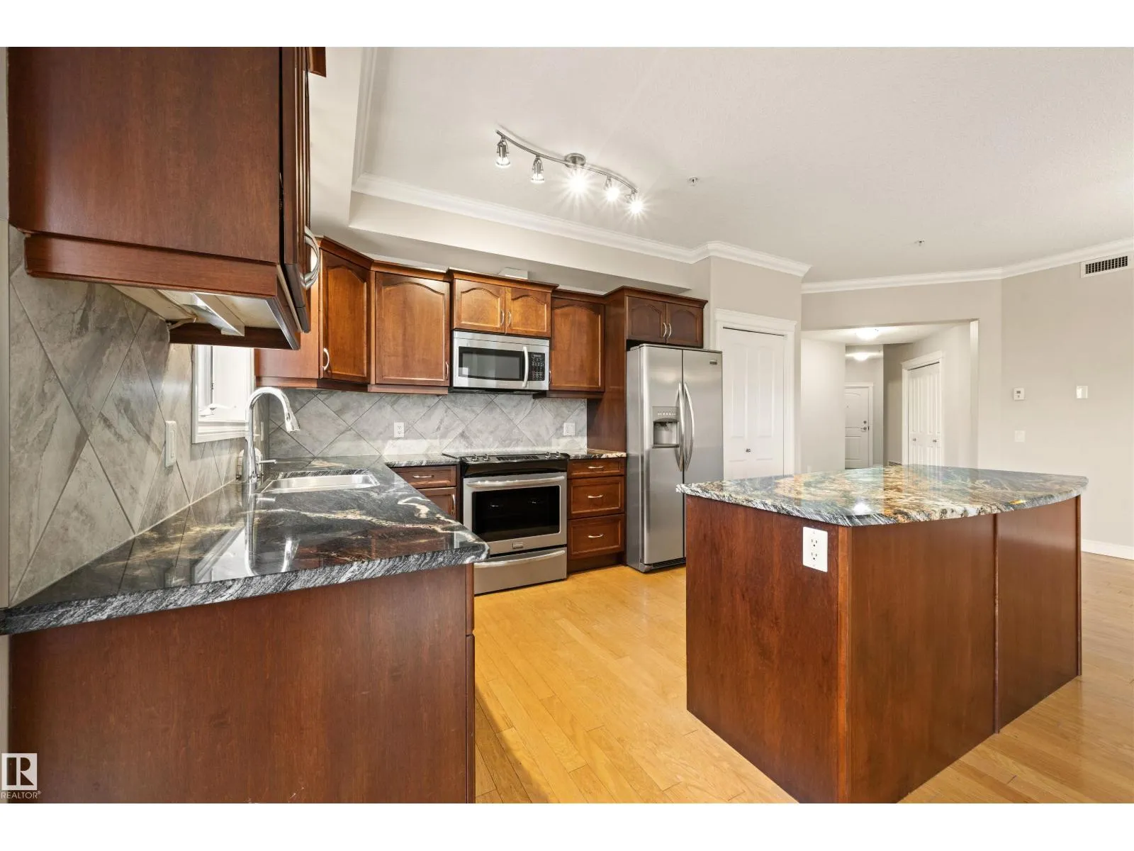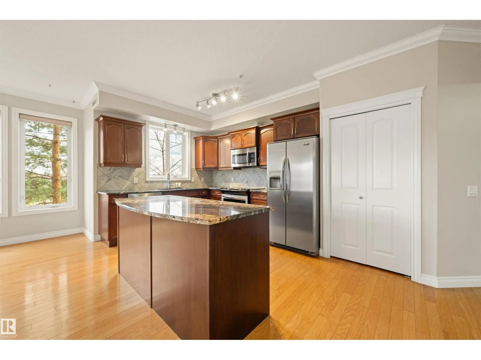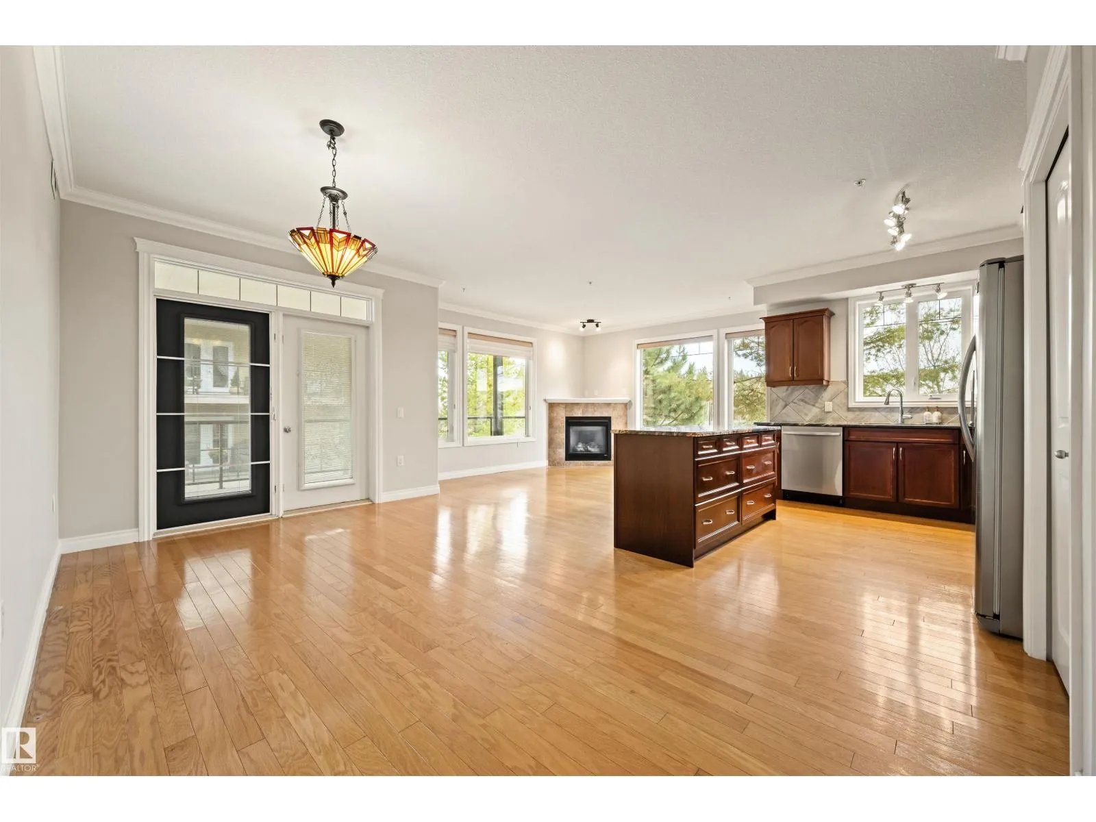 Welcome to this sophisticated and highly coveted corner unit with central A/C in this adult (18+) condo building. A stylish, private foyer welcomes you into the elegant dining area and open-concept layout. Newer luxury hardwood flooring flows throughout the space. The bright kitchen features stainless steel appliances, a pantry, and an island, while 9′ ceiling and large windows flood the