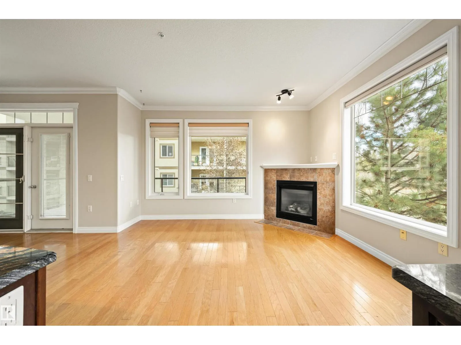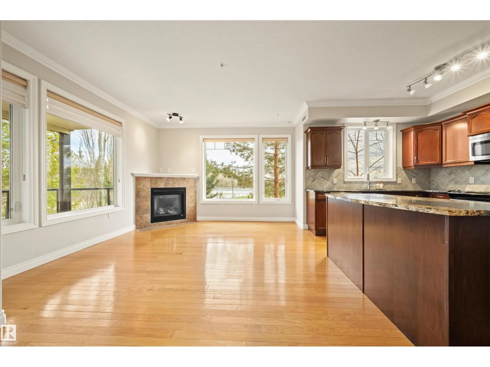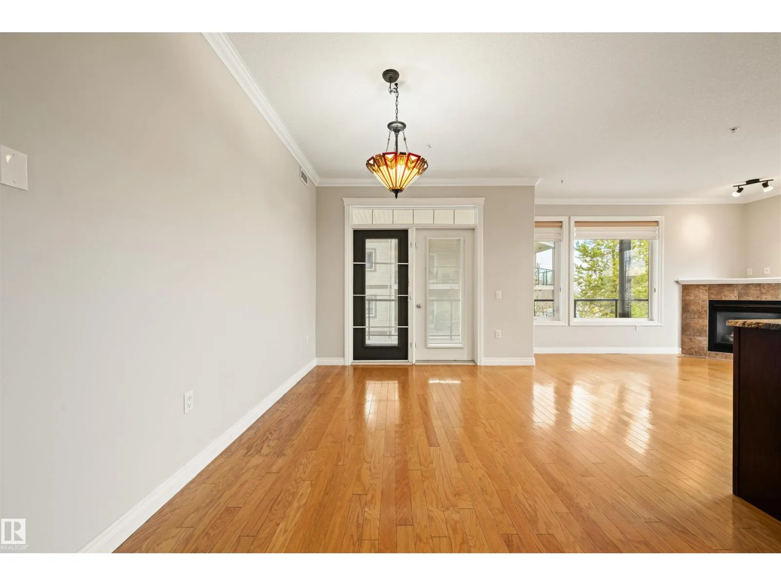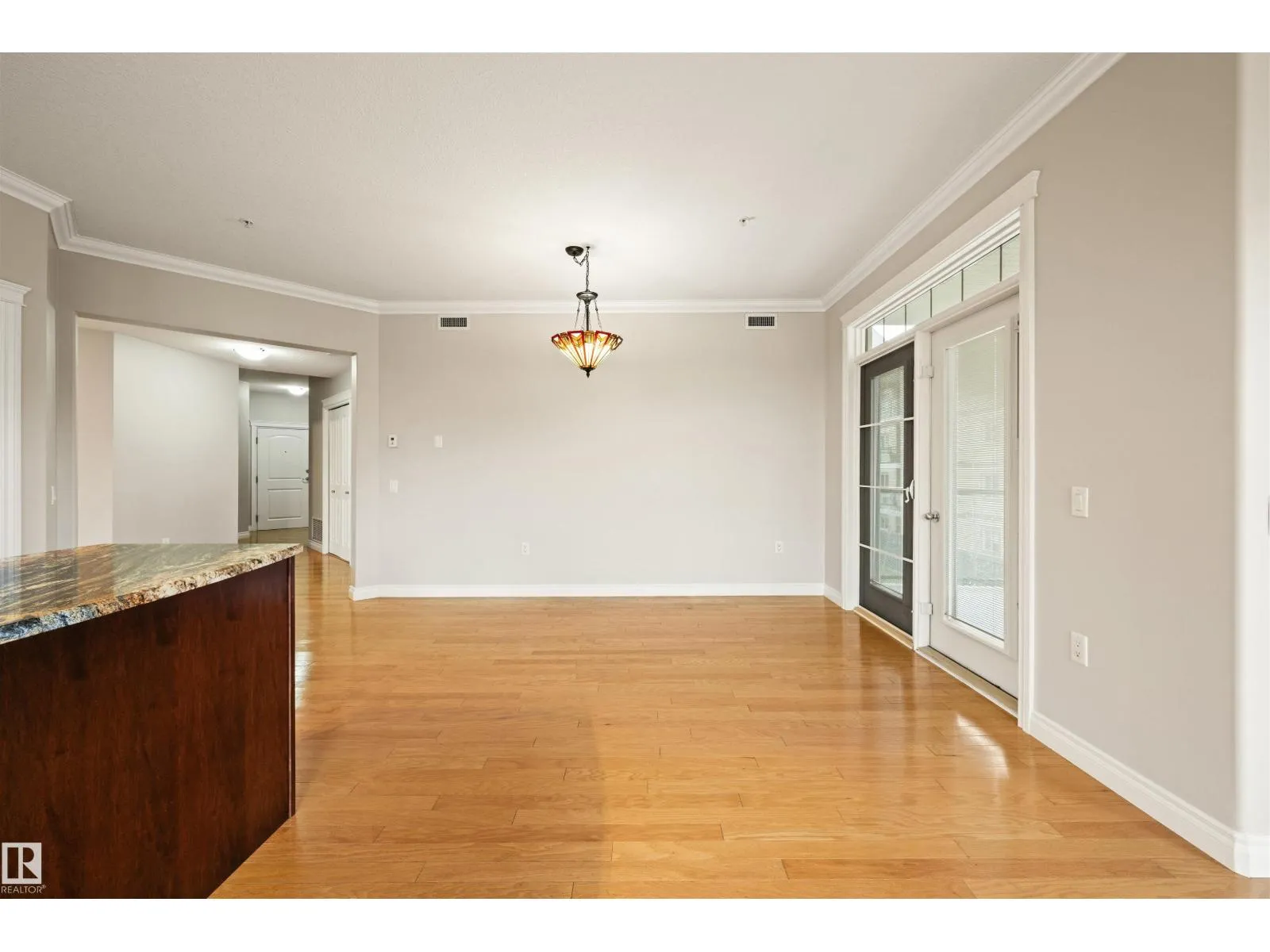 Welcome to this sophisticated and highly coveted corner unit with central A/C in this adult (18+) condo building. A stylish, private foyer welcomes you into the elegant dining area and open-concept layout. Newer luxury hardwood flooring flows throughout the space. The bright kitchen features stainless steel appliances, a pantry, and an island, while 9′ ceiling and large windows flood the