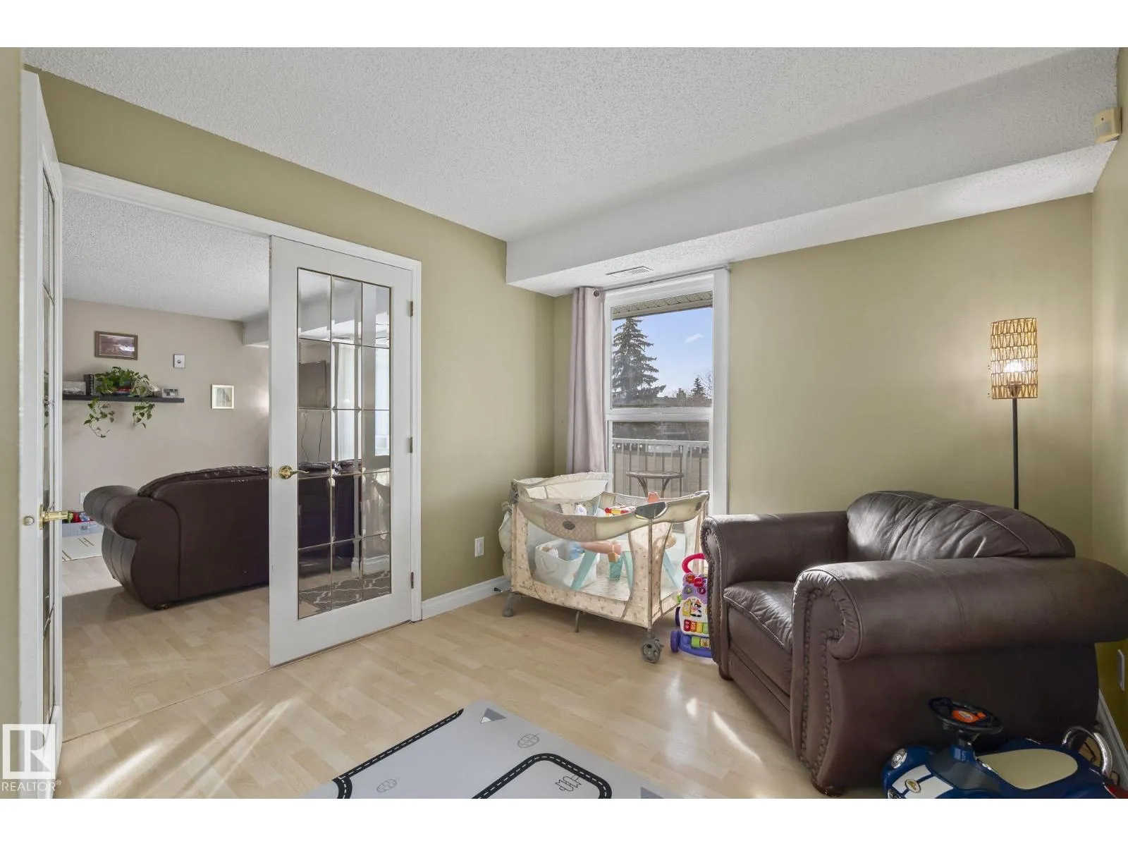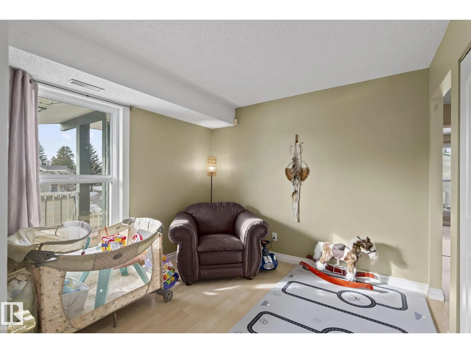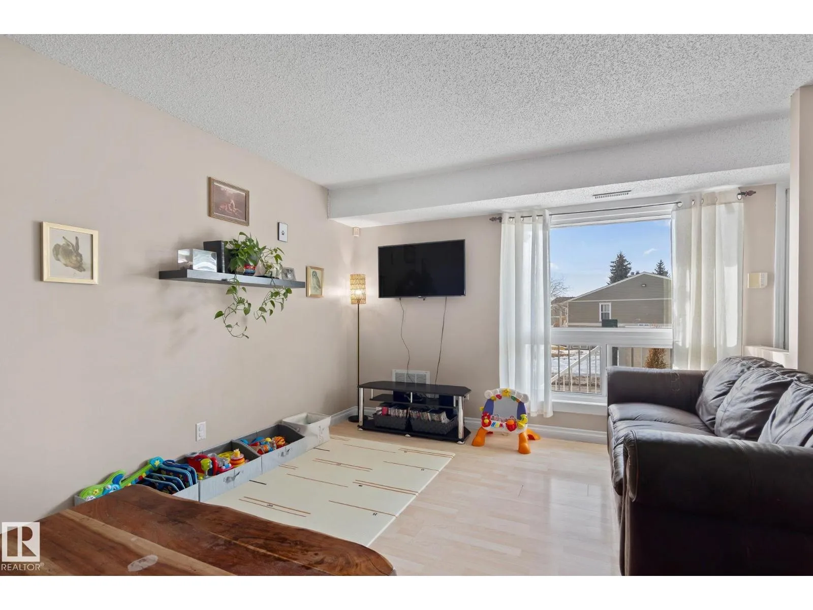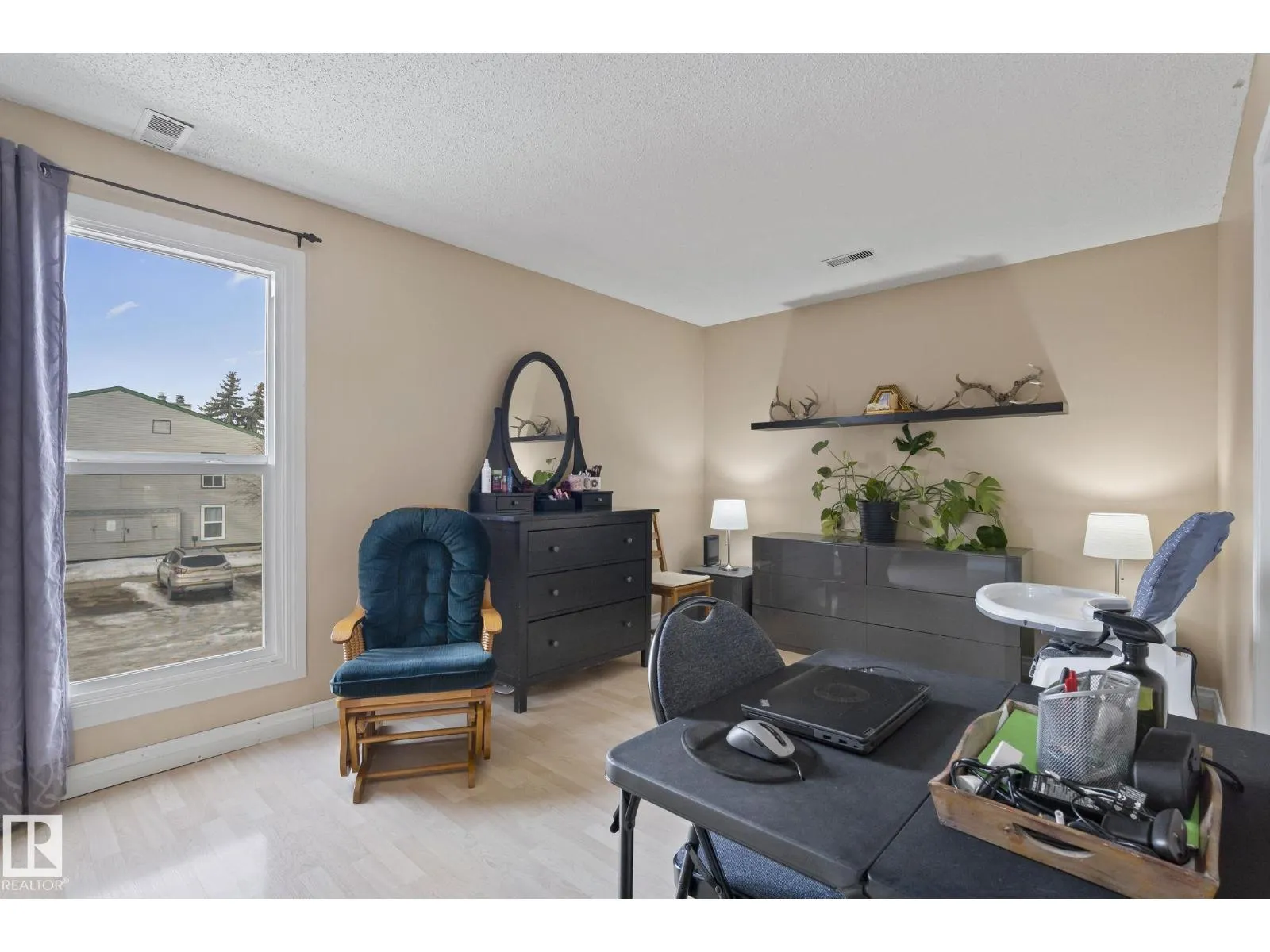 Top-floor, south-facing 2 Bedrooms + DEN all on ONE LEVEL carriage-style condo in Skyrattler, Edmonton AB – ideal for Homeowners or Investors! SPACIOUS 1042 SQ.FT. FLOOR PLAN. Only carriage home on the block with a Fully Private, UNSHARED BALCONY – a Rare find offering added privacy. LOADS OF NATURAL LIGHT and DEN can CONVERT TO A 3rd ROOM with window,