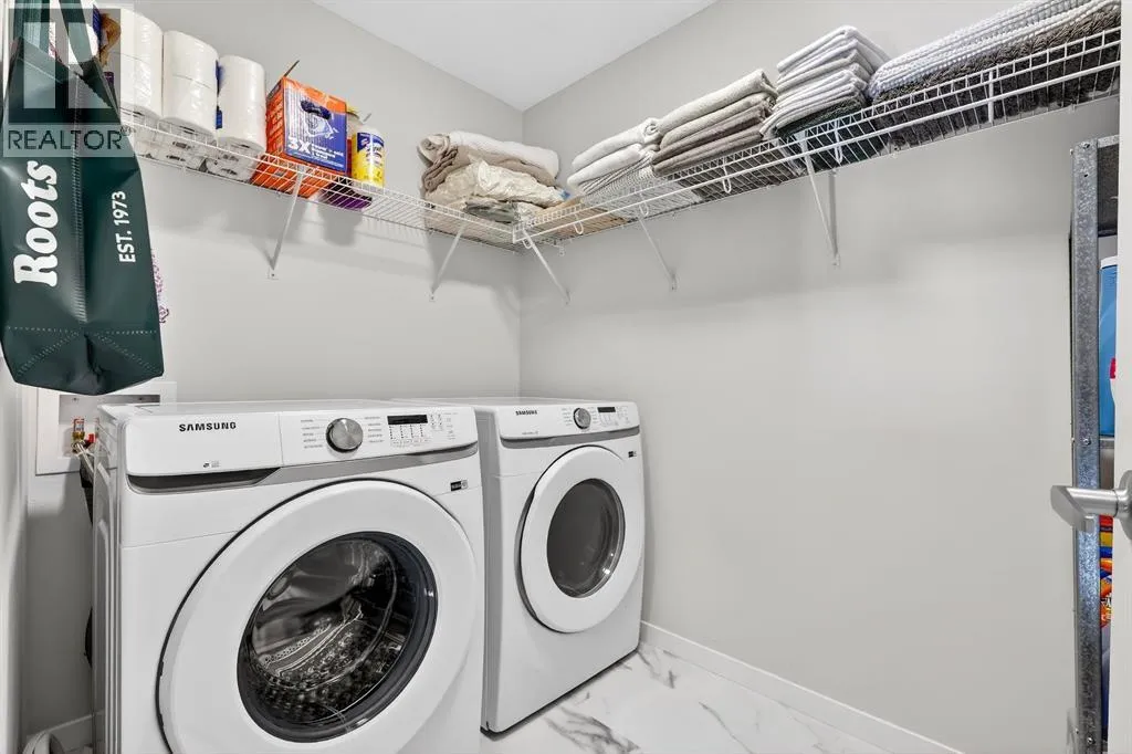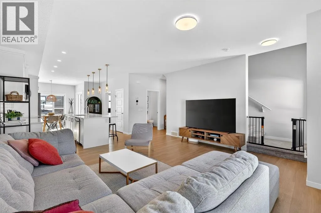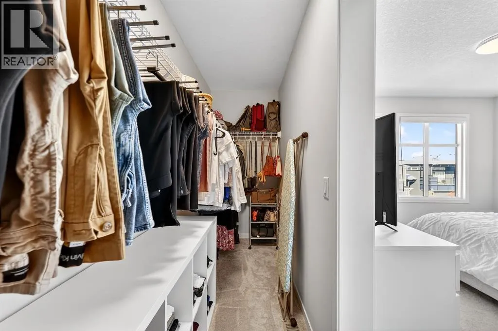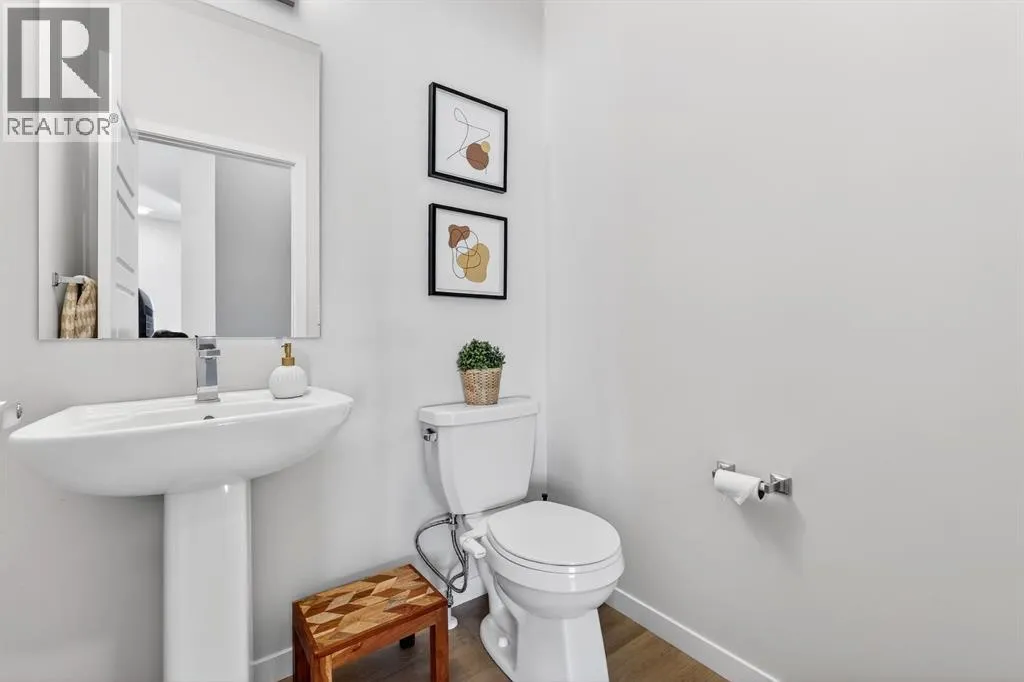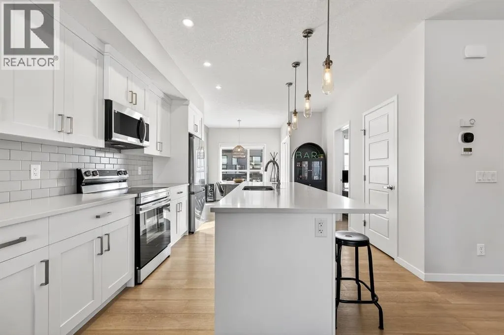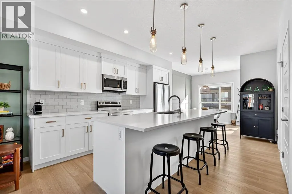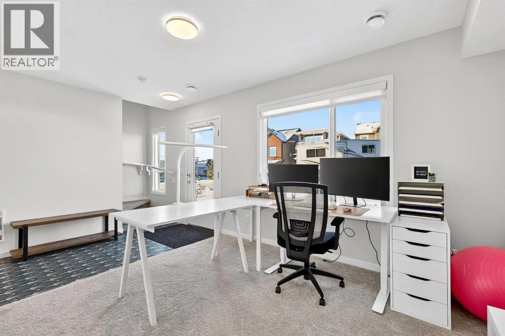 the moment you enter, a versatile flex space on the first level unfolds with possibility, ready to become your home gym, studio, executive office, or private retreat. Upstairs, 9-foot ceilings and an open-concept layout create a sense of expansiveness, while natural light beams through both east and west-facing windows, illuminating the luxury vinyl plank flooring. The kitchen is both refined and functional, featuring stainless steel appliances, full-height cabinetry, a large pantry, and a breakfast bar island that naturally becomes the heart of the home. An enclosed office overlooking the glass-railed balcony offers an inspiring workspace with serene pond views, while the balcony’s gas line makes outdoor entertaining effortless. A roomy half bath completes this thoughtfully designed level.The third floor delivers privacy and comfort, with a spacious laundry room offering additional storage and a west-facing primary bedroom that captures warm afternoon light. The deep walk-in closet and elegant ensuite – complete with dual sinks, quartz countertops, and an oversized shower – create a daily ritual of calm and convenience. Two additional generously sized bedrooms share a well-appointed four-piece bathroom, providing flexibility for family or guests. Beyond aesthetics, this 2022-built Cranston townhome is equipped for the future with a brand new air conditioner, hot water on demand, a heat recovery ventilator, fibre optic high-speed internet, and an oversized insulated double attached garage with a double driveway comfortably fitting four vehicles. The garage is already equipped with an electrical panel for a future EV charger, blending practicality with forward-thinking design. Visitor parking within the complex and additional street parking ensure convenience for guests, while pet-friendly policies with board approval make it easy to bring every member of the family home. Overlooking a scenic wet pond and located near the river pathways of Fish Creek Park, shopping, schools, and everyday amenities, this home offers easy access to the ring road and Deerfoot Trail, connecting you seamlessly to the rest of Calgary. (id:64429)