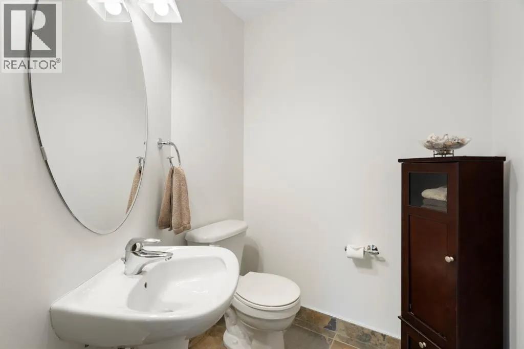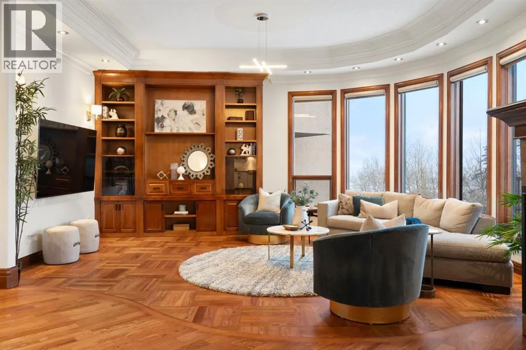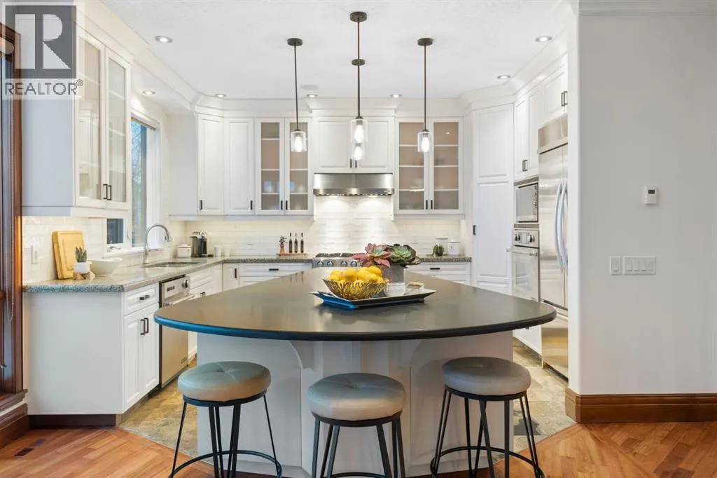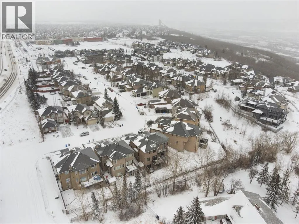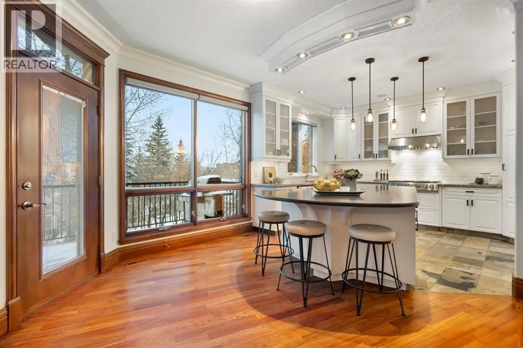 modern lighting throughout. At the heart of the home, an expansive spiral staircase serves as a stunning architectural centre piece, elegantly connecting the levels and creating a striking first impression the moment you step inside. The stylish white kitchen, renovated in 2017, is designed for both everyday living and entertaining. It features two-toned quartz countertops, stainless steel appliances, a gas stove, under-cabinet lighting, and a corner pantry for added storage. The main floor features hardwood flooring, a dedicated home office, and a functional walk-through locker-style closet accessible from both the front entry and garage — ideal for busy families. The spacious main floor laundry room includes a sink, cabinetry, and built-in smart storage solutions, including an ironing board.All west-facing windows have been replaced within the last five years, enhancing both efficiency and comfort. Upstairs offers four generously sized bedrooms, including a stunning primary retreat complete with a private balcony showcasing beautiful views. The spa-inspired 5-piece ensuite includes a steam shower, and the large walk-in closet provides ample space. A charming front balcony offers the perfect spot to enjoy summer sunsets.The fully developed basement is an entertainer’s dream, featuring in-floor heating, a custom bar area, and a dedicated wine room. A fifth bedroom with a built-in Murphy bed adds flexibility for guests or extended family.Step outside to your private backyard oasis. The well-groomed yard fills in beautifully during the summer months with mature trees p roviding added privacy. Enjoy the hot tub and a beautifully landscaped, levelled area that creates the perfect setting for a fire pit.The exposed aggregate driveway, concrete curbed flower beds, and oversized 23’ x 26’ garage create impressive curb appeal. The garage includes 240V wiring for EV charging and offers plenty of space for vehicles, storage, and hobbies.Located in the sought-after community of Cougar Ridge, this home offers access to excellent schools, nearby parks, playgrounds, and convenient shopping and amenities. You’re just a short drive to downtown Calgary and have quick access west to the mountains for weekend escapes. With its quiet setting, scenic surroundings, proximity to Calgary French and International School, and family-friendly atmosphere, this home is located in the most exclusive area’s within Cougar Ridge .This is a rare opportunity to own a spacious, upgraded home in a prime location that truly offers the best of city living and outdoor lifestyle. (id:64429)
