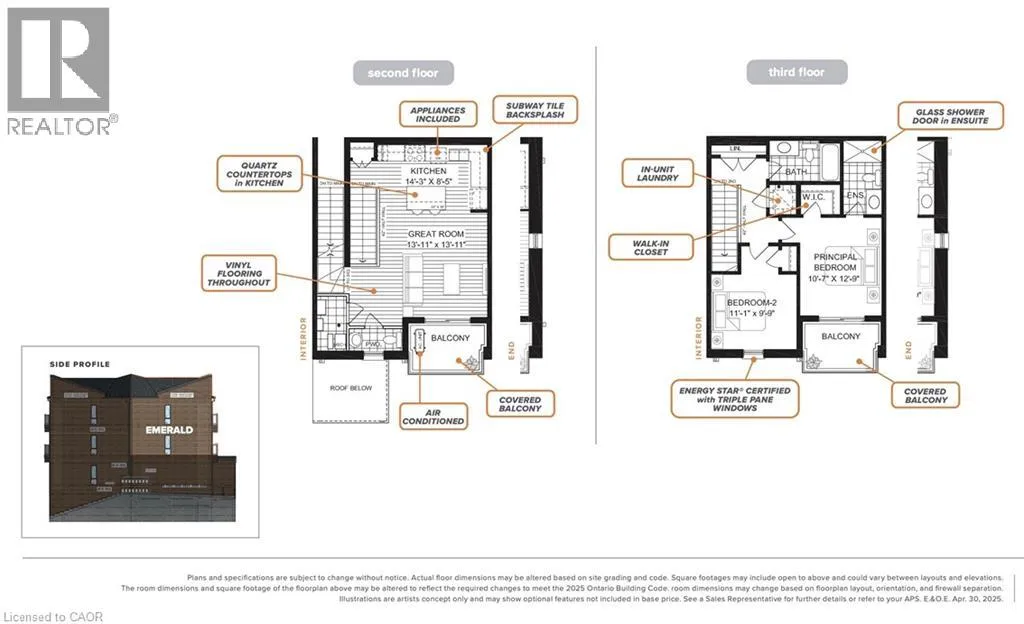 THE EMERALD, a 2 bed, 2.5 bath suite with high ceilings, premium finishes, and a bright open concept layout. The brand new kitchen boast quartz countertops, subway tile backsplash, full-size stainless steel appliances, and an oversized island with breakfast bar seating. Enjoy the convenience of in-suite laundry and central air conditioning/heat for year round comfort. Enjoy two private balconies—one off the living room and one off the master bedroom—offering the perfect spot to relax and unwind. Just steps away, Trussler Woods features peaceful trails—perfect for walking, jogging, and enjoying the outdoors. EV chargers and visitor parking available. Pet-friendly community. Located in a designated school bus zone, offering added convenience for families. Enjoy quick access to Highways 7/8 and 401. Actual units may vary in layout; interior finishes are consistent. Some photos may be virtually staged or taken from the model suite. Tenants pay utilities. Landlord is responsible for furnace filter replacements and water softener maintenance. Book a tour to explore all available layouts! (id:62650)