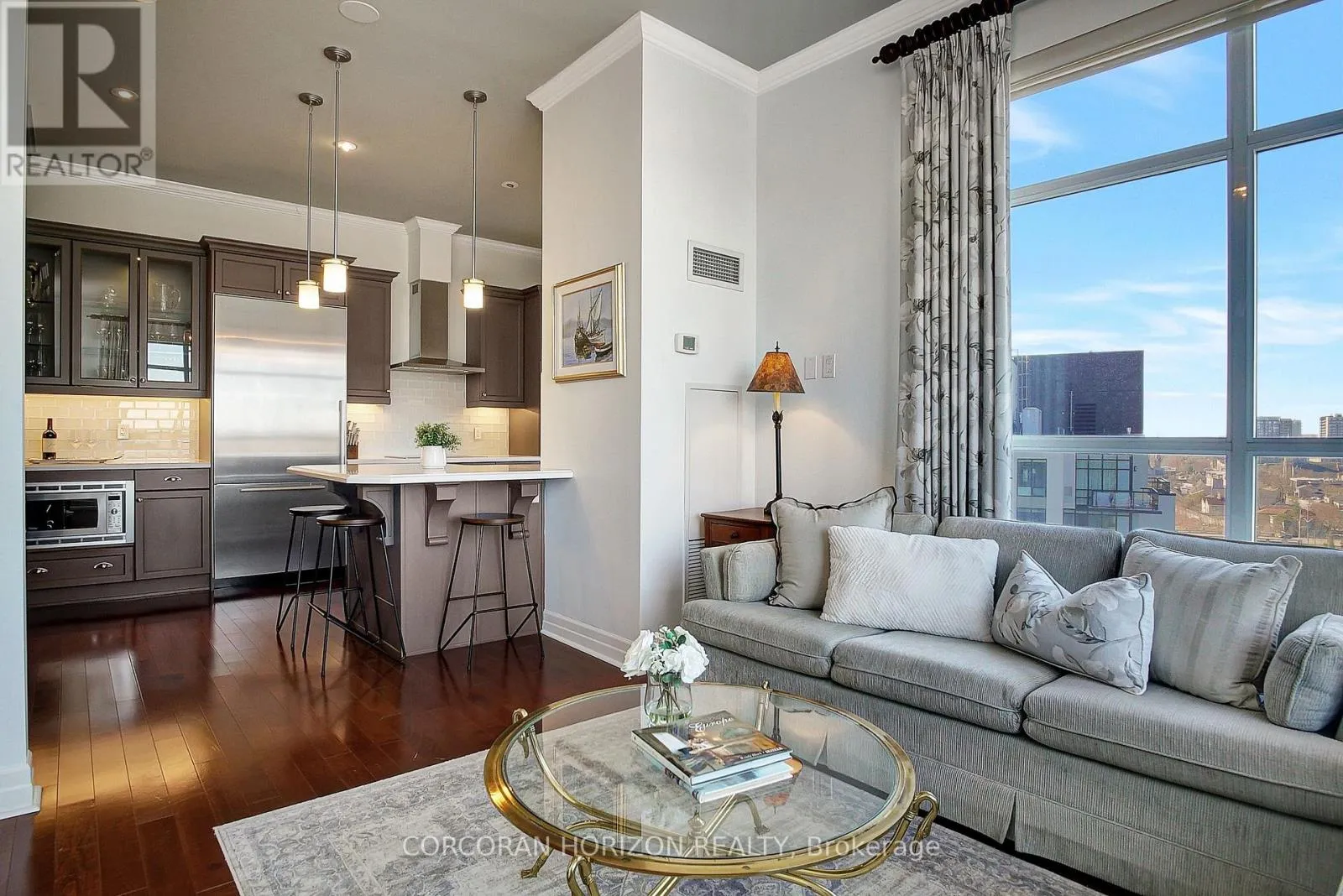 This One-of-a-Kind Luxury Penthouse was custom designed to create nearly 3,000 sq. ft. of refined living space, offering the perfect blend of elegance, comfort, and Panoramic River Views. Every window frames a breathtaking view of the river, and a full-length terrace with multiple walkouts provides a front-row seat to spectacular sunsets. The expansive and light-filled living room features a gas