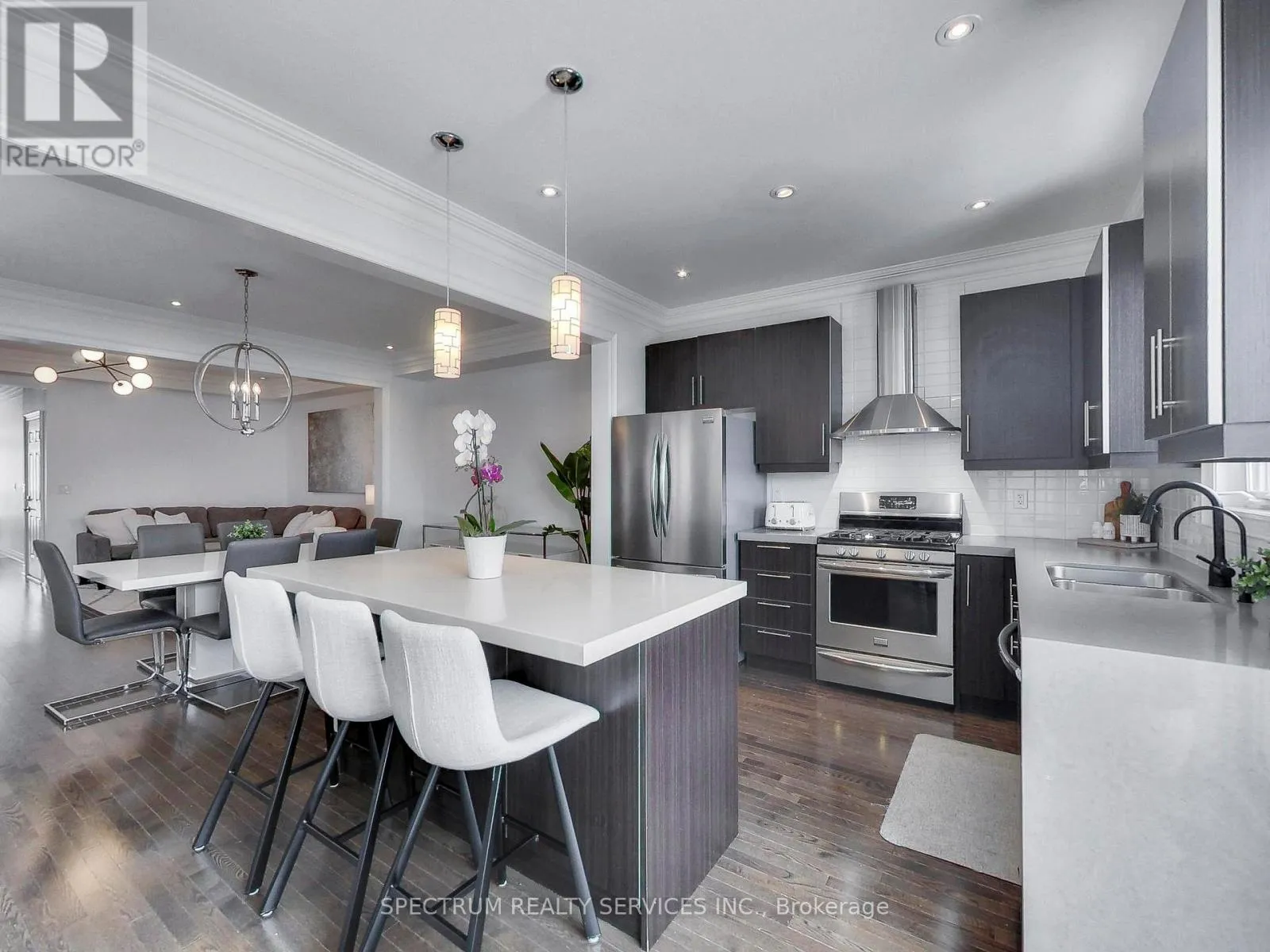 Absolutely stunning, end unit, link townhome in the heart of Vellore Village. This 3 bedroom,3.5 bathroom open-concept home offers 9 foot ceilings on main, potlights throughout, crown moulding, wrought iron pickets, finished basement, garage access, and a crisp, contemporary setting with quality finishes and details. Spacious kitchen boasts stainless steel appliances, gas range, water filtration system, backsplash, waterfall quartz countertops,